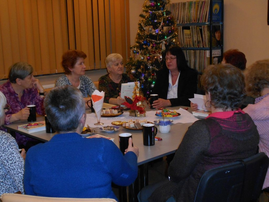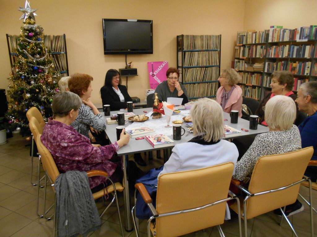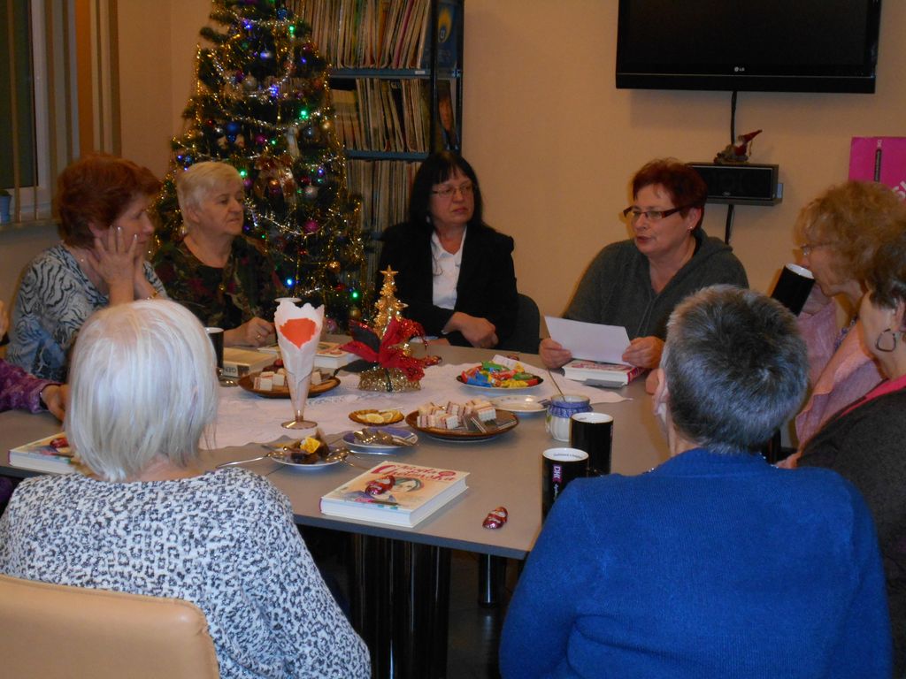W grudniowym spotkaniu DKK w Filii nr 1 MBP w Tarnobrzegu, który miał miejsce 12.12.2016 r. uczestniczyło 10 pań. W miłej przedświątecznej atmosferze czas upłynął w kręgu rozważań o znanej i cenionej autorce książek, wierszy, piosenek, sztuk teatralnych, kabaretów i słuchowisk, Wandzie Chotomskiej. Klubowiczki szczególnie zaciekawiły barwnie opowiedziane historie z dzieciństwa i młodości poetki, anegdoty z życia prywatnego pełne humoru i dystansu do atmosfery PRL-u oraz mniej znane publikacje. Dużym plusem są zamieszczone zdjęcia i fragmenty wczesnej twórczości, pisane początkowo przez poetkę do szuflady. Przyjaźń z Białoszewskim i z Butenko - to również niezmiernie ciekawy wątek tej książki, wciąż żywy we wspomnieniach Wandy Chotomskiej.
