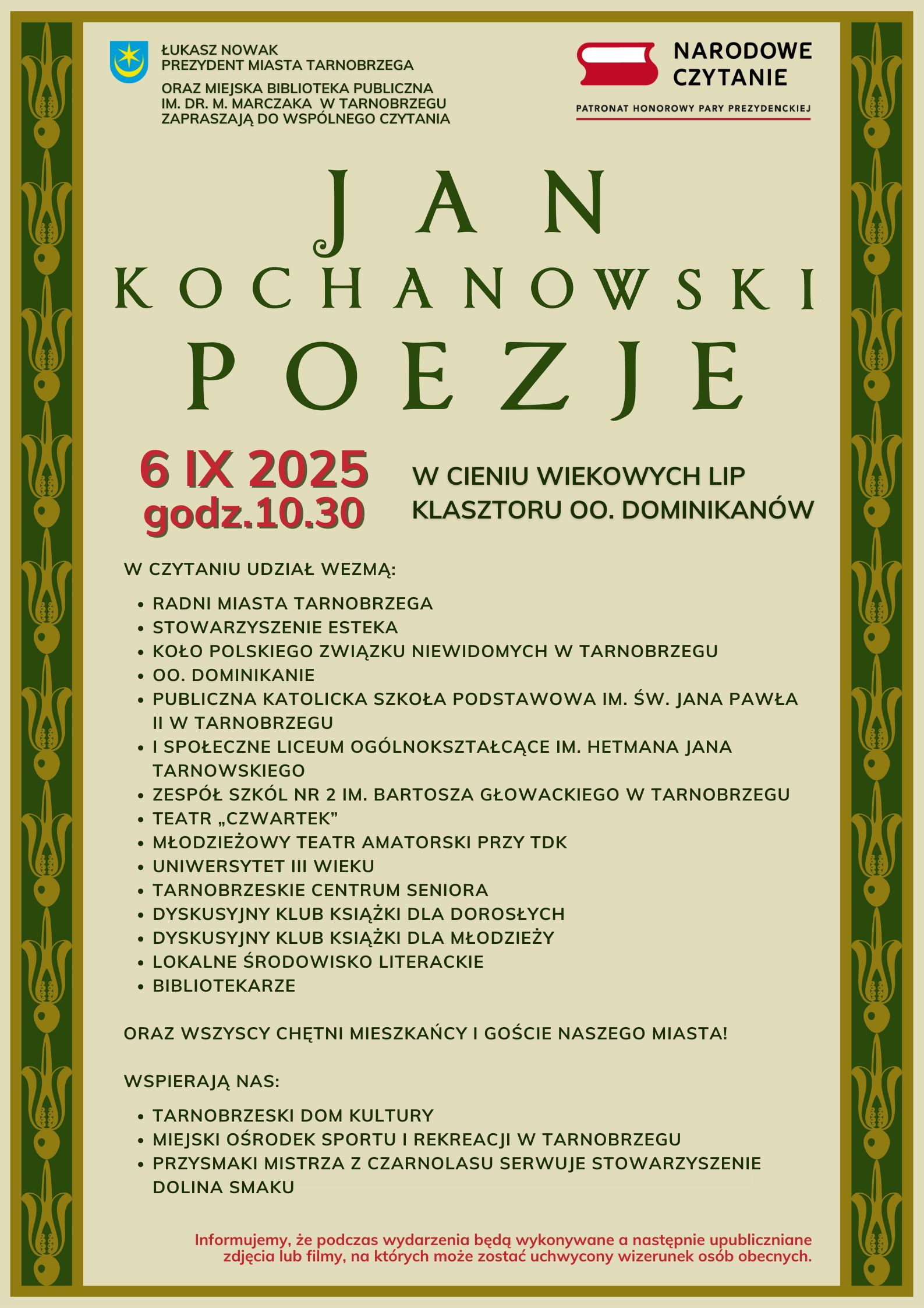 Podczas tarnobrzeskiej odsłony Narodowego Czytania – w cieniu wiekowych lip przy Klasztorze OO. Dominikanów w Tarnobrzegu – poezja Jana Kochanowskiego odrodziła się w interpretacji mieszkańców i gości naszego miasta. Pięknym wstępem do wspólnego czytania była muzyczna interpretacja utworów mistrza z Czarnolasu odtworzona z płyty Wandy Warskiej. Głośne czytanie rozpoczął o godz. 10.30 Łukasz Nowak Prezydent Miasta Tarnobrzega sztandarowym utworem Jana Kochanowskiego – fraszką „Na lipę”, która wprowadziła w poetycki klimat i stała się łącznikiem z otaczającą przyrodą. Następnie dzięki fraszce „Na Słownik Mączyńskiego”, którą przeczytała Monika Sadkowska Dyrektor Miejskiej Biblioteki Publicznej im. dr. M. Marczaka w Tarnobrzegu podkreślona została nieoceniona wartość książek.
