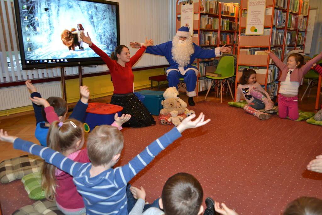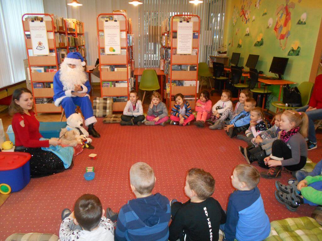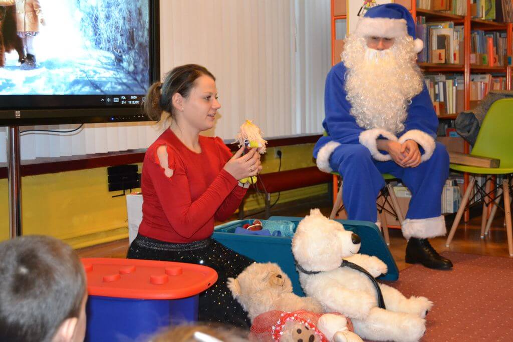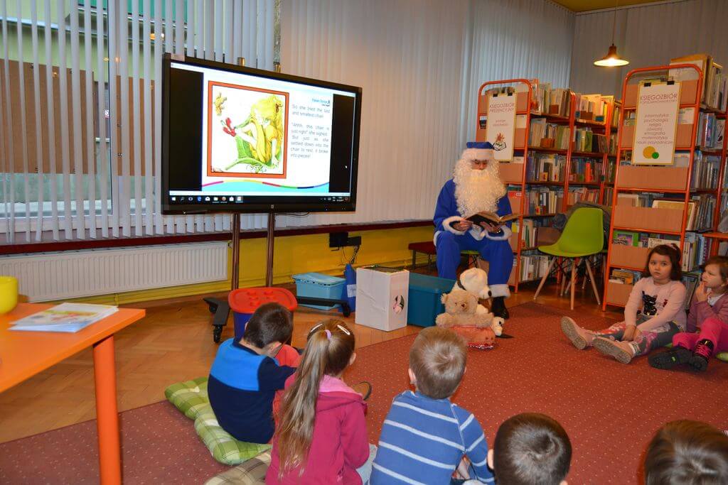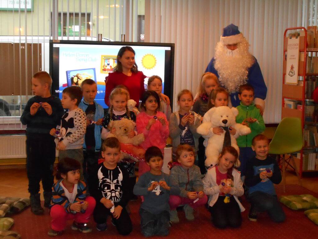 Na spotkanie z Niebieskim Mikołajem i pokazową lekcję języka angielskiego prowadzoną metodą Helen Doron, 19 i 20 grudnia, zaproszone zostały do Biblioteki Głównej 5 i 6- latki z Przedszkoli nr 2 i 5. Spotkanie okazało się wspaniałą przygodą. Przedszkolaki w zabawny i ciekawy sposób przyswoiły sobie łatwe słówka w języku angielskim, które następnie rozpoznały w czytanej przez Niebieskiego Mikołaja bajce o Trzech Misiach i Złotowłosej.