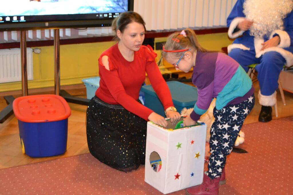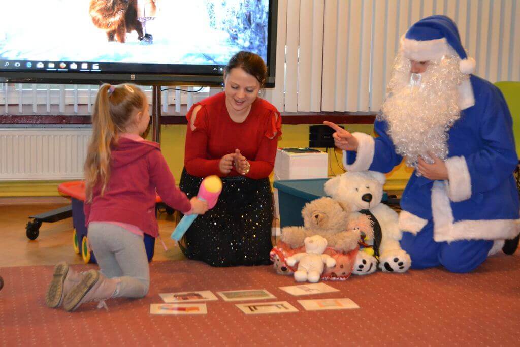 Trzy Misie pojawiły się również w śpiewanej w języku angielskim i tańczonej przez dzieci wspólnie z Mikołajem piosence. Atrakcjom przygotowanym przez szkołę Helen Doron nie było końca. Dzieci doskonale radziły sobie z nazywaniem wyciąganych z magicznego pudełka zabawek, określały poprawnie przeciwieństwa - „mały- duży , twardy –miękki , gorąco – zimno”. Było dużo śmiechu i dobrego humoru podczas przymierzania mikołajowej czapki czy budzenia Niebieskiego Mikołaja z drzemki .