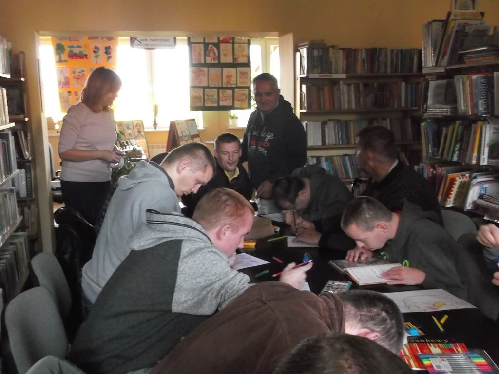Jak przystało na jesienne spotkanie czytelnicze w bibliotece, kierowniczka filii Beata Grabska przeczytała bajkę, pt. „ Rządy pani Jesieni”, po czym zaprosiła wszystkich do zaczarowanego drzewa, z którego można było zrywać kartonowe kolorowe liście kryjące zagadki o tematyce jesiennej. W programie zajęć były również jesienne kolorowanki, które pensjonariusze wykonali bardzo starannie.