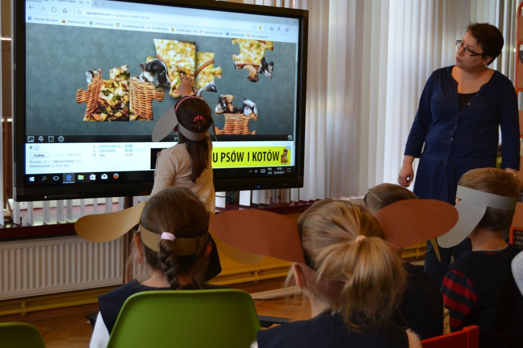 Na początku spotkania każde z dzieci założyło na głowę papierową opaskę z długimi uszami. Dzięki temu na chwilę zamieniło się w sympatycznego kundelka. Następnie cała grupa z zainteresowaniem wysłuchała rozdziału z książki „Pięciopsiaczki” Wandy Chotomskiej, po czym chętnie uczestniczyła w rozmowie o przygodach psich bohaterów. Rozwiązywanie quizów na temat różnych ras czworonożnych przyjaciół, układanie puzzli przedstawiających kundelki oraz rozpoznawanie postaci z bajek to kolejne zadania, z których pierwszoklasiści wywiązali się świetnie. Nie zapomnieli również o najsłynniejszym polskim kundelku - Reksiu. Na koniec spotkania wszyscy otrzymali śmieszną naklejkę przypominającą o tym ważnym dniu dla wszystkich psiaków.