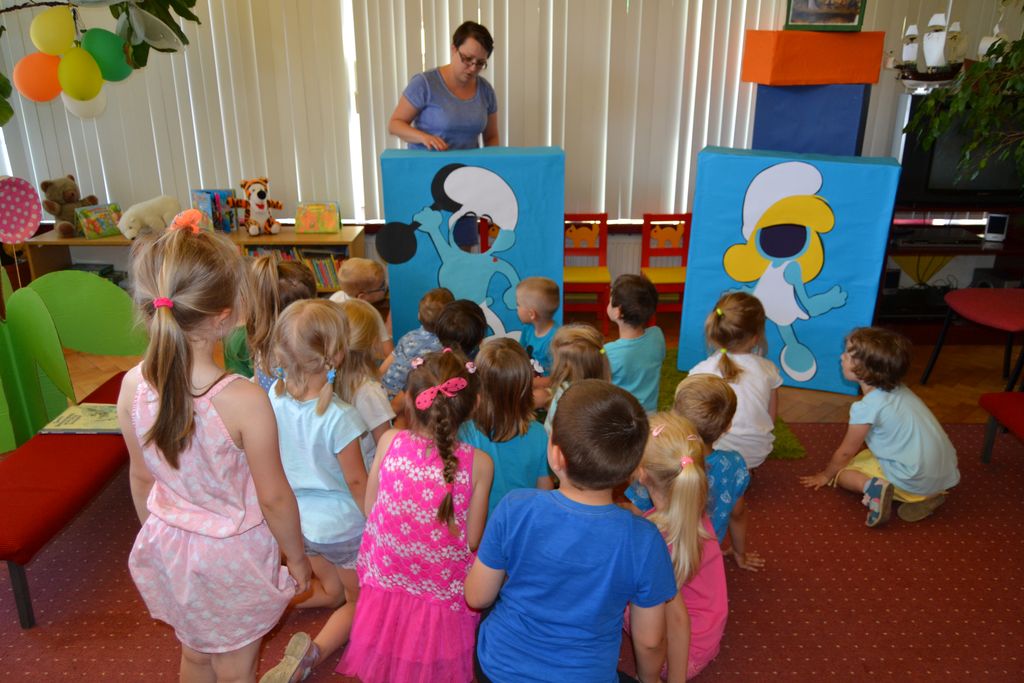 Dzieci wysłuchały wesołej bajki o przygodach Smerfa Marudy, odgadywały smerfne zagadki i opowiadały o swoich ulubionych niebieskich stworkach.Dzień ten był również okazją do zrobienia pamiątkowych zdjęć. Na chwilę każdy chłopiec stał się silnym Osiłkiem, a dziewczynka uroczą, uśmiechniętą Smerfetką. Kolejną niespodzianką w wiosce niebieskich przyjaciół było pasowanie na Smerfa. Każde z dzieci otrzymało z tej okazji białą smerfną, papierową czapkę i mogło skosztować biało-niebieskich słodkich pianek w kształcie Smerfów. To niecodzienne spotkanie dostarczyło wiele radości i uśmiechu wszystkim małym smerfnym przedszkolakom