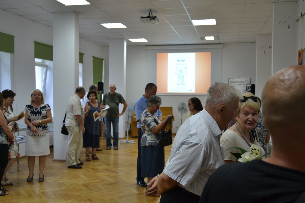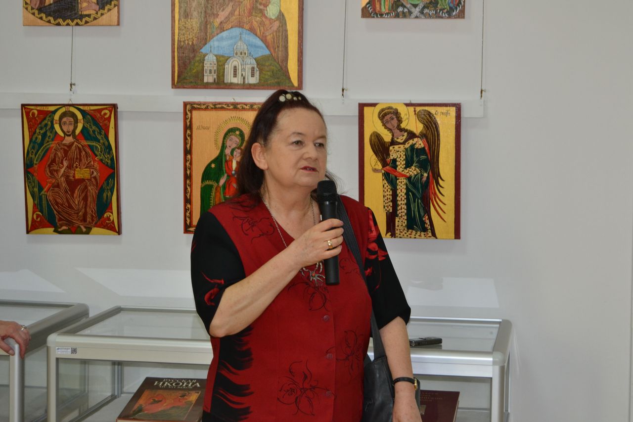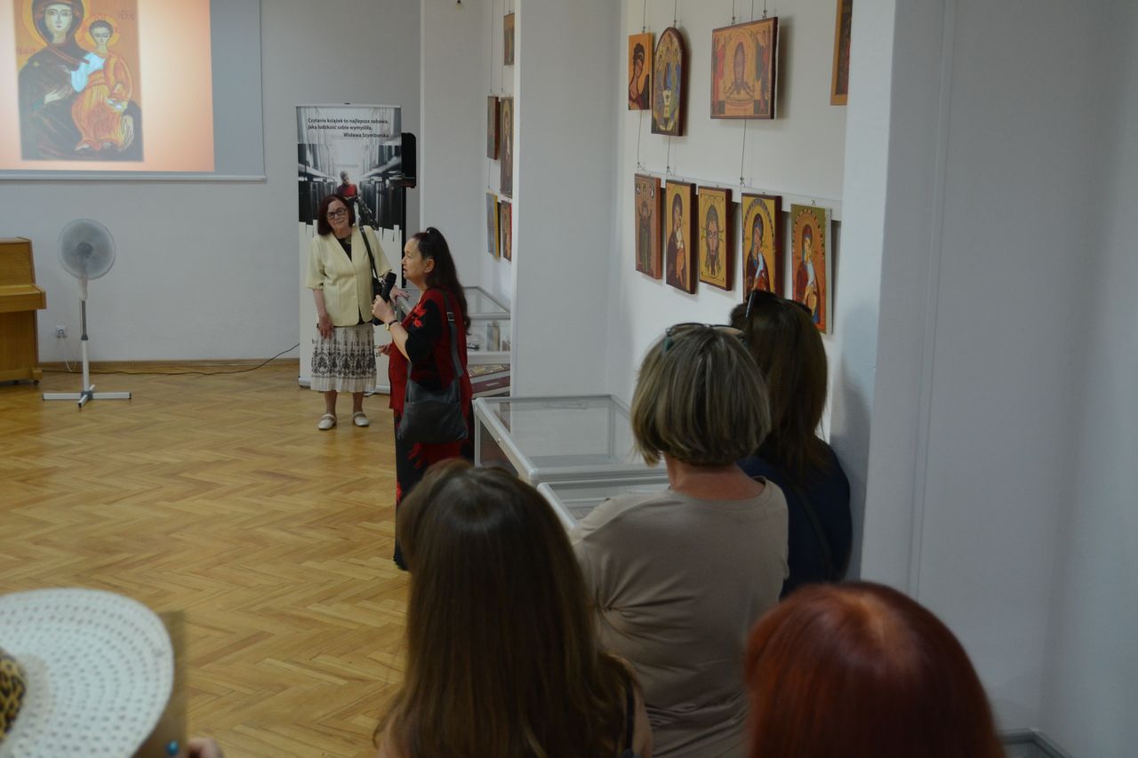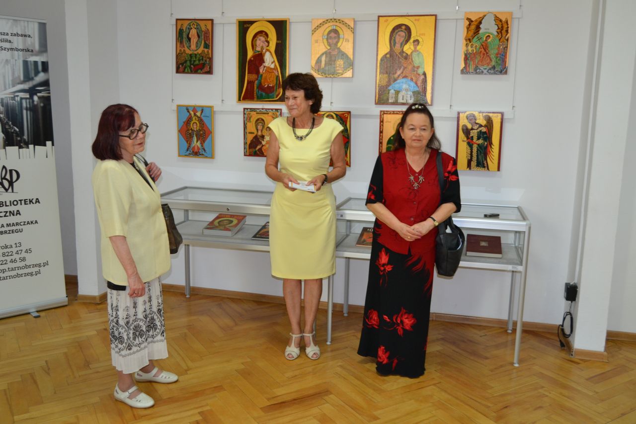 Swoje ikony „pisze” od przeszło dziesięciu lat. Zawsze w oparciu o oryginały, ze szczególna dbałością o zgodność z tradycyjnymi kanonami i dociekliwością w odkrywaniu symboliki przesłań teologicznych (biblijnych bądź hagiograficznych). W swoich pracach nie stroni wszakże od subtelnej, osobistej ich interpretacji. Pracę nad wybraną ikoną poprzedza wnikliwymi studiami literatury przedmiotu, tematycznych albumów, stosownych fragmentów Biblii czy legend o świętych. Wśród prac, które autorka prezentuje na wystawie w Miejskiej Bibliotece Publicznej im. dr. Michała Marczaka w Tarnobrzegu oprócz wyobrażeń Świętych, scen rodzajowych opisujących życie i śmierć Jezusa Chrystusa, najczęściej pojawiającym się motywem jest wizerunek Matki Bożej Czułej i Matki Bożej Przewodniczki. Całość ekspozycji uzupełnia literatura dotycząca tematu. Wernisaż wystawy „Ikony Marii Topolewicz”, który odbył się 20 sierpnia 2018 r. zgromadził wielu gości, wśród których byli przyjaciele i znajomi artystki jak i tych, których ikony urzekają swoim pięknem, tajemnicą, blaskiem złota i ciepłem koloru. O samej autorce, jej zainteresowaniach i pasji tworzenia opowiedziała dr Anna Niewolak. Natomiast sama autorka zabrała publiczność w świat swojej twórczości szczegółowo omawiając większość prezentowanych prac, przytaczając historie ich powstania oraz legendy z nimi związane.