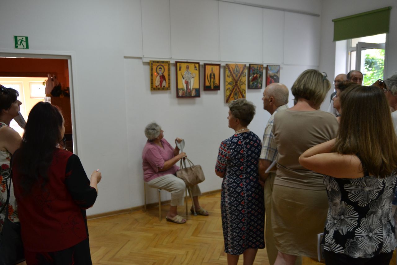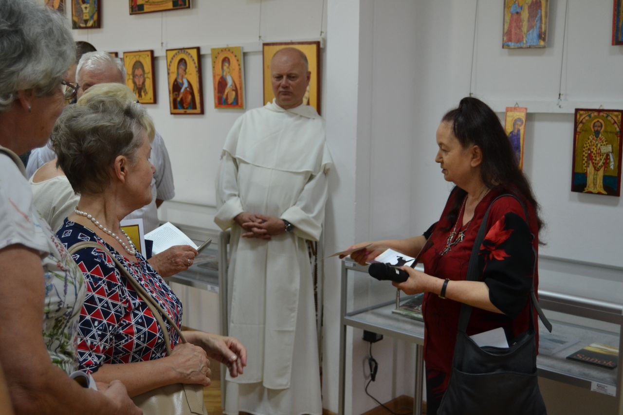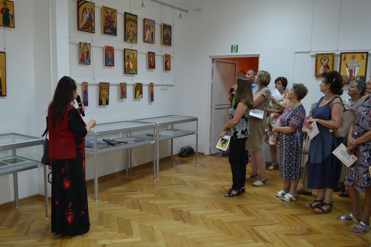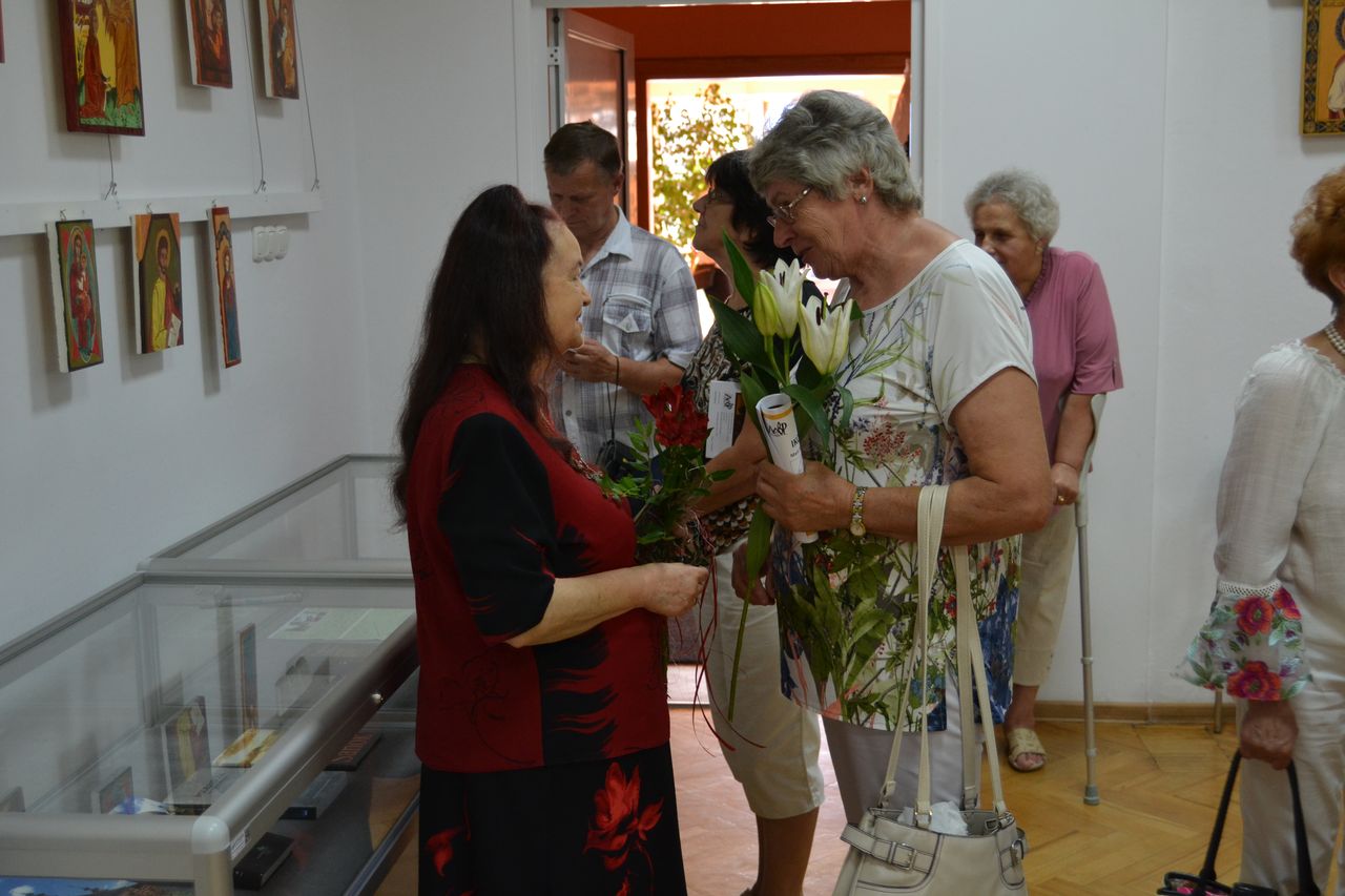 Swoje ikony „pisze” od przeszło dziesięciu lat. Zawsze w oparciu o oryginały, ze szczególna dbałością o zgodność z tradycyjnymi kanonami i dociekliwością w odkrywaniu symboliki przesłań teologicznych (biblijnych bądź hagiograficznych). W swoich pracach nie stroni wszakże od subtelnej, osobistej ich interpretacji. Pracę nad wybraną ikoną poprzedza wnikliwymi studiami literatury przedmiotu, tematycznych albumów, stosownych fragmentów Biblii czy legend o świętych. Wśród prac, które autorka prezentuje na wystawie w Miejskiej Bibliotece Publicznej im. dr. Michała Marczaka w Tarnobrzegu oprócz wyobrażeń Świętych, scen rodzajowych opisujących życie i śmierć Jezusa Chrystusa, najczęściej pojawiającym się motywem jest wizerunek Matki Bożej Czułej i Matki Bożej Przewodniczki. Całość ekspozycji uzupełnia literatura dotycząca tematu. Wernisaż wystawy „Ikony Marii Topolewicz”, który odbył się 20 sierpnia 2018 r. zgromadził wielu gości, wśród których byli przyjaciele i znajomi artystki jak i tych, których ikony urzekają swoim pięknem, tajemnicą, blaskiem złota i ciepłem koloru. O samej autorce, jej zainteresowaniach i pasji tworzenia opowiedziała dr Anna Niewolak. Natomiast sama autorka zabrała publiczność w świat swojej twórczości szczegółowo omawiając większość prezentowanych prac, przytaczając historie ich powstania oraz legendy z nimi związane.