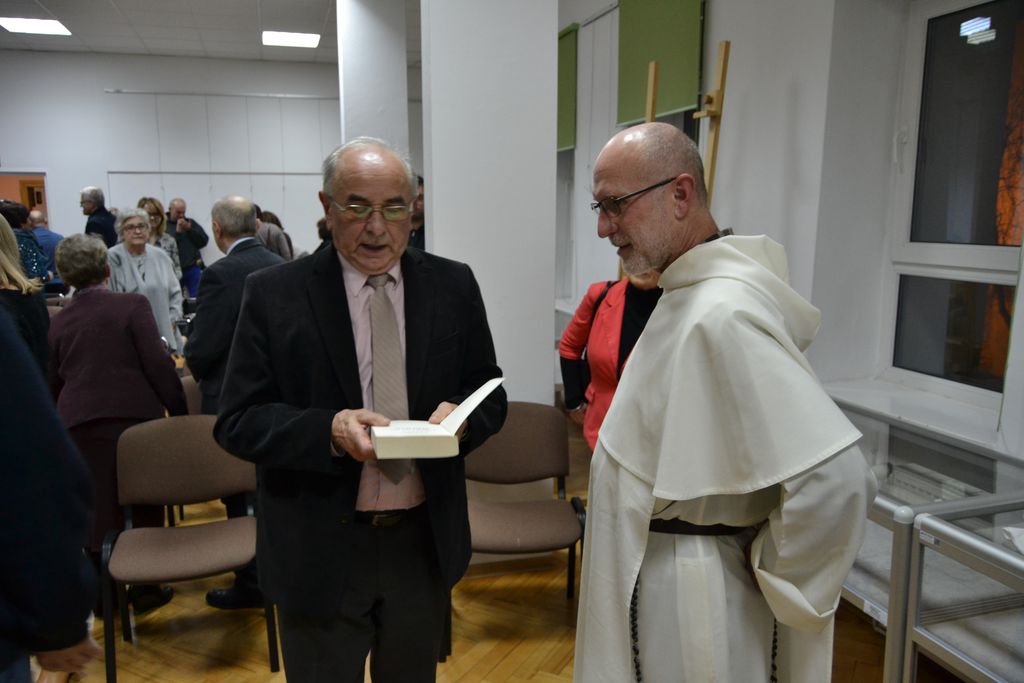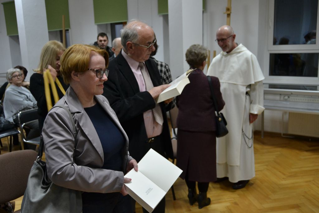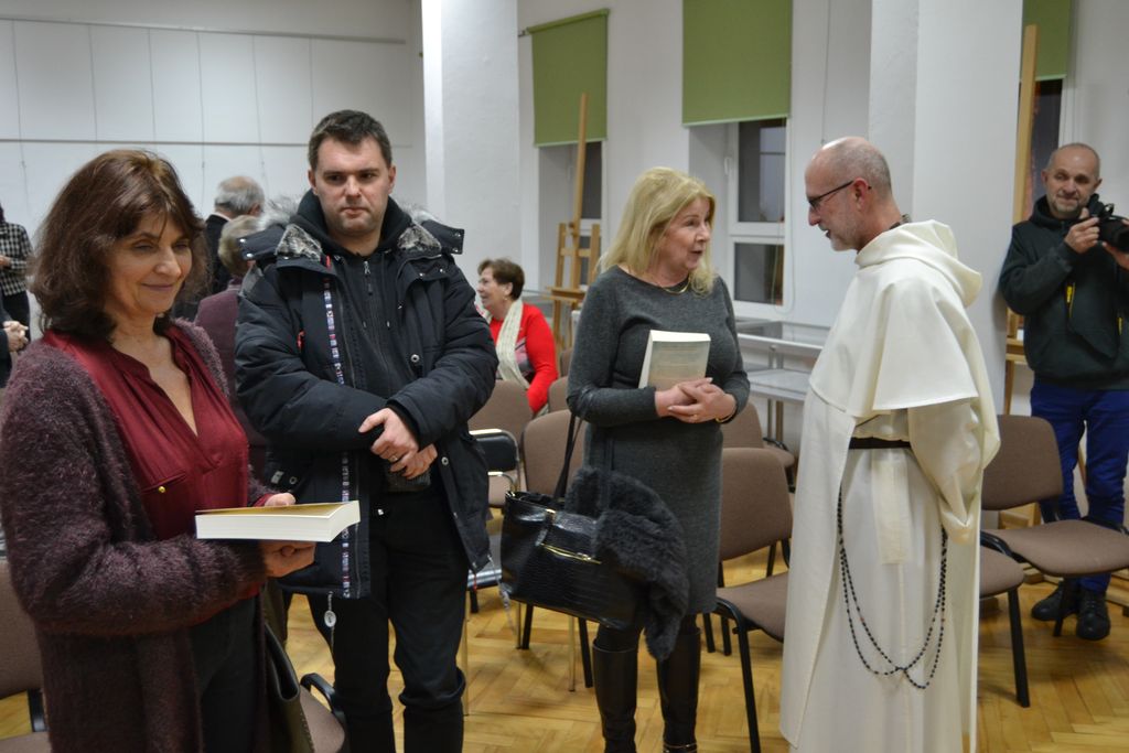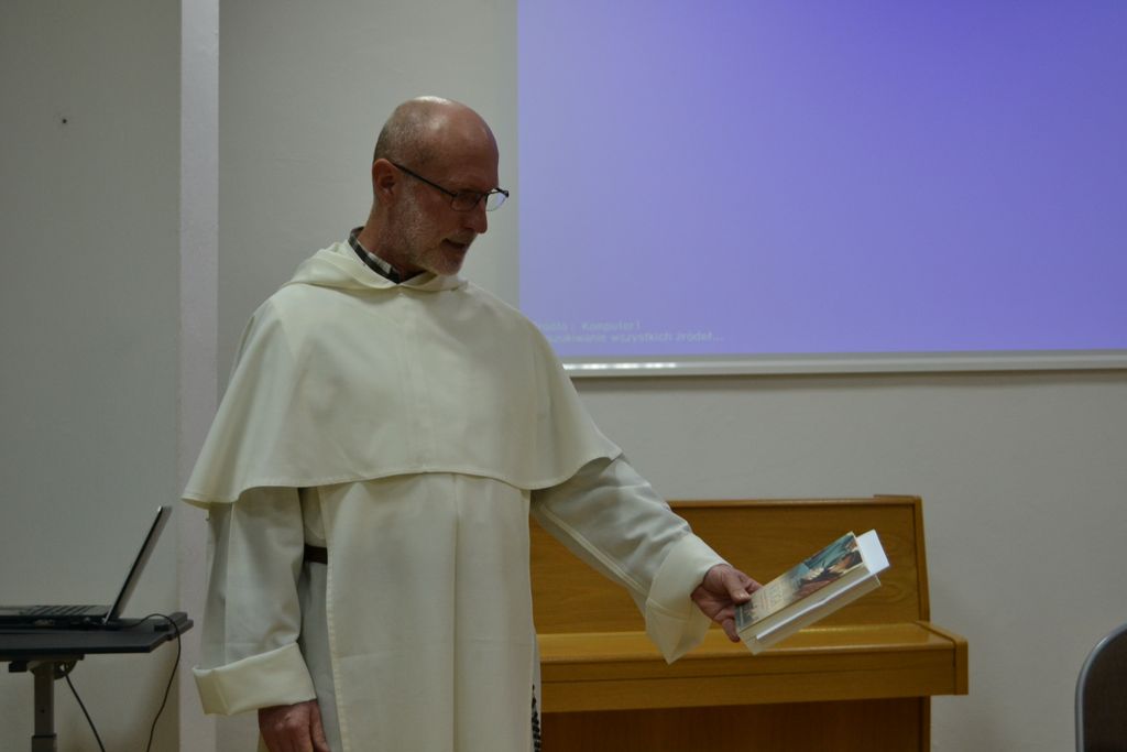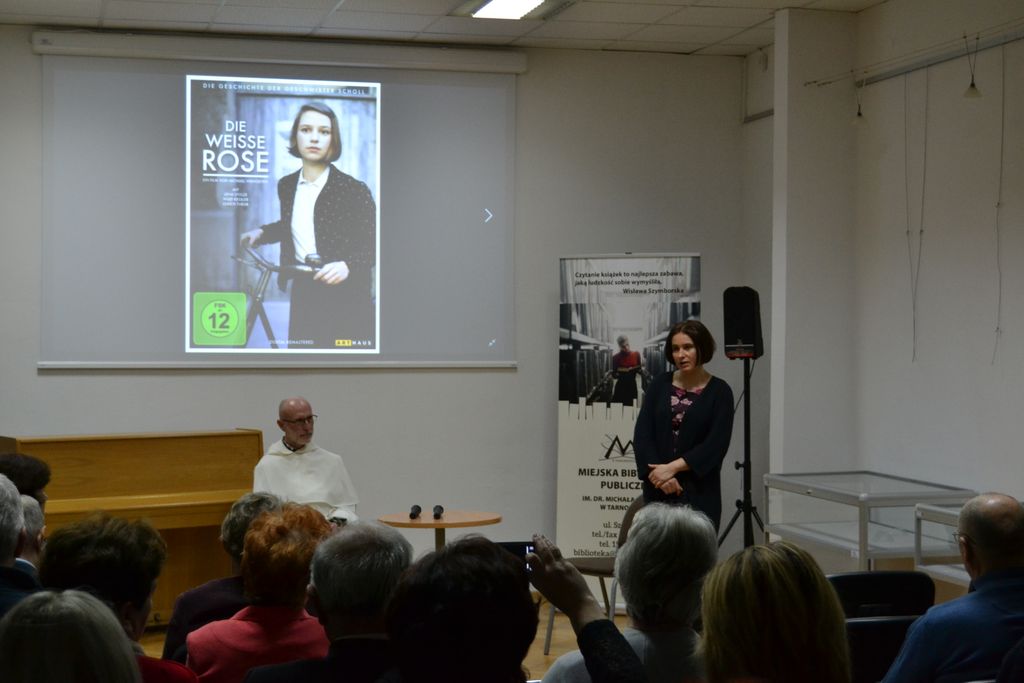 Rozpoczynając spotkanie powiedział: Czytałem "Pokochałam wroga" z wypiekami na twarzy. Wędrowałem z bohaterami powieści po ulicach Krakowa i Monachium, dwóch miast, które są mi bardzo bliskie. Tym bardziej, że w niej została wspomniana antynazistowska organizacja o orientacji chrześcijańskiej, Biała Róża. W Monachium na dziedzińcu Uniwersytetu Ludwiga Maximiliana znajduje się niecodzienny memoriał z ulotki upamiętniający jej działalność. Swoją wypowiedź o. Maciej wzbogacił prezentacją archiwalnych zdjęć i kadrów z filmu. Zwrócił również uwagę na to, że dylematy moralne przedstawione w sadze autorka pozostawia do oceny czytelnikom.