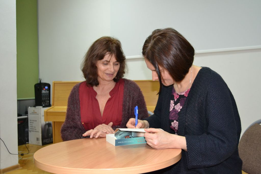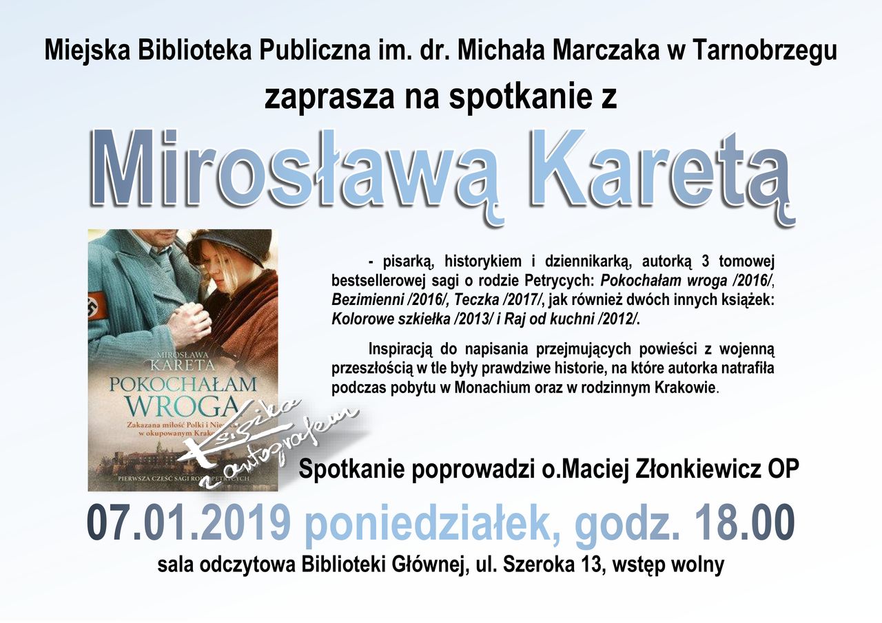 Mirosława Kareta, autorka 3 tomowej, bestsellerowej sagi o rodzie Petrycych: Pokochałam wroga /2016/, Bezimienni/2016/, Teczka/2017/ oraz dwóch powieści Kolorowe szkiełka /2013/ i Raj od kuchni/2012/, 7 stycznia 2019 roku gościła w Miejskiej Bibliotece Publicznej im. dr. Michała Marczaka w Tarnobrzegu.