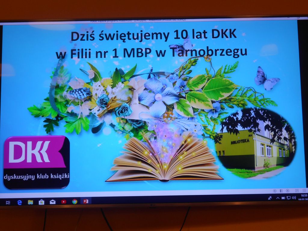 Dyskusyjny Klub Książki działający w Filii nr 1 w Tarnobrzegu 18.03.2019 roku obchodził dziesięciolecie swojego istnienia. Powstał w styczniu 2009 roku w ramach realizowanego przez Instytut Książki ogólnopolskiego programu promocji czytelnictwa "Tu Czytamy" przy współpracy z British Council. Na przestrzeni minionych dziesięciu lat odbyło się 95 spotkań DKK. Moderatorkami Klubu były kolejno panie: Monika Sadkowska, Zofia Madej, obecnie prowadzącą jest Anna Pałys. Przez ten czas 25 osób brało czynny udział w klubowych spotkaniach.