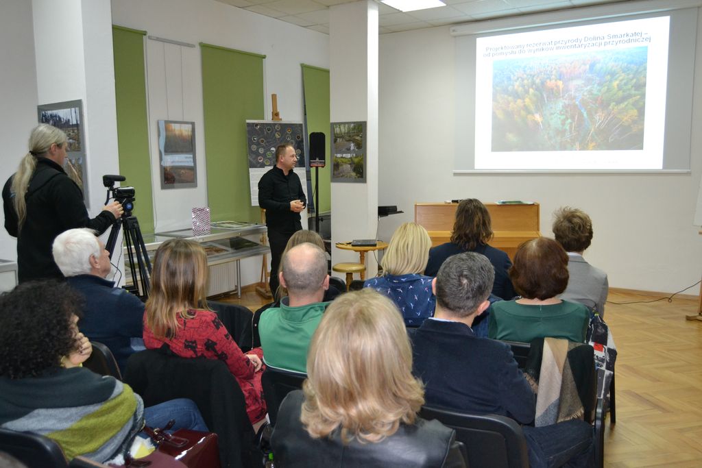 O walorach przyrodniczych doliny Smarkatej płynącej na pograniczu gmin Majdan Królewski i Cmolas, jak również o projekcie utworzenia na tym obszarze rezerwatu przyrody mówił prowadzący spotkanie Janusz Wepsięć. „Opracowany przez nas, czyli Podkarpackie Towarzystwo Przyrodników Wolne Rzeki, projekt Rezerwat Doliny Smarkatej ma objąć obszar 198 hektarów i przebiegać na odcinku rzeki o długości 7 km, który zachował całkowicie naturalny, nienaruszony ludzką ręką charakter. Położony jest on w Puszczy Sandomierskiej i jeśli się nam uda przeforsować nasze przedsięwzięcie, będzie on jednym z paru innych rezerwatów na tym terenie. Niestety w obrębie puszczy rezerwaty przyrody obejmują zaledwie 0,8 procent jej powierzchni, czyli prawie tyle co nic, a jest to niezwykle istotny kompleks leśny, choćby i z uwagi na znaczenie historyczne.” Ujawnił również pochodzenie nazwy rzeki, którą poznał… jak przyznał z uśmiechem , dopiero dzień przed spotkaniem mówiąc: zadzwoniła do nas mieszkanka Durdów, wsi położonej blisko rzeczki, mówiąc, że usłyszała w radio informację o spotkaniu w tarnobrzeskiej bibliotece poświęconemu Smarkatej i chciała wyjaśnić, skąd wzięła się tak niecodzienna nazwa. Otóż woda w rzece, nawet w letnią upalną pogodę, jest bardzo zimna, co powodowało u kapiących się w niej dzieci przeziębienia. I tak od katarów zwolenników zimnych kąpieli zyskała miano Smarkatej. Uczestnicy spotkania obejrzeli również prezentacją multimedialną, przygotowaną specjalnie na to spotkanie.