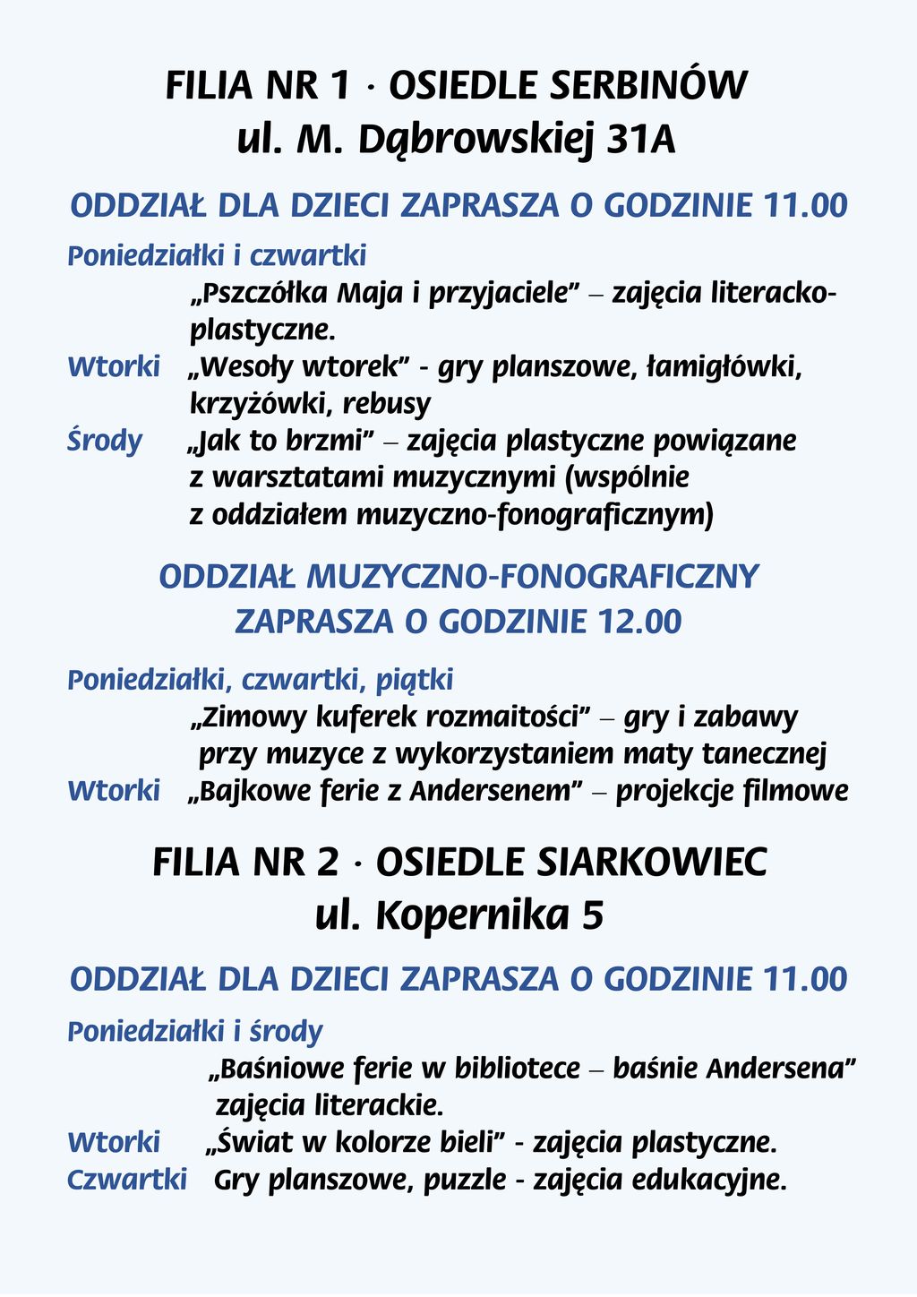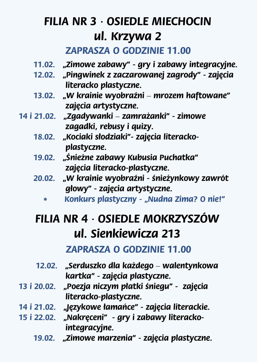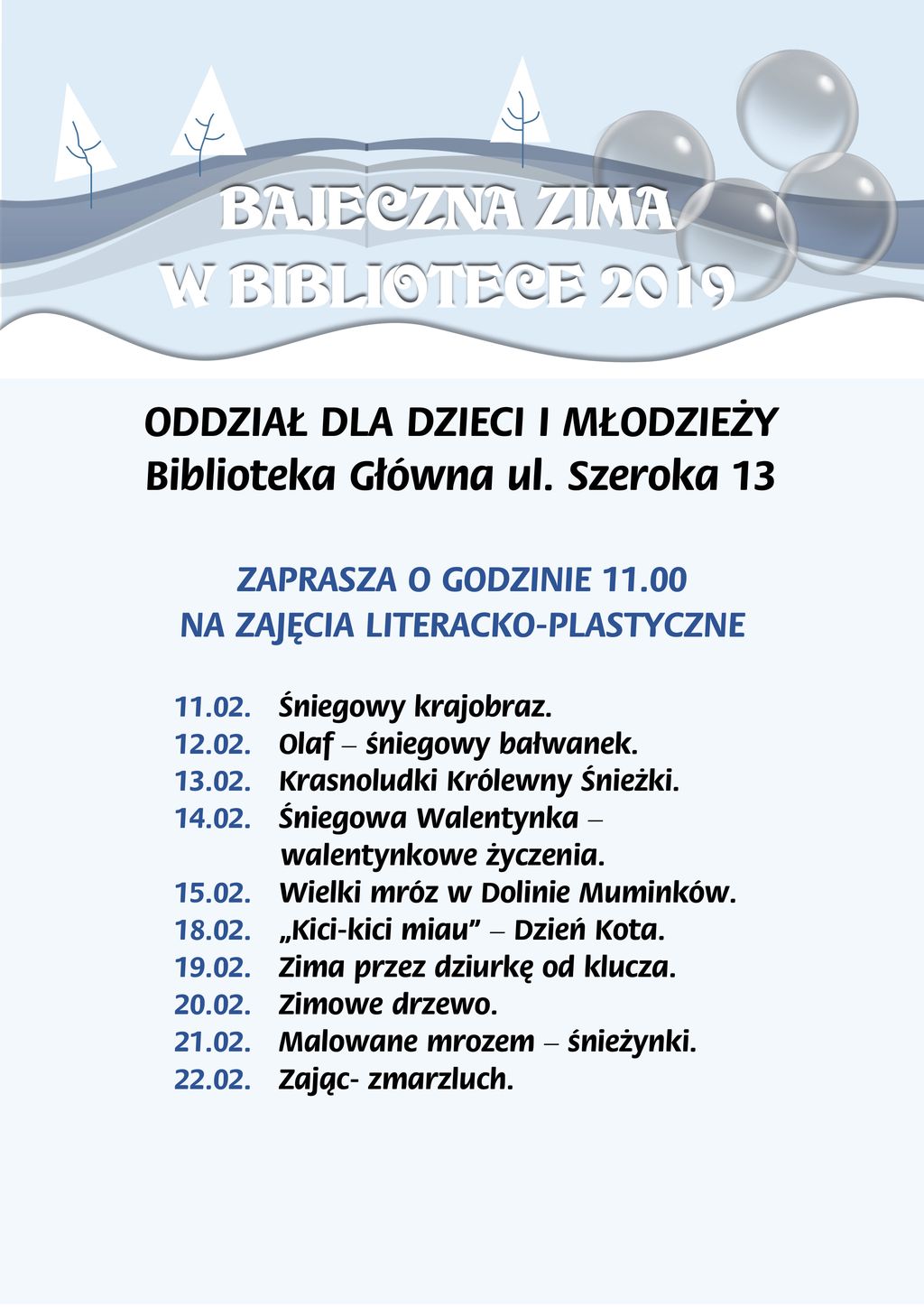 Miejska Biblioteka Publiczna im. dr. Michała Marczaka w Tarnobrzegu zaprasza dzieci i młodzież do udziału w różnorodnych zajęciach przygotowanych w ramach akcji „Zima w mieście 2019”. Zabawy literackie, zajęcia plastyczne, turnieje gier planszowych, kalambury, zagadki, rebusy, quizy czy projekcje filmów pomogą najmłodszym spędzić czas wolny od nauki w sposób atrakcyjny i przyjemny. Zapraszamy !