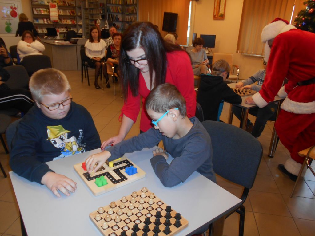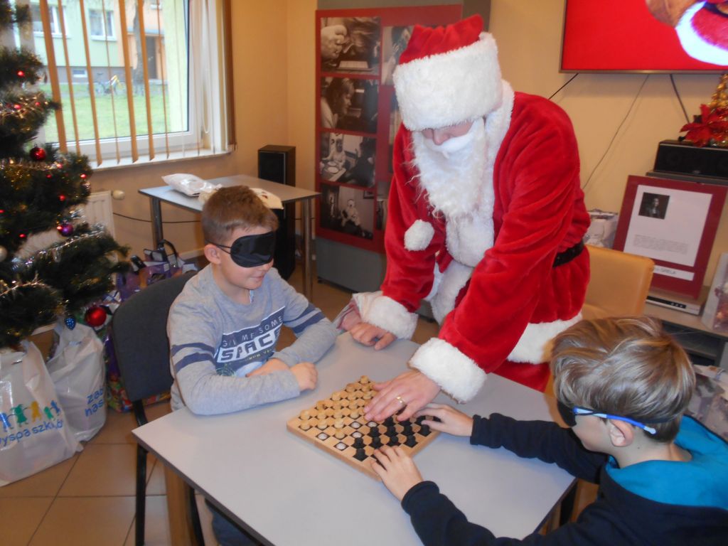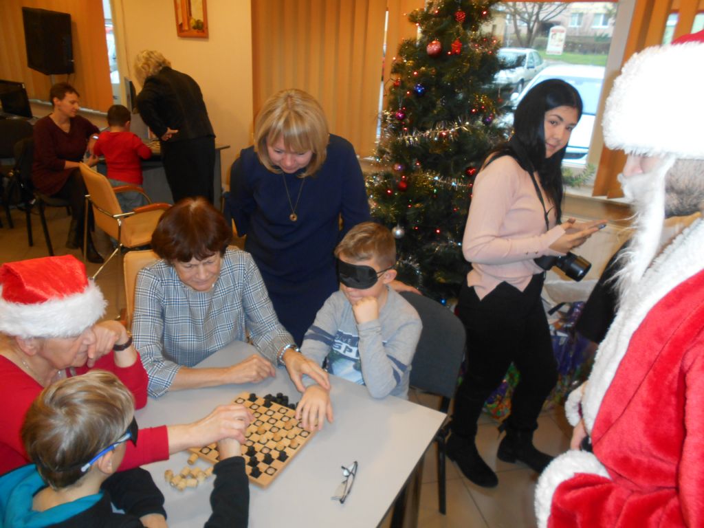 Uczestnicy spotkania wzięli udział w grach stolikowych, między innymi grano w warcaby i chińczyka w wersji dla niewidomych. W rozgrywkach, dzieci dzielnie wspierały osoby dorosłe. Po emocjach związanych z grami, nadszedł czas na prezenty. Mikołaj obdarował nimi nie tylko dzieci ale również zaproszonych gości. Dodatkową atrakcją były wspólne zdjęcia ze Św. Mikołajem.