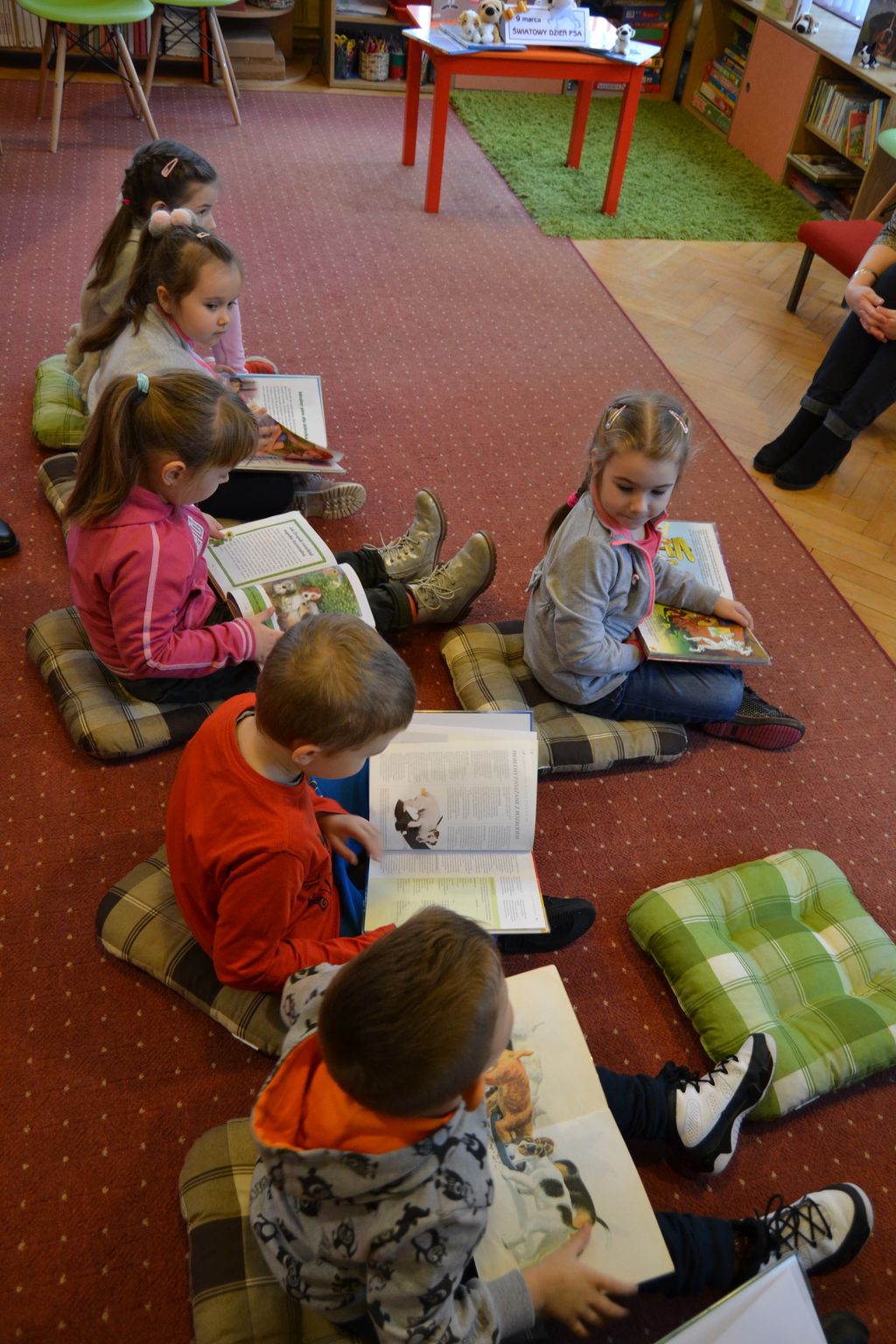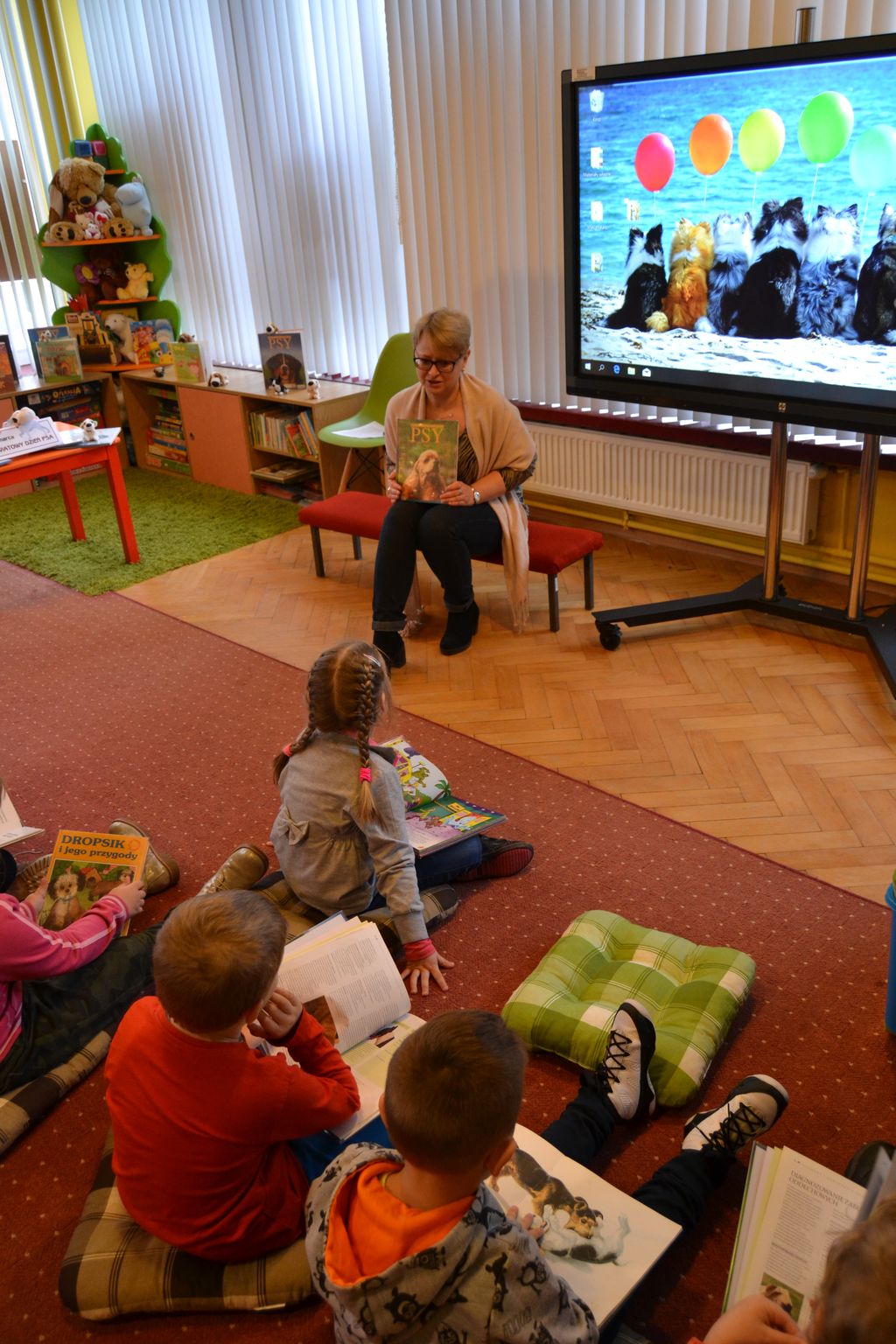 Dzieci wysłuchały zabawnego wiersza Małgorzaty Strzałkowskiej pt. „Pies”, odgadywały imiona psich literackich bohaterów. Z przygotowanych na monitorze interaktywnym zdjęć, dowiedziały się, jak wykorzystywane są różne umiejętności psów. Okazało się , że to jedno z najbardziej zapracowanych zwierząt służących człowiekowi. Specjalnie wyszkolone psy pracują jako ratownicy na lądzie i w wodzie, łapią przestępców, są przewodnikami, żołnierzami – słowem – mają pełne łapy roboty.O zaletach czworonożnych przyjaciół dzieci mogły się również dowiedzieć z zaprezentowanych przez bibliotekarki książeczek.