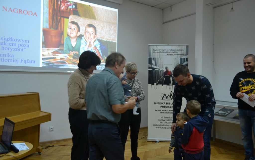 I miejsce – Mariusz Dyszlewski za zdjęcia zatytułowane „Relax” i „Na dobranoc”, II miejsce – Krystyna Pałys za zdjęcia zatytułowane „Rozgrzewka przed wyzwaniem”, Czelendż w sepii”, III miejsce – Dominika i Bartłomiej Fąfara za cykl zdjęć pod tytułem „Książkowym statkiem poza horyzonty” oraz wyróżnienia – Dorocie Witas za zdjęcie pod tytułem „Nic mi więcej nie potrzeba” i Mikołajowi Gwoździowskiemu za zdjęcie „Per libro ad astra”. Po części oficjalnej Bogdan Myśliwiec, znany tarnobrzeski fotograf i fotoreporter, laureat wielu nagród w konkursach fotograficznych organizowanych w kraju i za granicą, uczestnik wypraw podróżniczo-fotograficznych organizowanych przez stowarzyszenie „Pakuj Plecak”, twórca i współtwórca wielu wystaw a także autor wydawnictw albumowych opowiedział o swojej pracy i pasji jaką jest fotografia. Jako fotoreporter Echa Dnia i Super Nowości uczestniczył w wielu zabawnych sytuacjach, zbiegach okoliczności i…. niefortunnych zdarzeniach, które nie zawsze miały dobre zakończenie. Zaprezentował również fotografie, które wywoływały wśród słuchaczy duże rozbawienie. Ostatnim elementem spotkania była prezentacja kilkunastu unikatowych fotografii z Meksyku.
