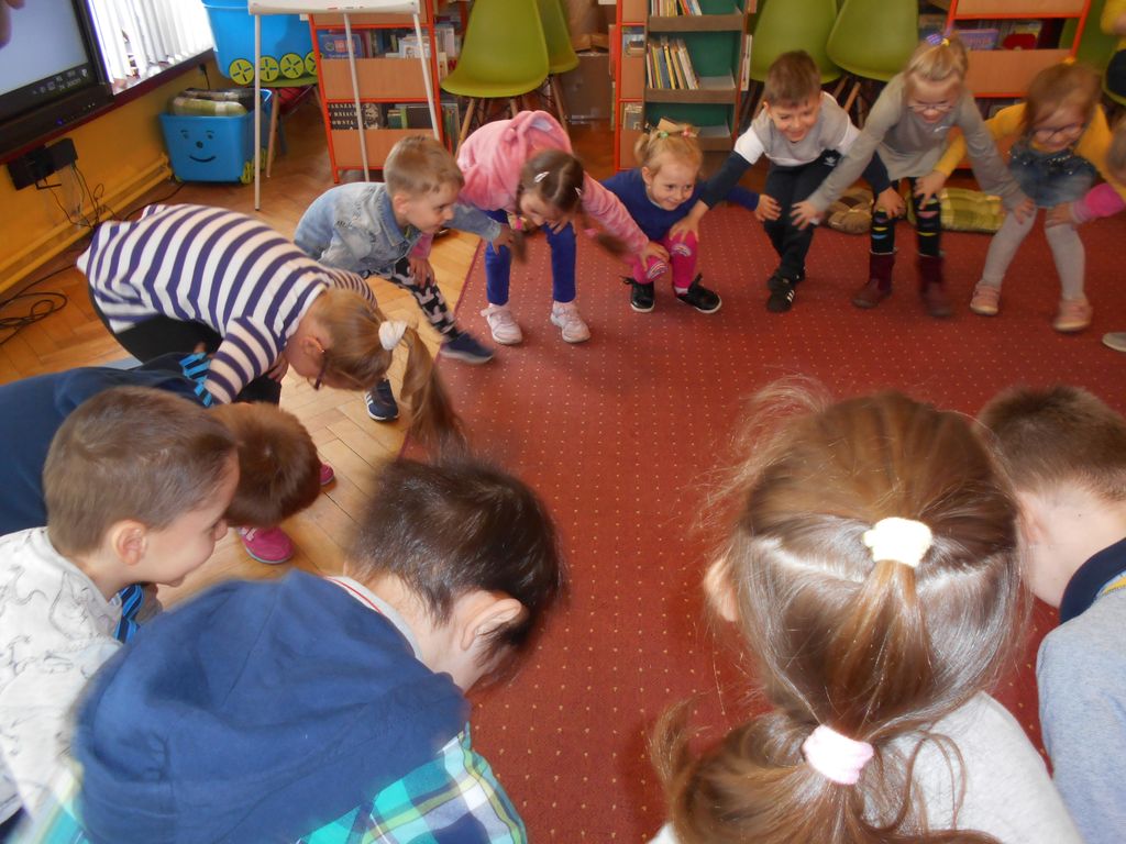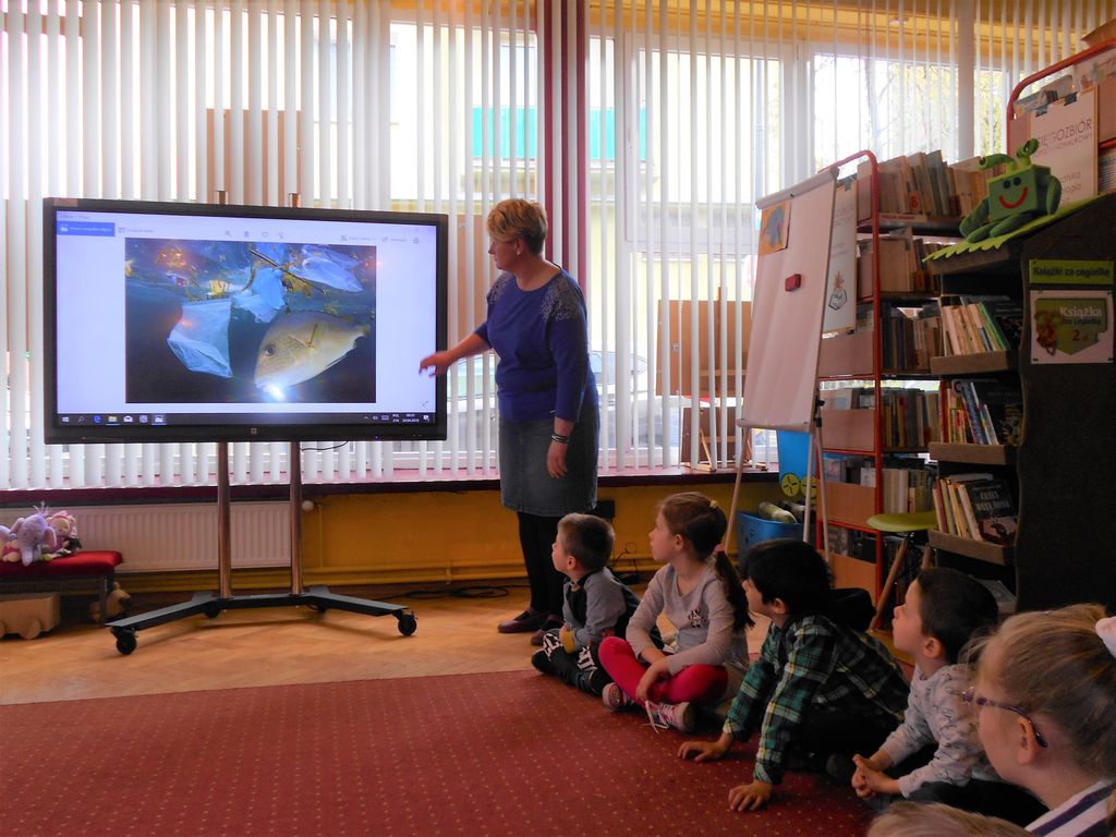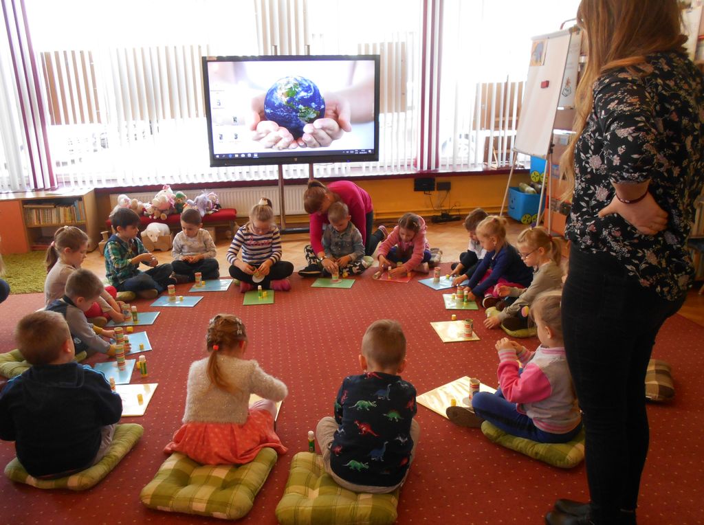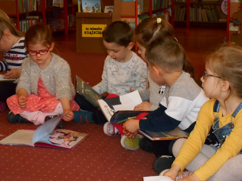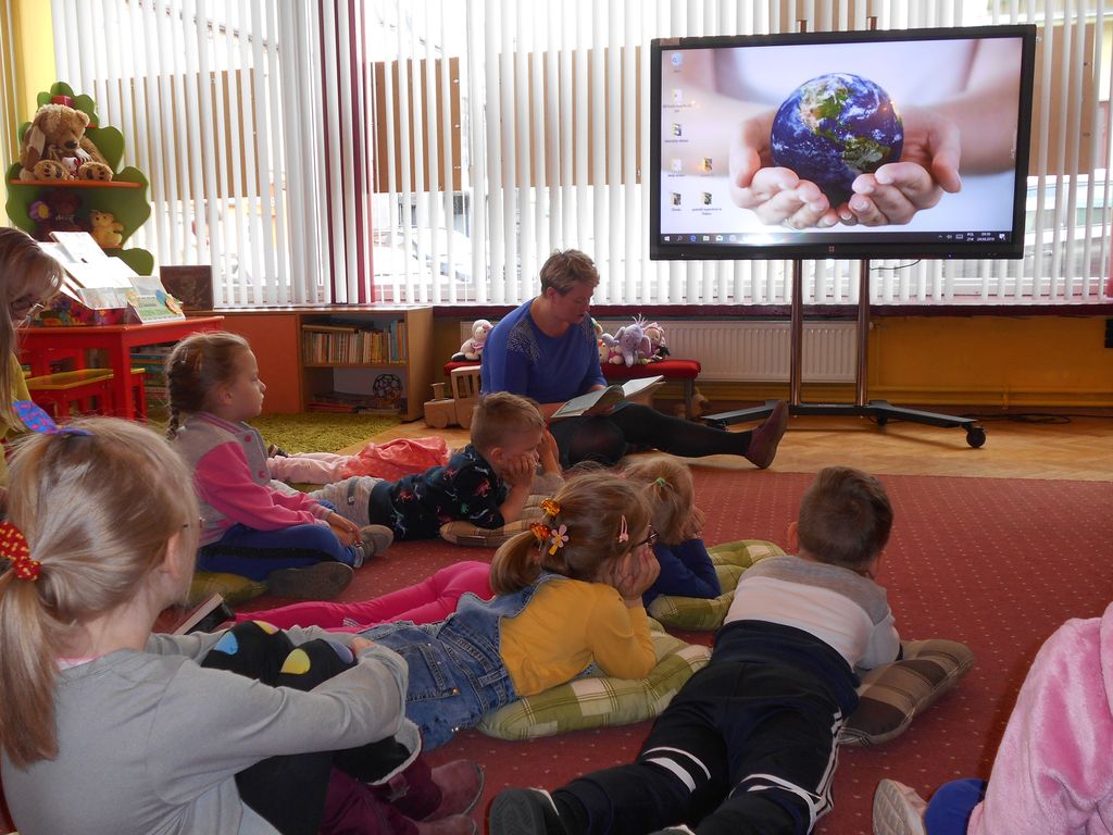 Przedszkolaki wysłuchały bajki Anny Mikity „O kwiatach, które nie chciały być zerwane”, zachwycały się pięknem przyrody oraz poznały skutki zanieczyszczenia naszej planety oglądając wyświetlane na ekranie monitora fotografie. Dzieci deklarowały, że są prawdziwymi przyjaciółmi przyrody – znały sposoby segregacji śmieci, z łatwością wymieniały jak postępować aby chronić środowisko naturalne, wykazały się też umiejętnością tworzenia sztuki użytkowej. Z surowców wtórnych: rolek po papierze toaletowym i skrawków papieru wykonały praktyczne, kolorowe pojemniki na kredki. Był też czas na wspólną zabawę, a przede wszystkim „buszowanie” między bibliotecznymi regałami w poszukiwaniu interesujących książeczek.