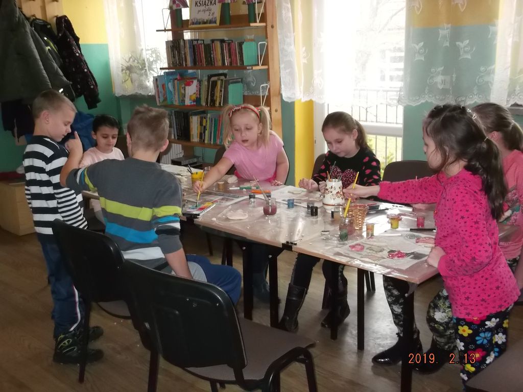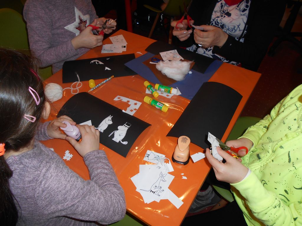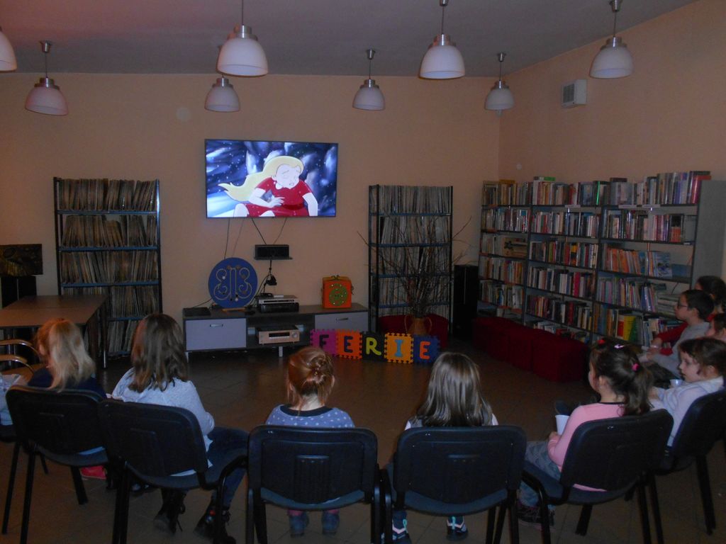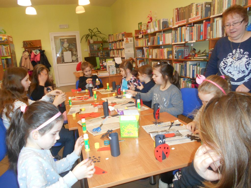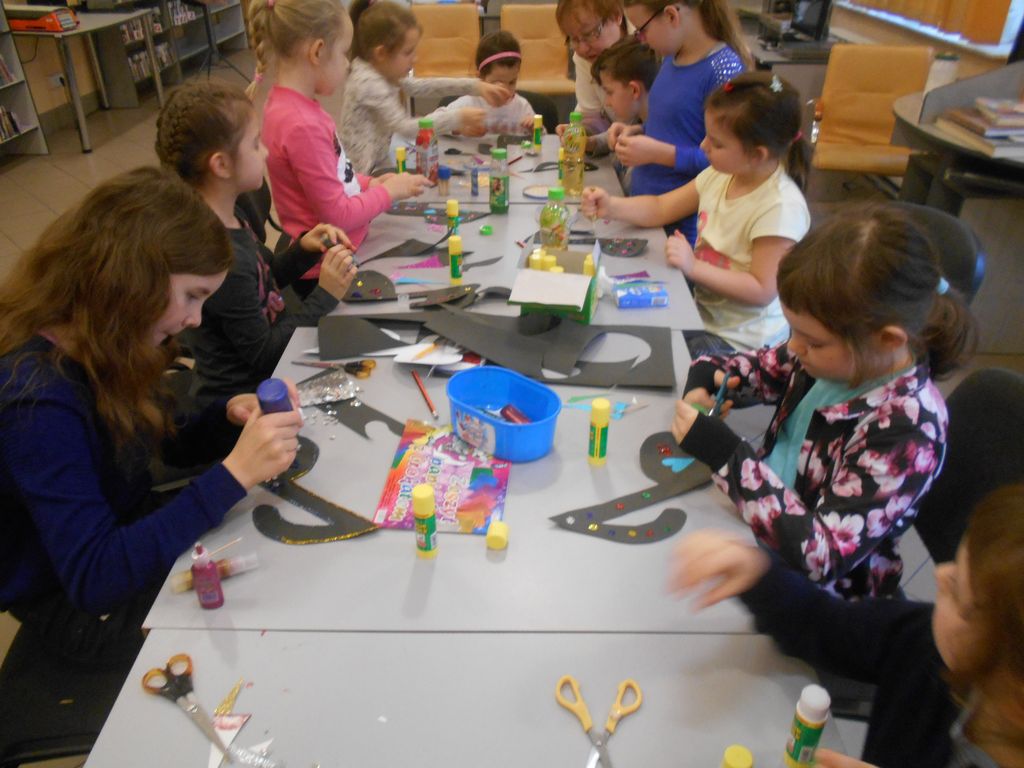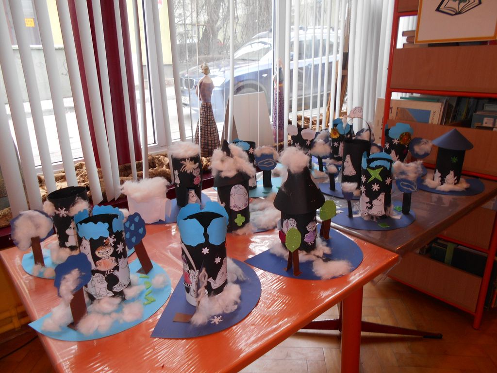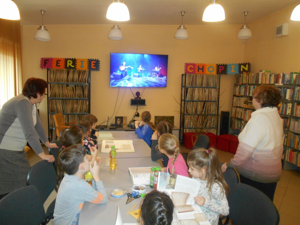 W Oddziale dla dzieci i młodzieży Biblioteki Głównej m.in. „puszą się” śniegowe krajobrazy wykonane z brystolu, waty, patyczków i kolorowego papieru oraz obszerna makieta ukazująca „ Wielki mróz w Dolinie Muminków”. W Filii nr 1 uczestnicy spotkań „Jak to brzmi”, swoje doznania muzyczne , przełożyli na obraz, tworząc tym samym prace pełne koloru i ekspresji. W Filii nr 2 prace dzieci zdominowała biel i marzenia o śnieżnej zimie. W Filii nr 3 inspiracją były zimowe przygody Pingwinka z zaczarowanej zagrody i Kubusia Puchatka. Śnieżnobiałe anioły zdobią już Filię nr 5 . Natomiast sikorki i gile z masy solnej można podziwić w Filii nr 6. Czytelników odwiedzających Filię nr 8 dziecięca fantazja zaprasza do zimowego lasu. Wśród prezentowanych prac szczególną uwagę przyciągają czerwone serduszka i laurki wykonane z okazji „Dnia Zakochanych”, który akurat w tym roku przypadł w czasie ferii. Zajęcia plastyczne to nie jedyna propozycja z jaką do dzieci wyszli bibliotekarze. Bardzo dużym powodzeniem cieszyły się również spotkania z książką, w trakcie których uczestnicy wraz z literackimi bohaterami wędrowali po odległych krainach. Opowiadania o Kubusiu Puchatku, najpiękniejsze zimowe baśnie czy przezabawne wiersze Doroty Gellner rozbudzały wyobraźnię dzieci, inspirowały do wspólnej zabawy i zachęcały do wykonania prac plastycznych.
