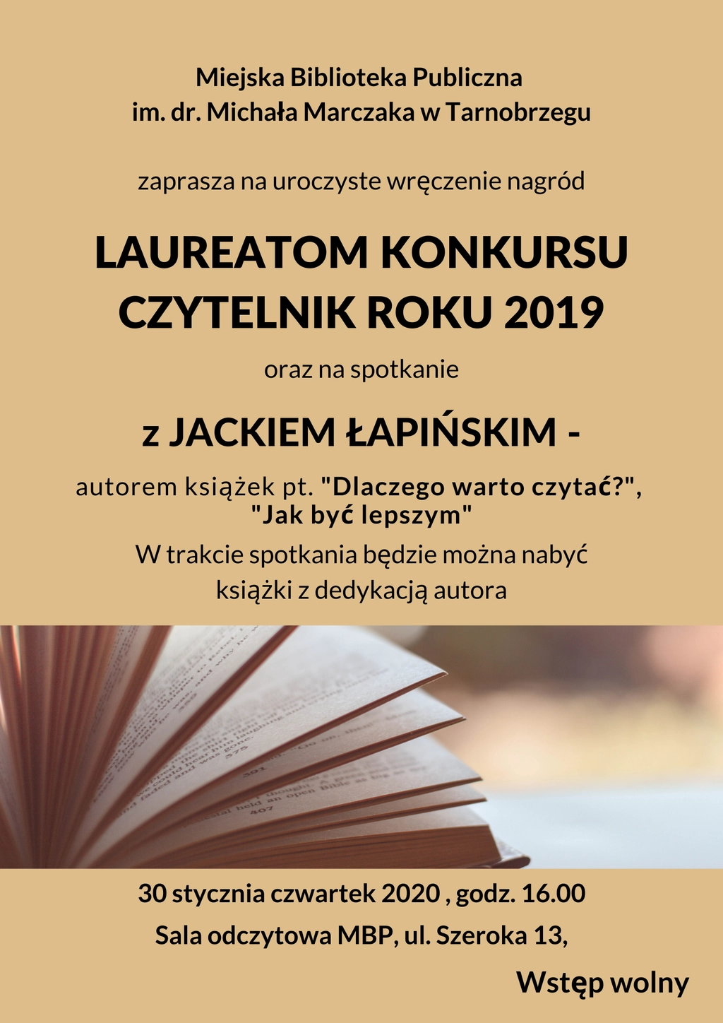 Tradycyjnie, już po raz kolejny najlepsi czytelnicy Miejskiej Biblioteki Publicznej im. dr. Michała Marczaka w Tarnobrzegu zostali uhonorowani nagrodami książkowymi. Uroczystemu podsumowaniu konkursu Czytelnik Roku 2019 w dniu 30 stycznia 2020 roku towarzyszyło spotkanie autorskie z Jackiem Łapińskim - wielkim orędownikiem czytania, autorem książek „Dlaczego warto czytać?”, „Jak być lepszym”.