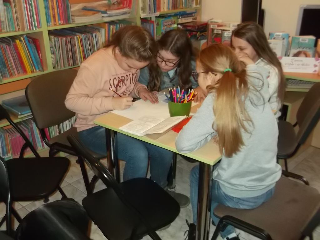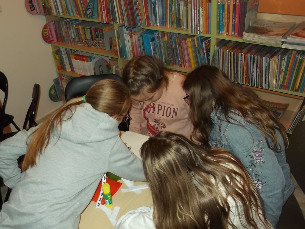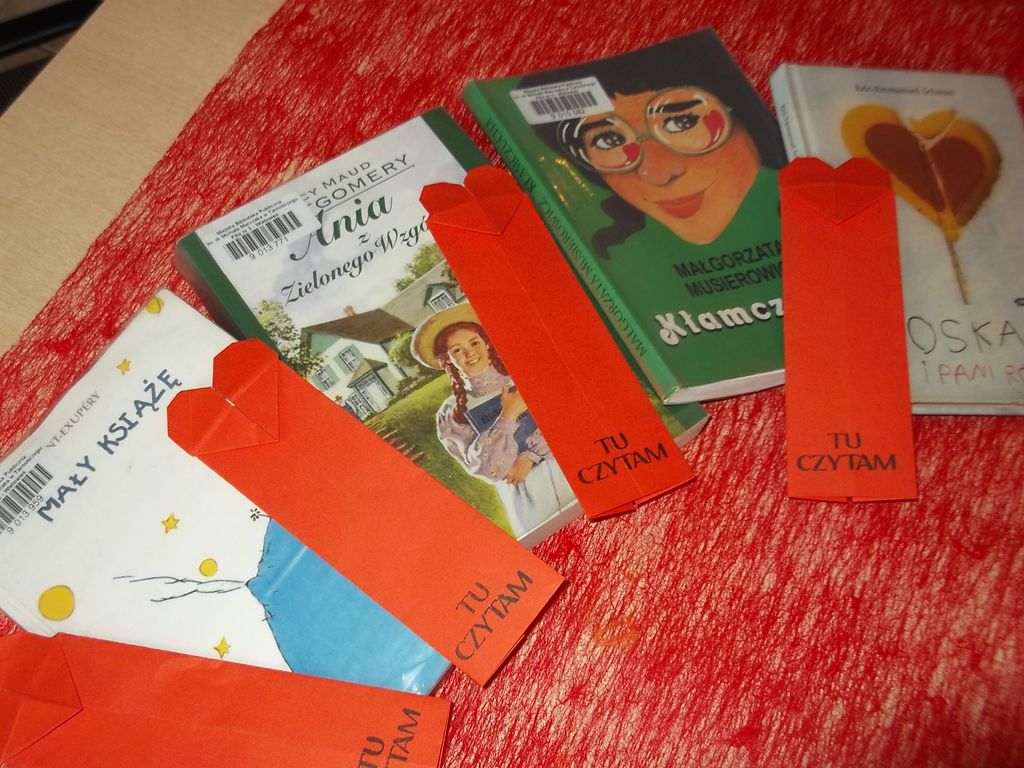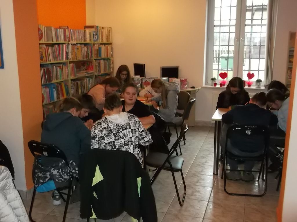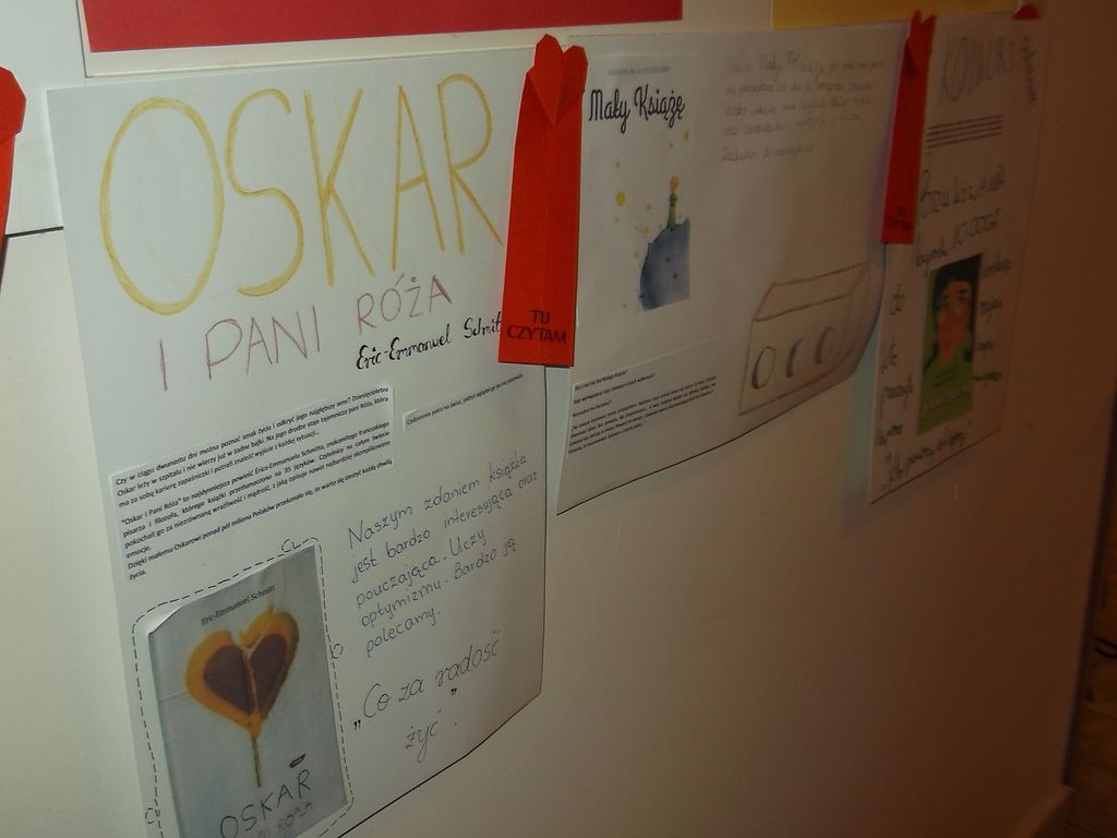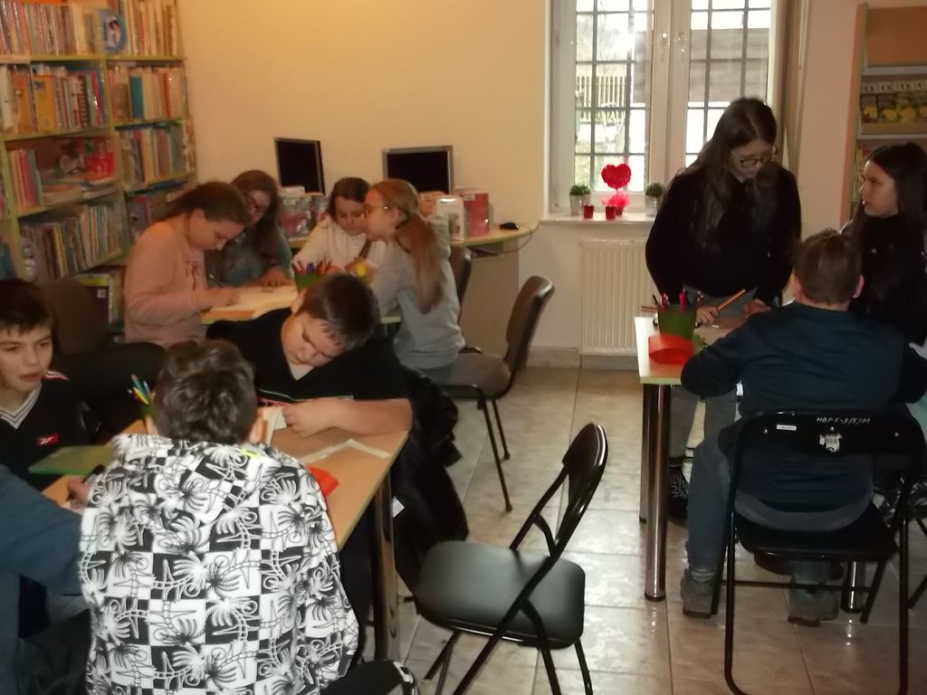 Pracując w grupach poznali bohaterów czterech książek, z dostępnego księgozbioru, zaproponowanych przez bibliotekarza. Efektem końcowym wspólnej pracy były plakaty promujące wybrane książki – „Anię z Zielonego Wzgórza”, „Małego Księcia”, „Oskara i panią Różę”, „Kłamczuchę”, które po omówieniu, zawisły w galerii biblioteki. Nie zabrakło również prezentów – tych własnoręcznie wykonanych. Były to zakładki-serduszka złożone techniką origiami z papierowych pasków. Na pamiątkę walentynkowego spotkania w bibliotece uczniowie zabrali ze sobą wykonane prace.