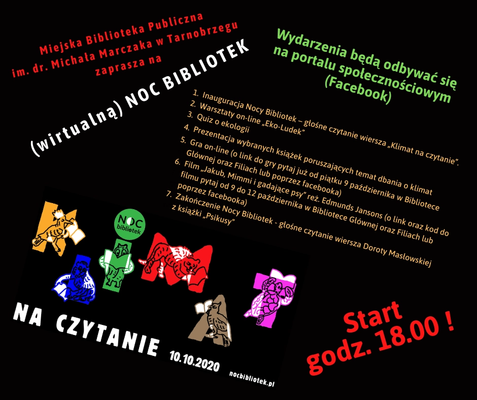 W nawiązaniu do hasła przewodniego Nocy Bibliotek – „Klimat na czytanie” – bibliotekarze przygotowali interesujące formy mające na celu upowszechnianie czytelnictwa oraz zwrócenie uwagi na problem dewastacji środowiska. 10 października na fanpage’u biblioteki o godz. 18ej rozpoczęła się Wirtualna Noc Bibliotek. Zainaugurowana została głośnym czytaniem hymnu pt. „Klimat na czytanie”, napisanego specjalne na tę okazję przez Jacka Cygana. Wśród zaplanowanych form znalazły się także warsztaty on-line pt. „Eko-Ludek”, quiz ekologiczny, prezentacja wybranych książek poruszających temat dbania o klimat oraz głośne czytanie wiersza Doroty Masłowskiej o „psach nierasy”. Formy on-line miały w sumie 618 odbiorców. Ponadto, od piątku do poniedziałku, w Bibliotece Głównej oraz wszystkich filiach bibliotecznych udostępniane były linki i kody do filmu animowanego pt. „Jakub, Mimmi i gadające psy” oraz link do ekologicznej gry on-line. Wydano 24 linki oraz 24 kody.