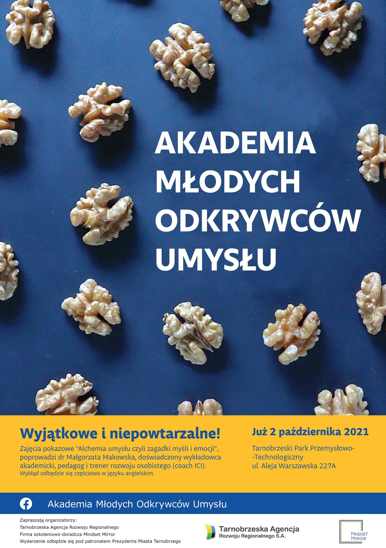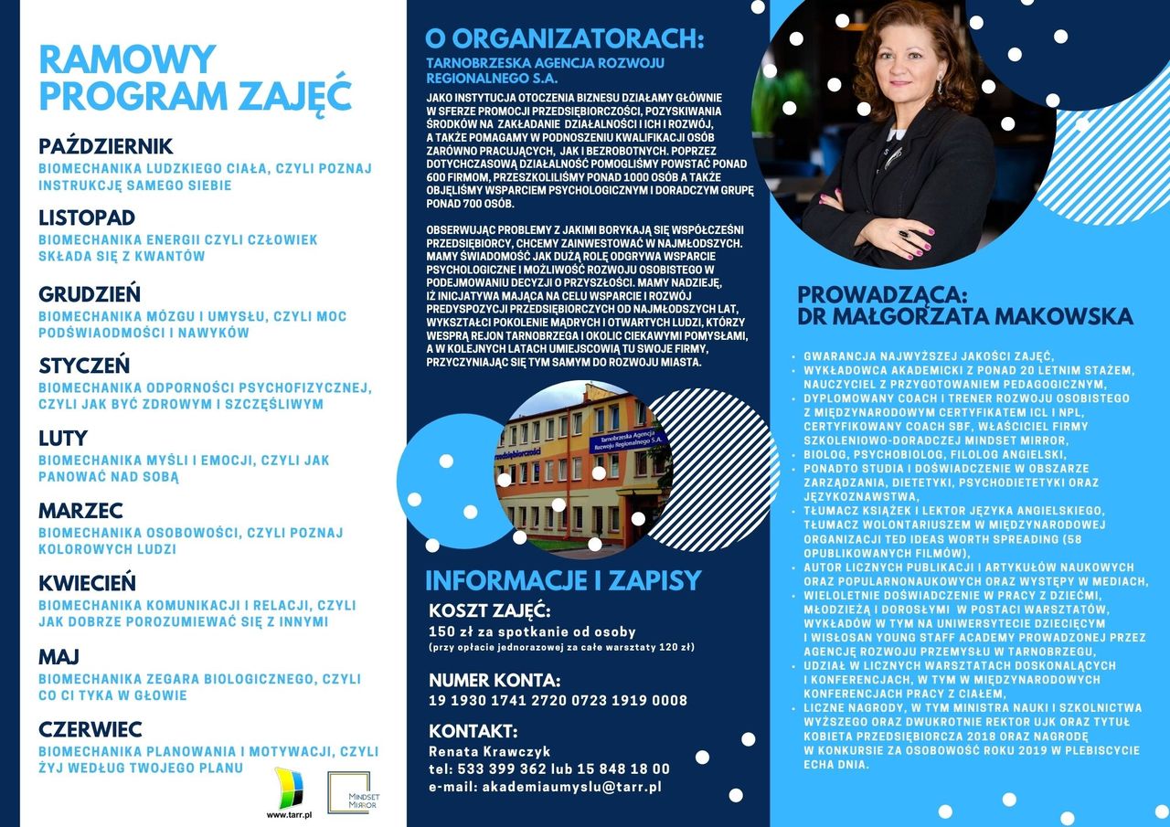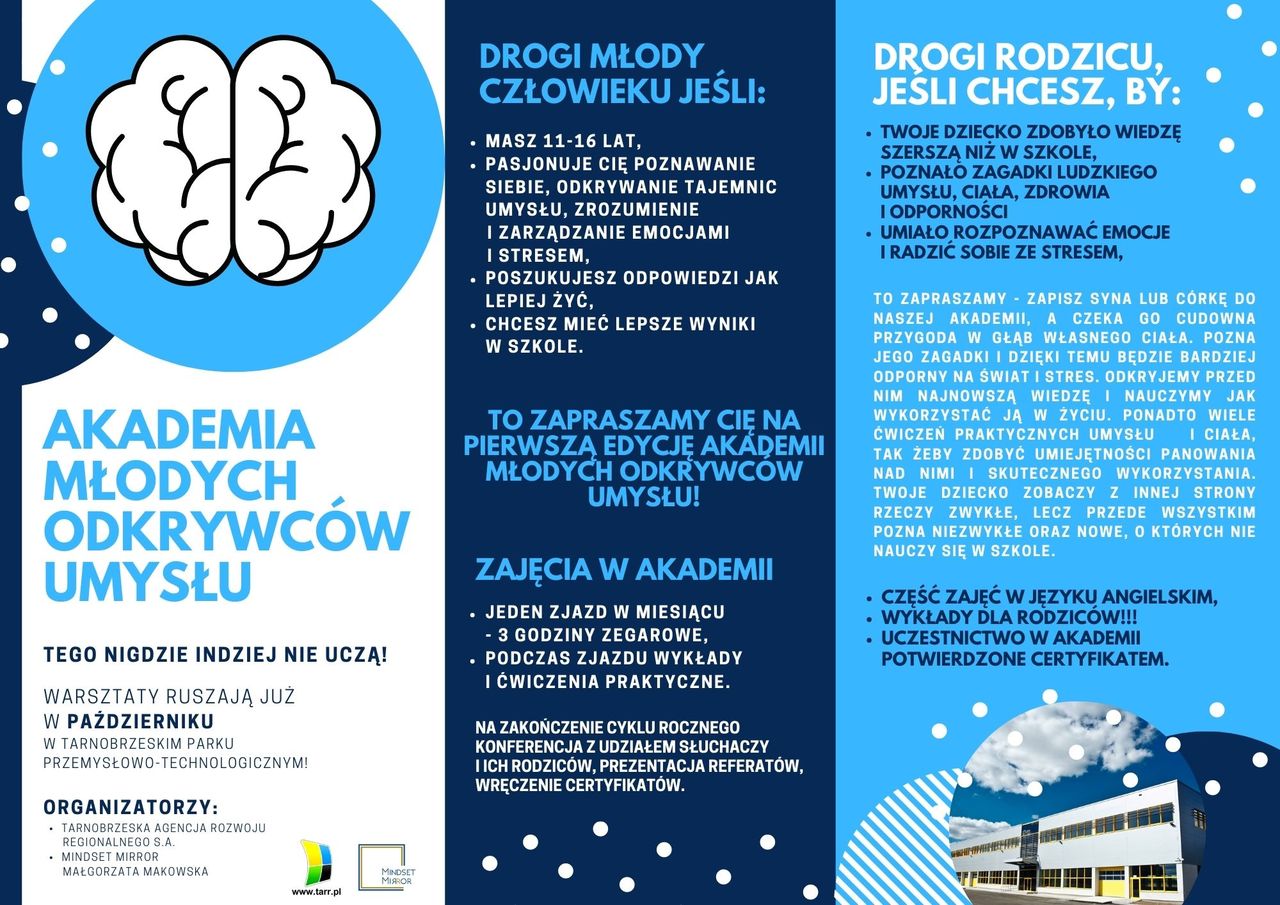 Tarnobrzeska Agencja Rozwoju Regionalnego S.A. we współpracy z Mindset Mirror – Małgorzata Makowska organizuje warsztaty pn. „Akademia Młodych Odkrywców Umysłu”. Zajęcia skierowane są do dzieci i młodzieży w wieku 11 – 16 lat. Program Akademii zakłada edukację z pogranicza psychologii oraz coachingu. Młodzi odkrywcy poznawać będą tajniki ludzkiego umysłu, ciała i zdrowia. Nauczymy ich rozpoznawać emocje, a także radzić sobie ze stresem.