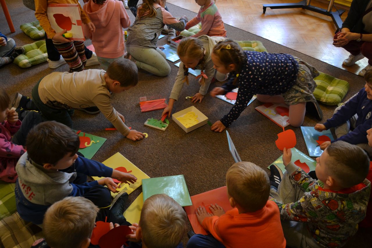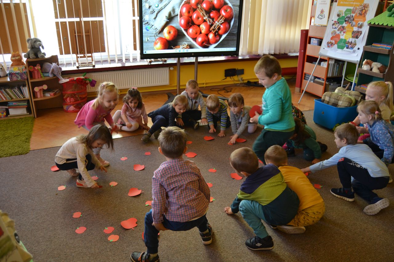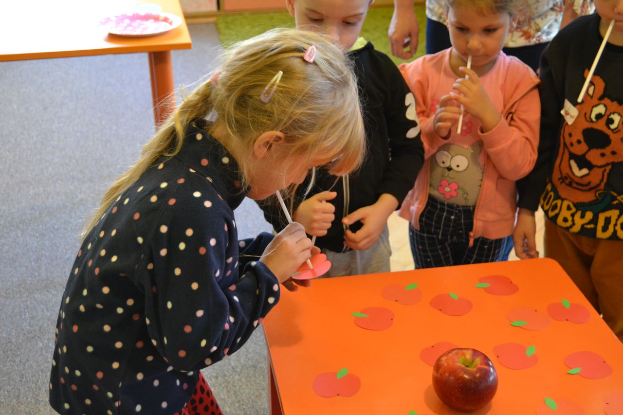 W nawiązaniu do tematu spotkania, przedszkolaki wysłuchały wiersza Jana Brzechwy „Entliczek - Pentliczek”, zatańczyły do piosenki „Małe czerwone jabłuszko” i z wielkim zaangażowaniem przyklejały robaczka do papierowego jabłka. Podczas wesołej zabawy - maluchy zbierały do koszyczków rozsypane w sadzie małe i duże jabłuszka, a starsze przedszkolaki musiały wykazać się umiejętnością przenoszenia czerwonych owoców na końcu słomki.