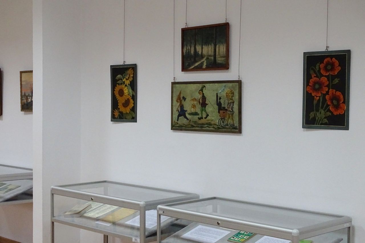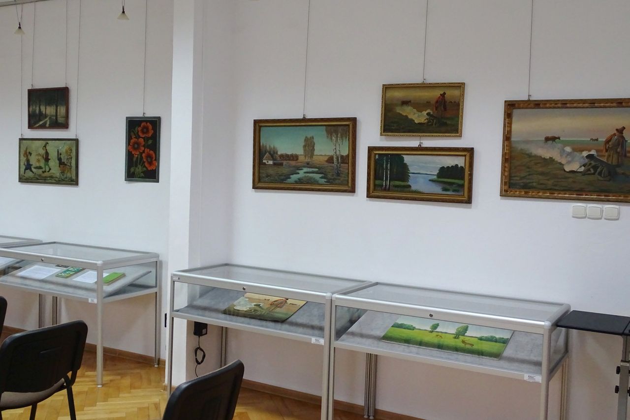 Ulubionym tematem prac, tworzonych najczęściej na pilśniowej płycie, były scenki rodzajowe i sielskie krajobrazy. Niejednokrotnie też, na zamówienie, „kopiował” wielkich mistrzów. Ale nie tylko. Zdobione łąką pełną stokrotek czy sarenkami fajansowe talerze miały również swoich nabywców. Swoim niekonwencjonalnym stylem życia wpisał się na dobre w historię miasta. Uwieczniony został również na kartach literatury regionalnej. Prezentowane na wystawie prace pochodzą z różnych okresów twórczości artysty i ukazują różnorodność tematów po które sięgał.