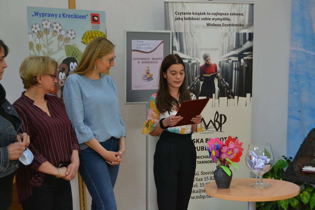 Konkurs edukacyjny pt. „Znam historię biblioteki” organizowany z ramach Tygodnia Bibliotek został rozstrzygnięty 27 maja. Konkurs polegał na udzieleniu prawidłowych odpowiedzi na pięć pytań dotyczących historii Miejskiej Biblioteki Publicznej w Tarnobrzegu. Losowanie nagród odbyło się w sali odczytowej biblioteki Głównej, w obecności Komisji złożonej z pracowników biblioteki i zostało zarejestrowane w postaci filmu.