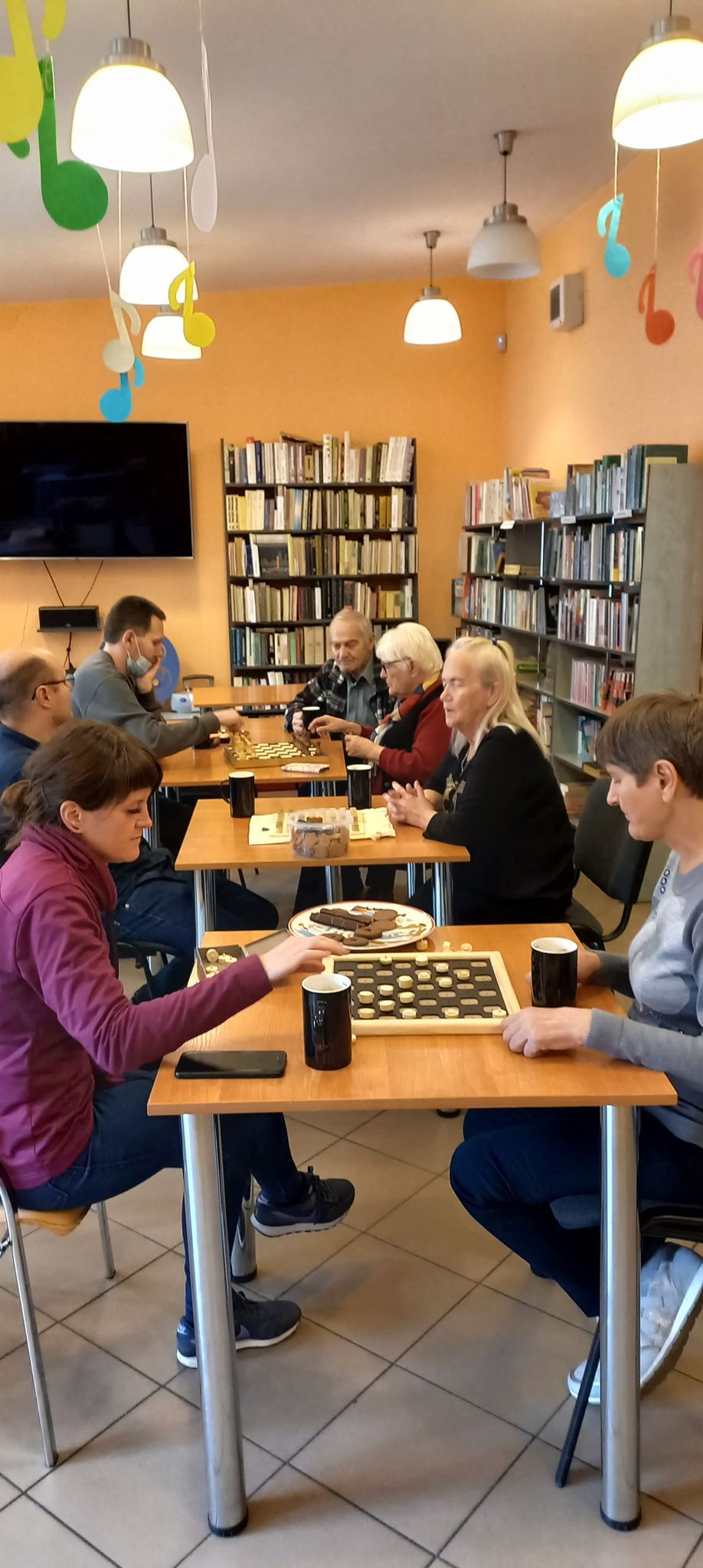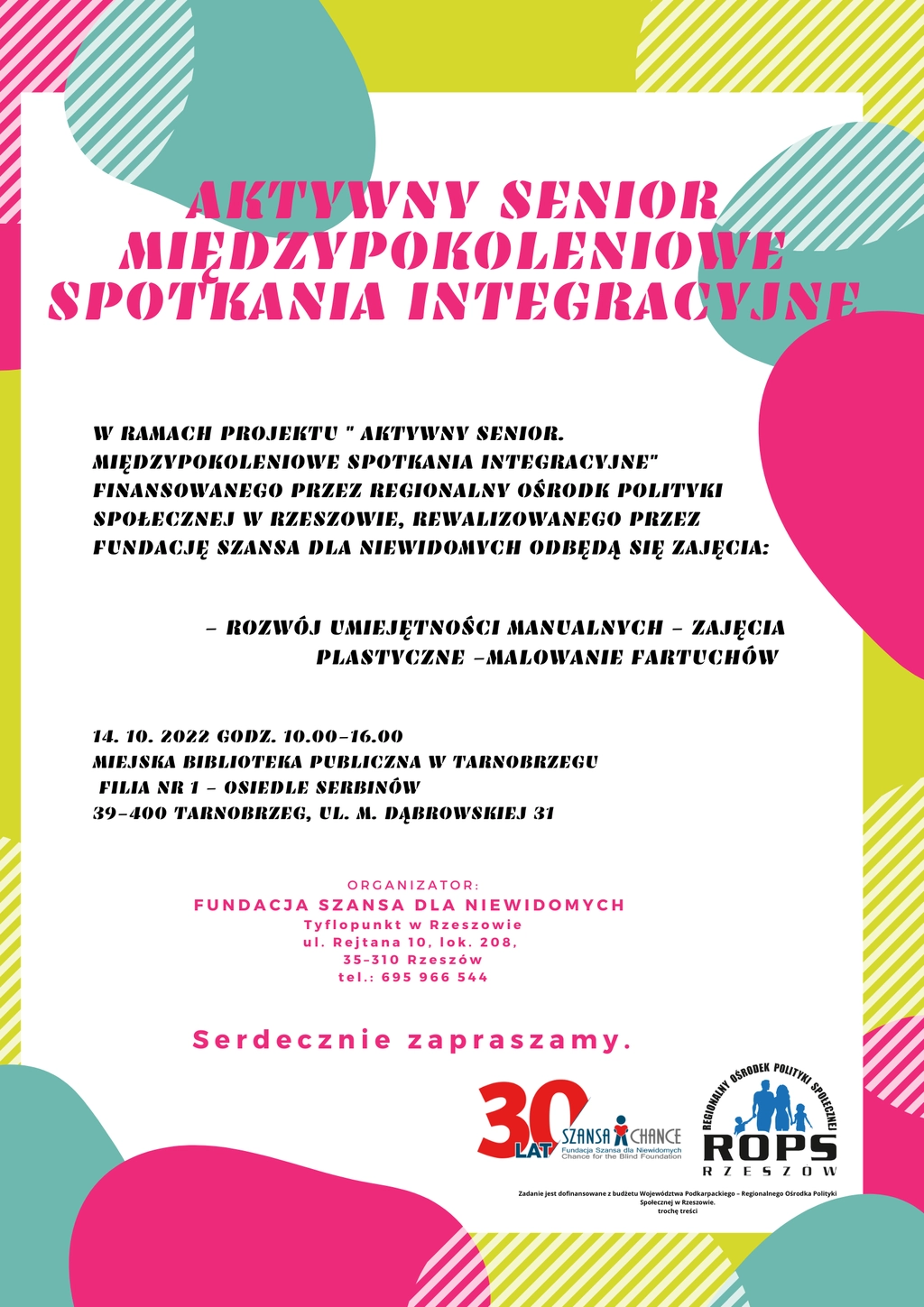 W zajęciach brali udział członkowie Polskiego Koła Związku Niewidomych, Okręgu Podkarpackiego w Tarnobrzegu, uczestnicy Warsztatów Terapii Zajęciowej przy PSONI Koło w Tarnobrzegu oraz Warsztatów Terapii Zajęciowej przy Parafii MBNP. Podczas spotkania ozdabiano przywiezione przez organizatorów fartuchy. W tym celu wykorzystano szablony z różnymi wzorami, farby, gąbki oraz pędzelki. Poprzednie warsztaty, które odbyły się 21 września 2022 r. przebiegały pod hasłem „Sport – aktywny umysł – międzypokoleniowe gry integracyjne”. Reversi, warcaby, szachy dotykowe oraz scrabble – to gry, które cieszyły się największym powodzeniem. Wszyscy uczestnicy z ogromnym zaangażowaniem ćwiczyli umysł i koncentrację planując kolejne strategiczne posunięcia przy ciasteczku i herbacie. Zarówno organizatorzy, jak i uczestnicy po każdym spotkaniu deklarują kontynuację spotkań w ramach projektu „Aktywny Senior. Międzypokoleniowe spotkania integracyjne”, który uwzględnia nie tylko osoby z niepełnosprawnością związaną ze wzrokiem, ale także ich rodzinę oraz znajomych.