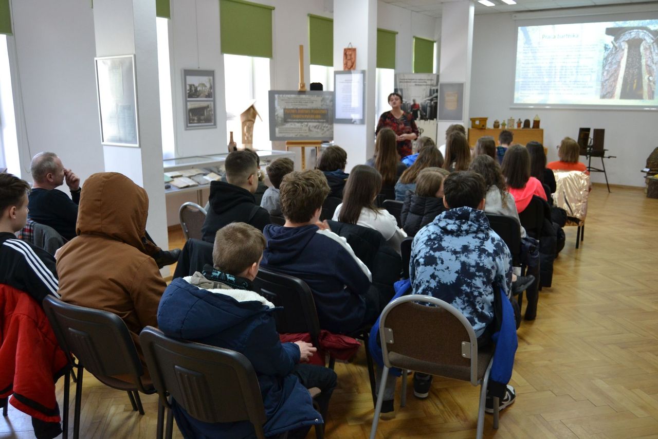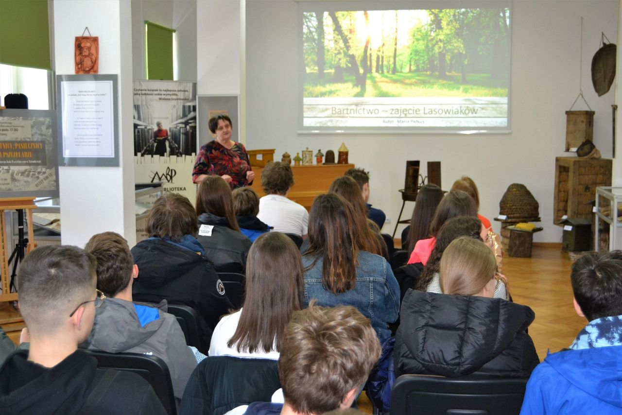 Bogaty materiał archiwalny, zawarty w opracowanej przez panią Marię prezentacji, to nie tylko historia o bartnictwie na naszym terenie, ale też ukazanie jak niełatwą i niebezpieczną była praca bartnika. Uczestnicy poznali technikę i narzędzia do dziania barci oraz kiedy i na jakich drzewach je wykonywano. Młodzież dowiedziała się także jak nazywał się znak rozpoznawczy bartnika umieszczany na drzewie oraz jakie kary przewidywał „kodeks karny” za nieuczciwe postępowanie wśród bartniczej braci. Jak radzono sobie z nieproszonymi gośćmi np. niedźwiedziami i kunami i ile miodu i wosku mógł pozyskać bartnik z jednej średniej wielkości barci.