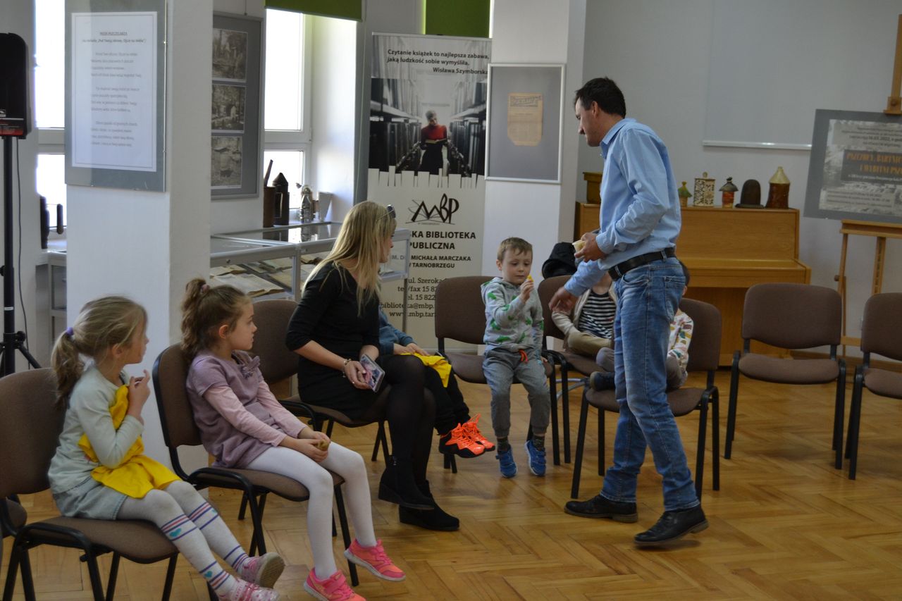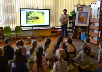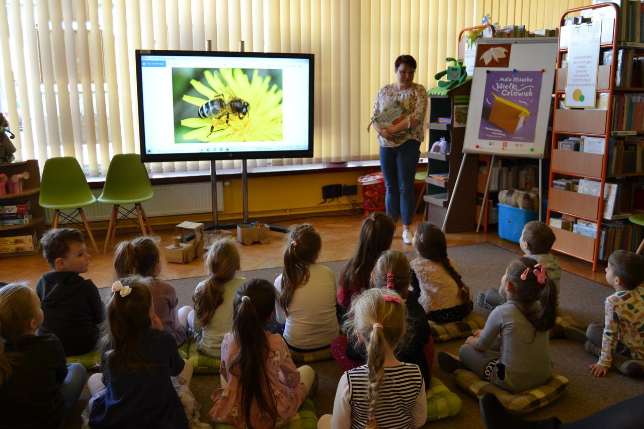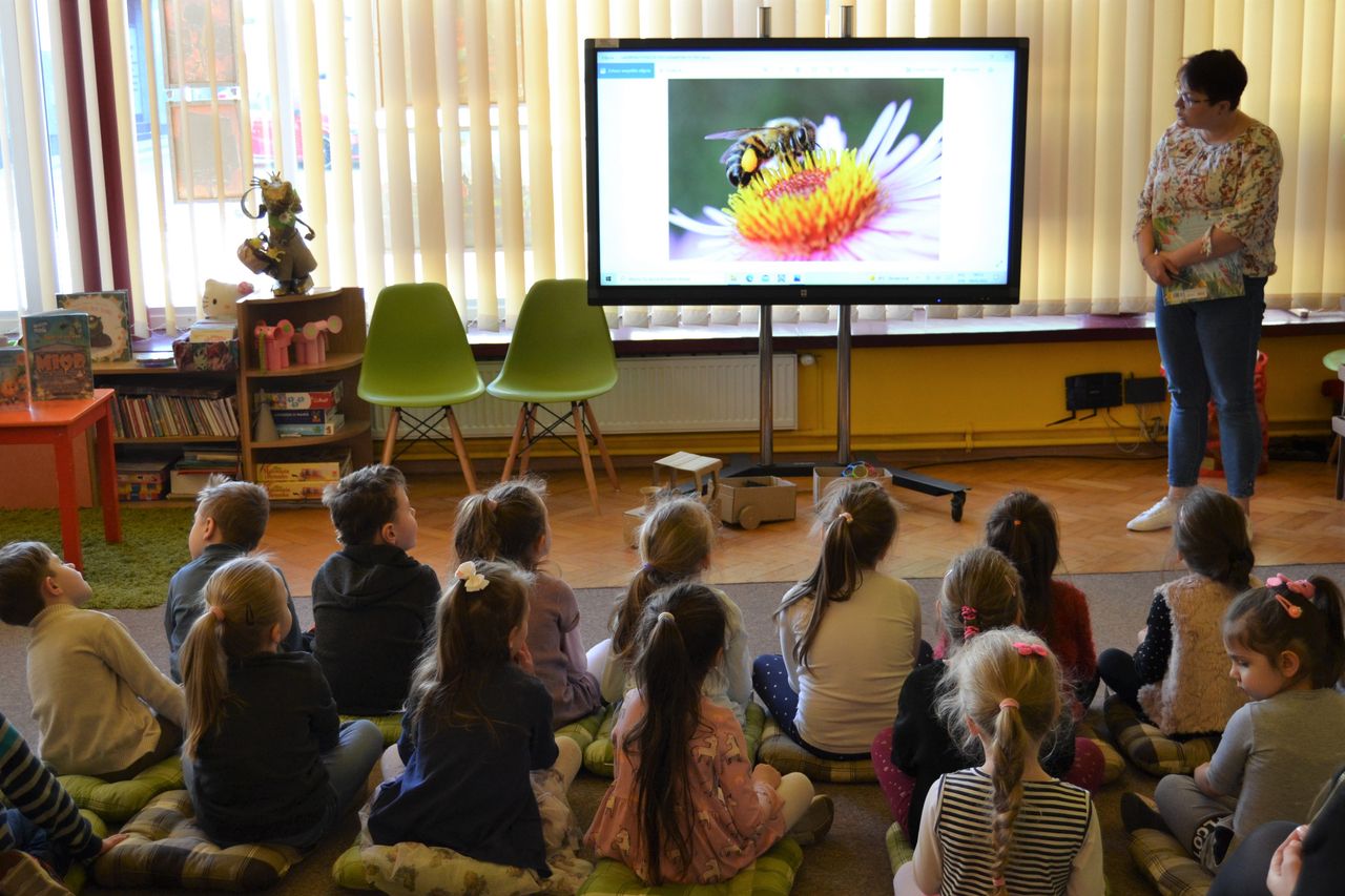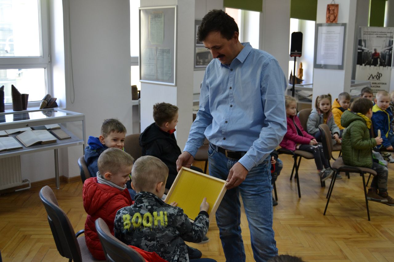 Były to m.in. mały ul, strój pszczelarski, woskowe plastry, plastry miodu w formie sekcyjnych ramek, aromatyczny propolis, podkurzacz do uspokajania podrażnionych pszczół oraz zdjęcia pszczół. Każdy z uczestników miał też możliwość dotknięcia bądź powąchania prezentowanych przedmiotów. Na zakończenie spotkania został przeprowadzony mini konkurs ze zdobytej na spotkaniu wiedzy a zwycięzcy otrzymali żółte koszulki z okolicznościowym nadrukiem. Natomiast najaktywniejsi uczestnicy woskowe świeczuszki w kształcie pieska i sowy. Po spotkaniu z pszczelarzem dzieci odwiedziły Oddział dla dzieci i młodzieży, gdzie wysłuchały przygód literackich pszczelich bohaterów.