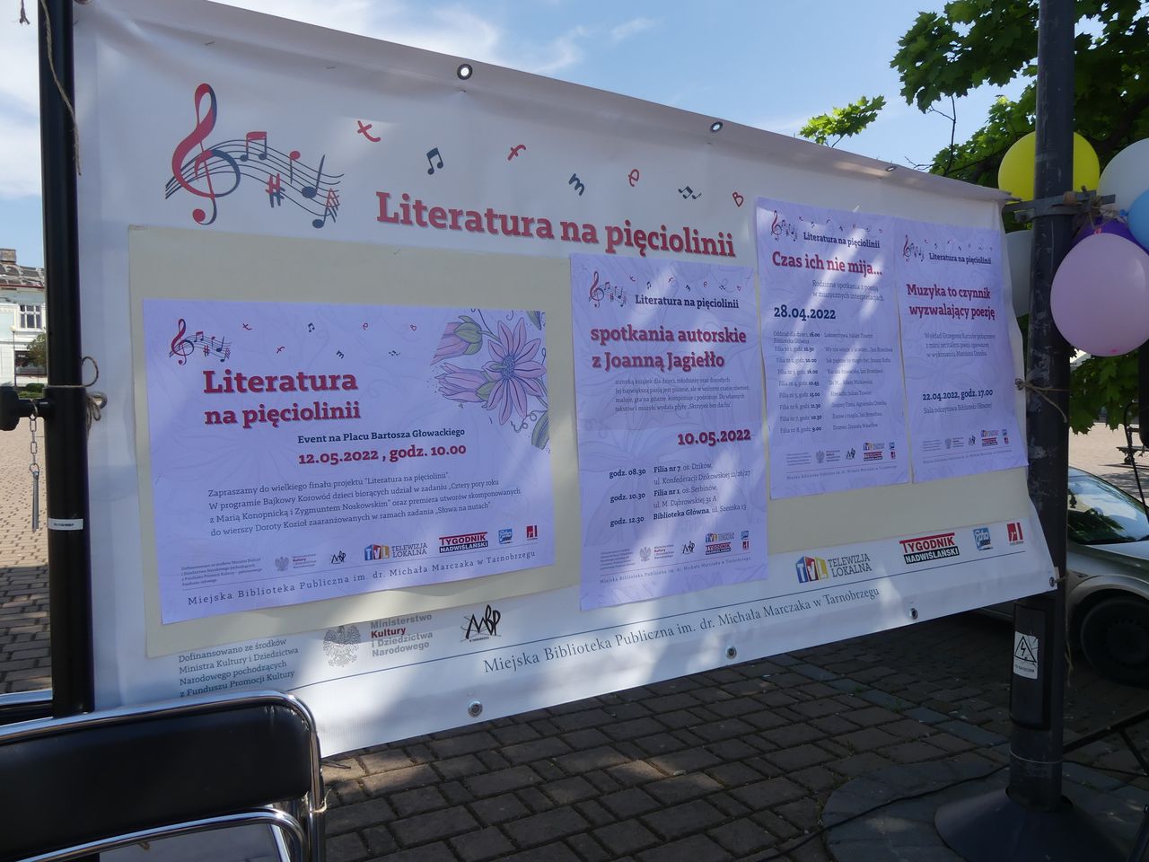 W czwartek, 12 maja 2022 roku, na Placu Bartosza Głowackiego w Tarnobrzegu zakończono realizację projektu „Literatura na pięciolinii” dofinansowanego ze środków Ministra Kultury i Dziedzictwa Narodowego pochodzących z Funduszu Promocja Kultury - państwowego funduszu celowego. W sercu miasta spotkały się wszystkie środowiska zaangażowane w jego realizację prezentując efekty działań ukazujących rolę literatury w kształtowaniu zarówno rozwoju emocjonalnego jak i relacji międzypokoleniowej.