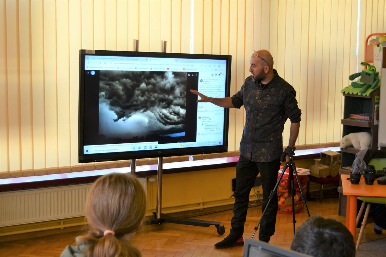 Przekazał wiele informacji technicznych dotyczących sprzętu fotograficznego, którym posługuje się robiąc zdjęcia. Opowiedział o samej technice wykonywania zdjęć oraz rodzajach fotografowanych obiektów. Pojawiły się takie kosmiczne określenia jak Perseidy, meteoryty, Droga Mleczna czy komórki burzowe. Słuchacze zostali także wtajemniczeni w odmienne techniki robienia zdjęć dziennych i nocnych, poznając specyfikę astrofotografii i meteofotografii. Z zachwytem uczniów spotkały się również zdjęcia, które pan Grzegorz umieszcza na swoje stronie Facebookowej, a z wielkim zainteresowaniem sprzęt fotograficzny, który mogli wziąć do ręki i „wypróbować”.
