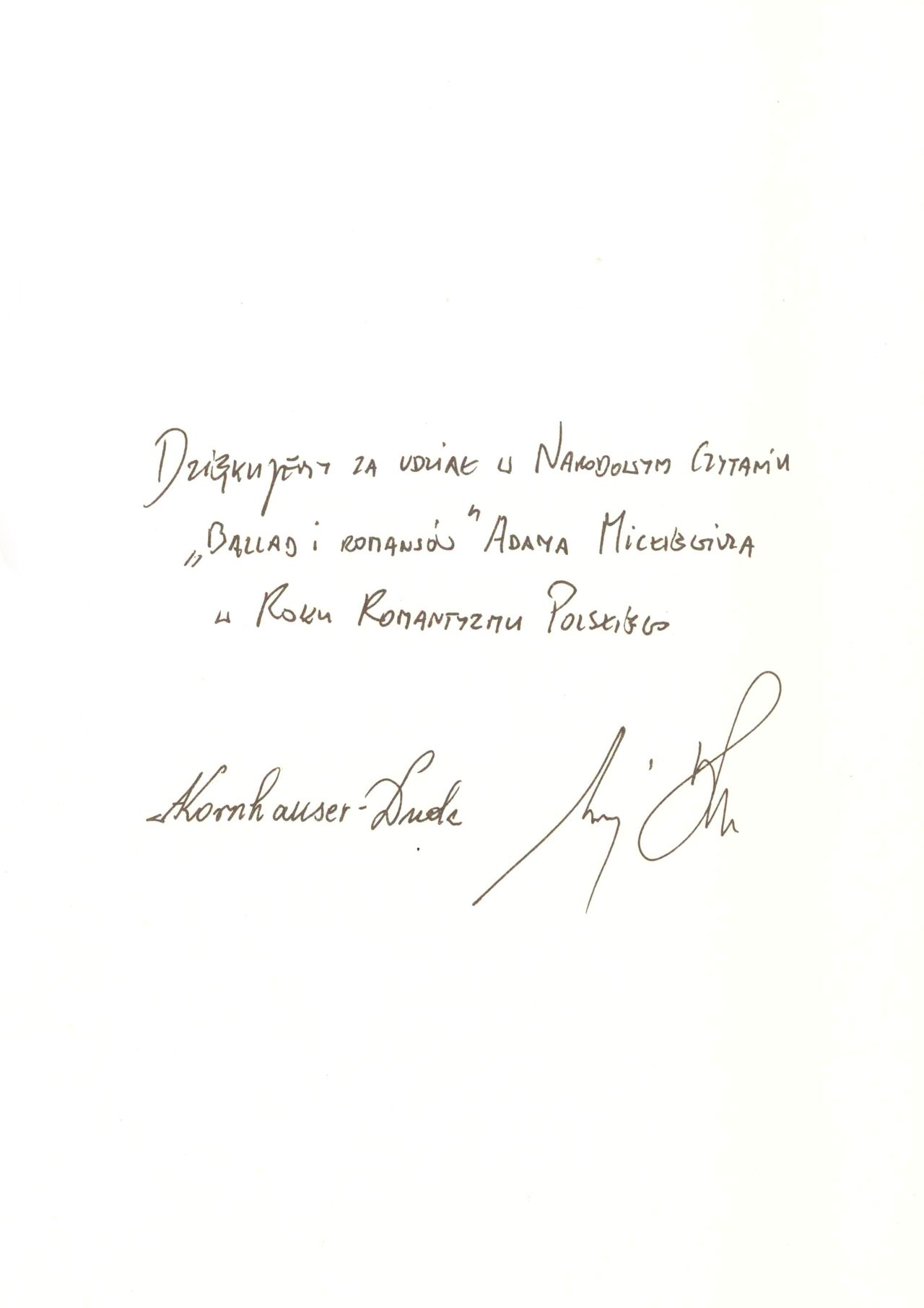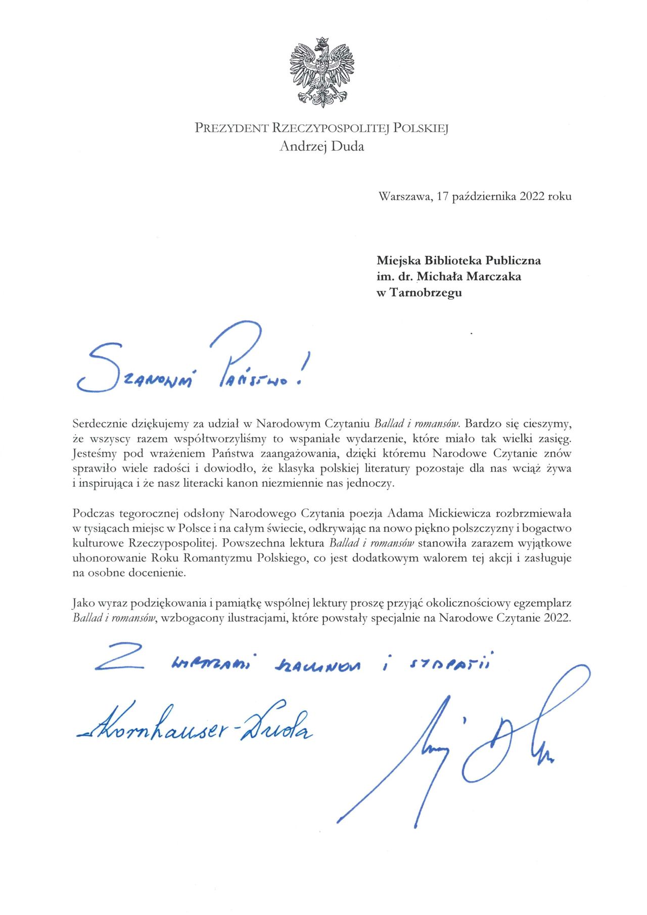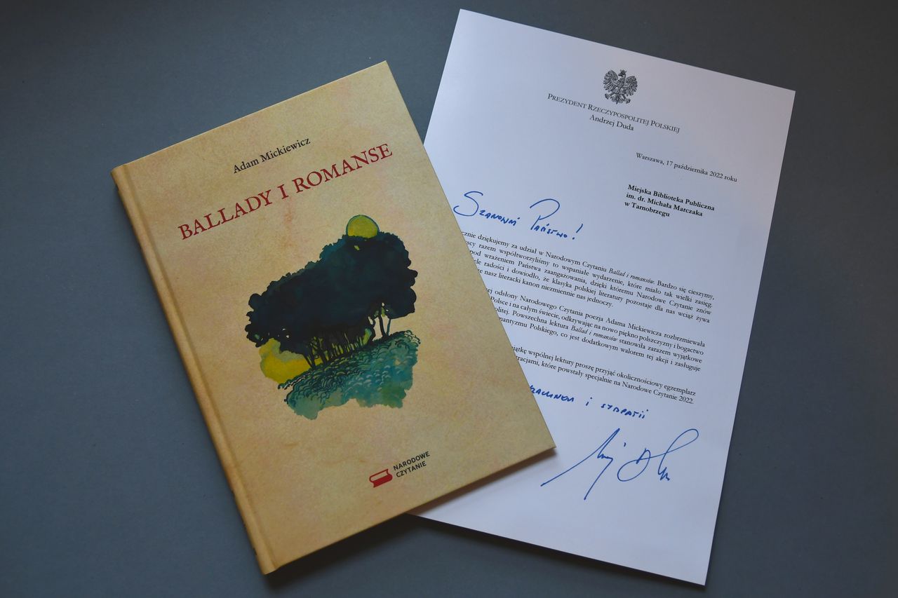 Miejska Biblioteka Publiczna im. dr. Michała Marczaka w Tarnobrzegu otrzymała list od Prezydenta Rzeczypospolitej Polskiej Andrzeja Dudy z podziękowaniem za współtworzenie Narodowego Czytania 2022 oraz okolicznościowy egzemplarz „Ballad i romansów” Adama Mickiewicza z dedykacją i podpisem Pary Prezydenckiej.