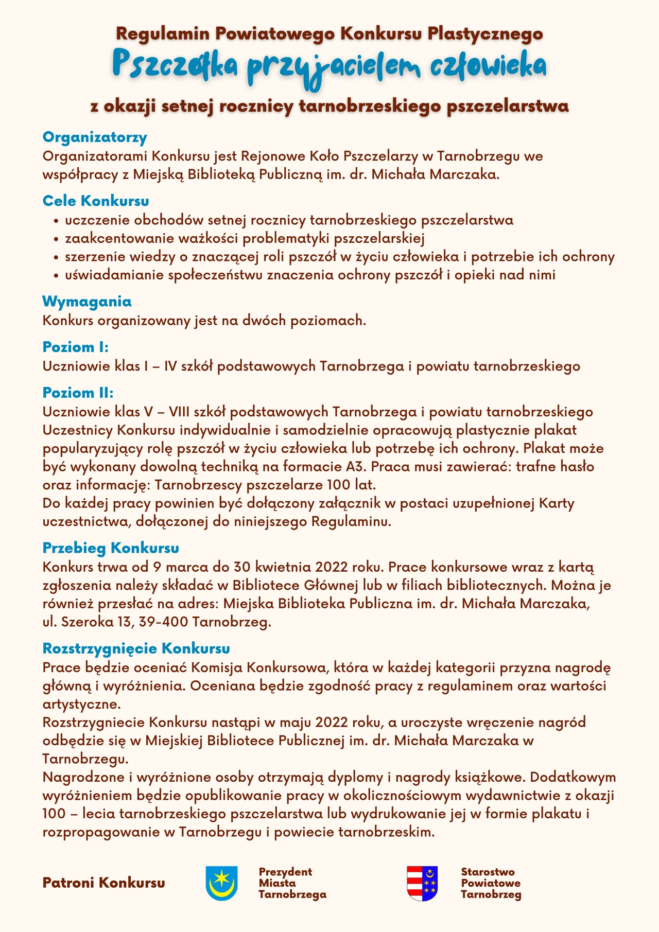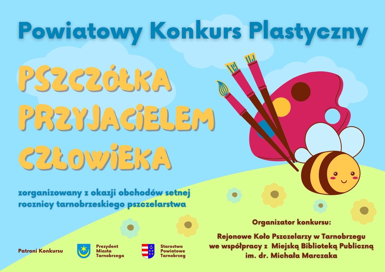 Zapraszamy do udziału w Powiatowym Konkursie plastycznym „Pszczółka przyjacielem człowieka”, zorganizowanym w ramach obchodów 100. rocznicy powstania Powiatowego Koła Pszczelarzy w Tarnobrzegu pod patronatem Prezydenta Miasta Tarnobrzega Dariusza Bożka oraz Starosty Powiatu Tarnobrzeskiego Jerzego Sudoła.