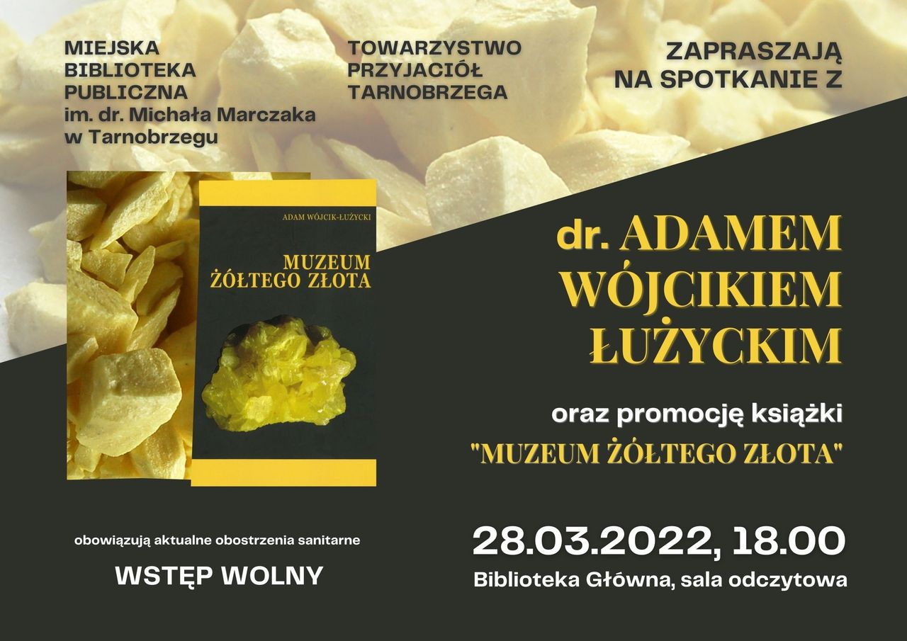 W poniedziałek, 28 marca o godz. 18.00 – w Miejskiej Bibliotece Publicznej im. dr. M. Marczaka odbyło się spotkanie z Adamem Wójcikiem-Łużyckim oraz promocja książki „Muzeum żółtego złota”. Publikacja ta prezentuje jedyne na świecie muzeum poświęcone siarce, jej wydobyciu, przetwórstwu i ogromnej roli, jaką przemysł siarkowy odegrał w historii Tarnobrzega oraz całej Polski w II połowie XX wieku.