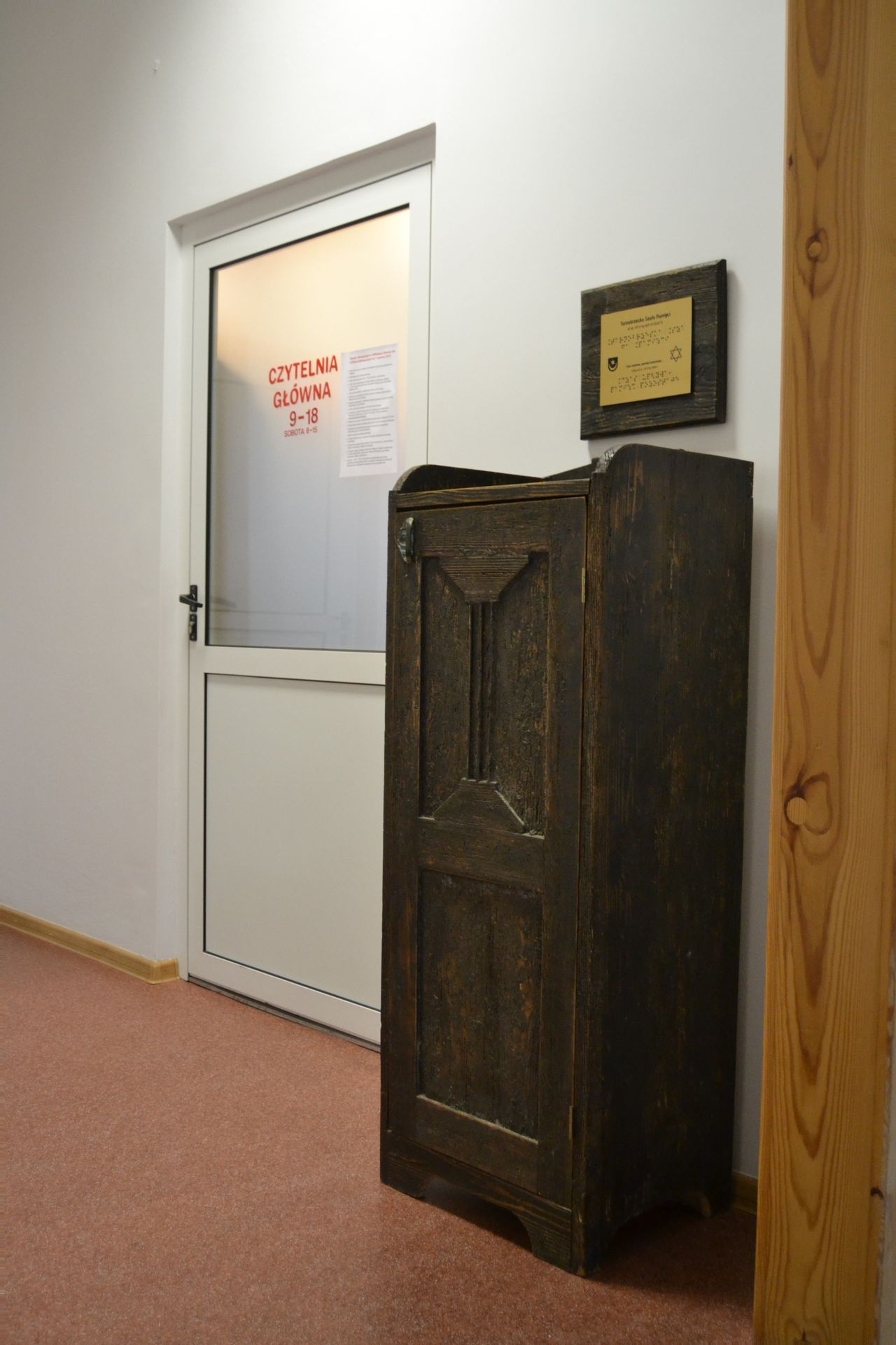 Szafa opatrzona została stosowną tabliczką z opisem w dwóch językach oraz tyflografiką.