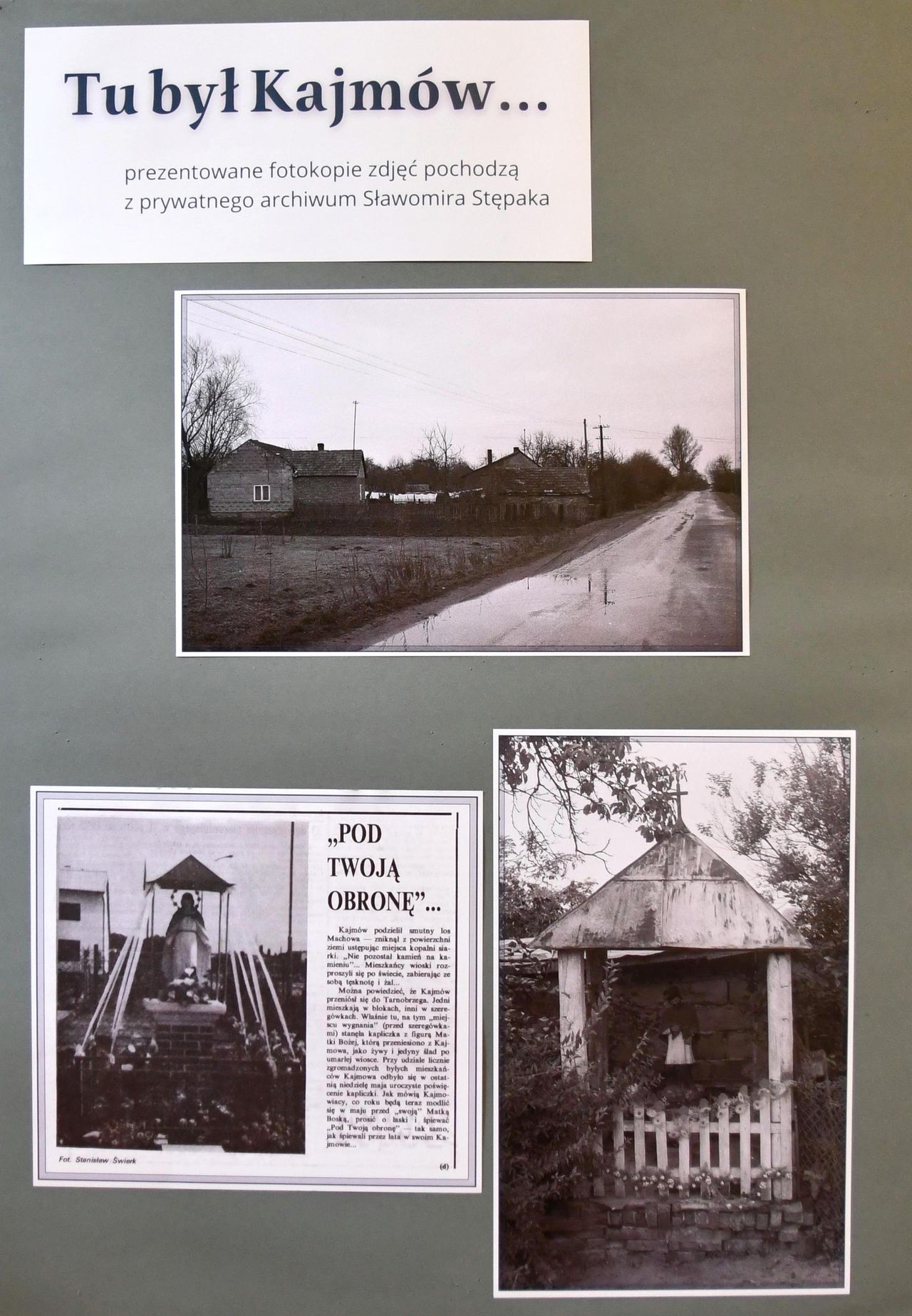 Był tu przedwojenny „dom gromadzki”, w którym po wojnie mieściła się biblioteka, klub rolnika, mleczarnia, sklep no i remiza strażacka. Były drogi wysadzane wierzbami, olszynowe zagajniki, ruczaje i jary. Prezentowane fotokopie zdjęć udostępnione z prywatnego archiwum Sławomira Stępaka, ukazują ostatnie momenty istnienia wioski. Całość dopełniają artykuły „Pod Twoją Obronę” oraz „Kraj lat dziecinnych” opublikowane na łamach Tygodnika Siarka.