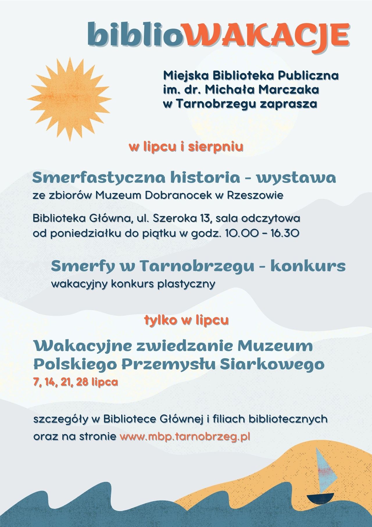 Mali artyści będą mogli uczestniczyć w zajęciach artystycznych i plastycznych, na których wykonywać będą m. in. kartki 3D, przyborniki, zawieszki na drzwi, witraże, kolaże, letnie stworki i potworki, biżuterię czy domki dla smerfów. Zapoznają się także z techniką artystyczną o tajemniczej nazwie iris folding. Miłośnicy książek będą mieli do dyspozycji zajęcia literackie, literacko-plastyczne spotkania z książką oraz głośne czytania. Wybiorą się w literacką podróż w świat Smerfów, Muminków, Rumcajsa, Kubusia Puchatka, Czerwonego Kapturka, Kota w butach i wielu innych bohaterów baśni, opowiadań i książek. Dla zdobywców nowej wiedzy przewidziano zajęcia edukacyjne, podczas których zgłębią tematykę polskich ziół, tajników biblioteki czy zwierząt „co skaczą i fruwają”. Nie zabraknie także atrakcji dla wielbicieli muzyki, z myślą o których zorganizowane zostanie karaoke oraz zajęcia muzyczno-plastyczne inspirowane muzyką Vivaldiego. Z kolei lubiących wyzwania oraz „planszomaniaków” z pewnością ucieszą rebusy, kalambury, krzyżówki, quizy, zagadki, sudoku, gry planszowe, puzzle i zabawy interaktywne. Łowcy przygód będą mogli wziąć udział w trwających całe wakacje zabawach czytelniczych. Czekać na nich będzie wakacyjna walizka, którą należy wypełnić literackimi „zachęcajkami” oraz kwietny domek, który dzięki uczestnikom zabawy zakwitnie i zmieni kolory. Natomiast podróżnicy mogą przysyłać do biblioteki pocztówki z miejsc, które zwiedzają i pomóc w ten sposób stworzyć galerię wakacyjnych wspomnień z podróży. Zapowiadają się naprawdę smerfastyczne wakacje, bowiem letnie formy urozmaici, czynna przez całe wakacje, wystawa pt. „Smerfastyczna historia”, a także trwający w lipcu i sierpniu konkurs plastyczny „Smerfy w Tarnobrzegu”. Konkurs adresowany jest do dzieci w wieku 6-10 lat. Prace można składać w Bibliotece Głównej oraz w każdej filii bibliotecznej. Regulamin, karta zgłoszenia oraz szczegółowy program imprez dostępny jest poniżej.