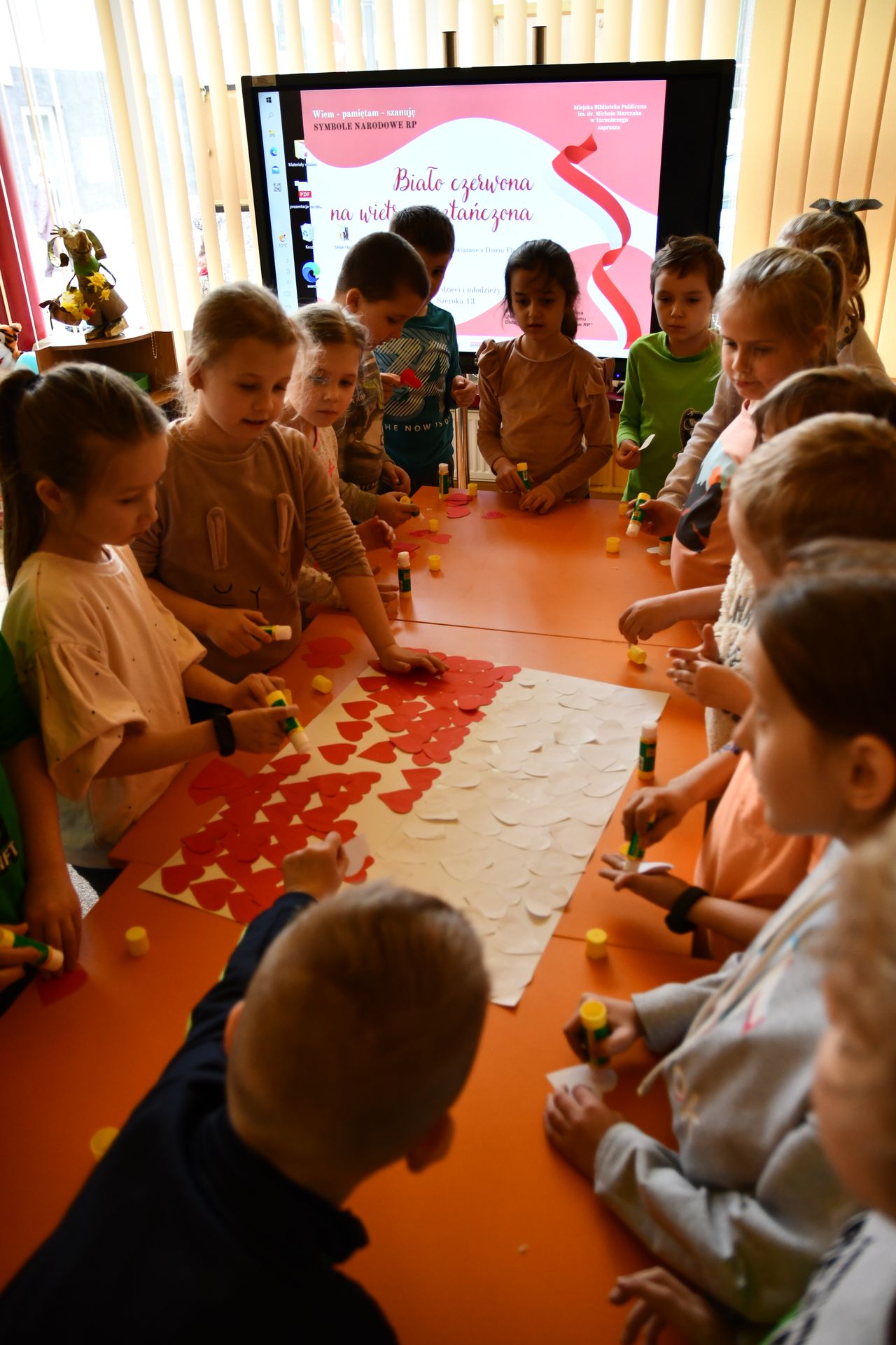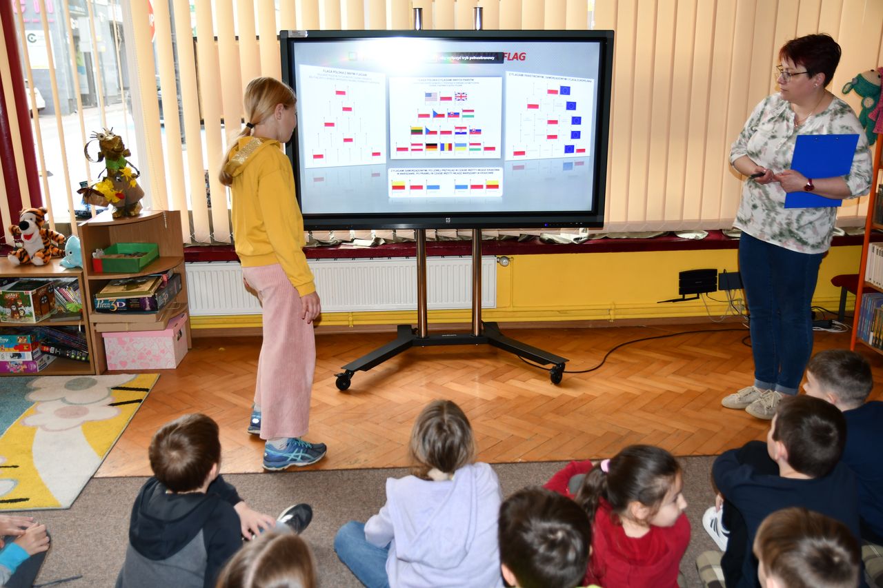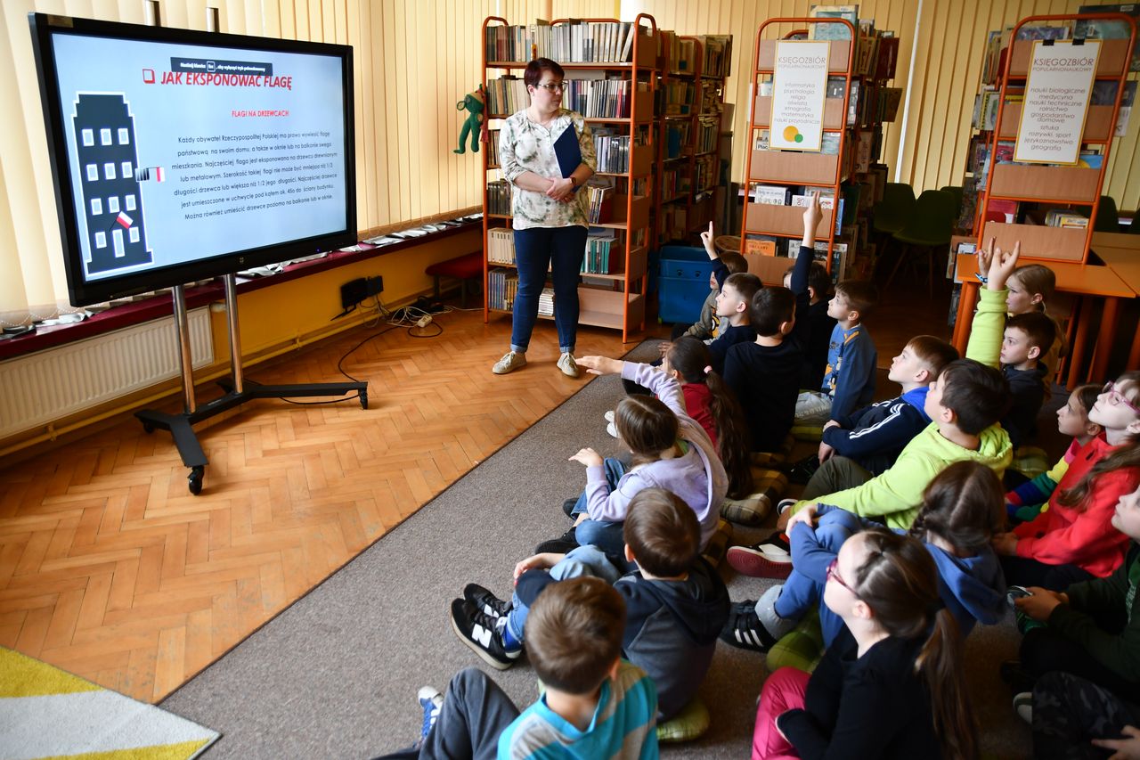 Bibliotekarze, poprzez bardzo zróżnicowane formy pracy, przybliżyli najmłodszym genezę święta Dnia Flagi, znaczenie barw oraz obowiązujące zasady eksponowania jednego z naszych symboli narodowych.Spotkania, podczas których wykorzystano fragmenty literatury, gry edukacyjne, quizy, prezentacje multimedialne, karaoke oraz manualne zdolności uczestników w sposób lekki a jednocześnie z należytym szacunkiem wprowadziły dzieci w świadomy odbiór nadchodzącego święta. Wykonane podczas spotkań kontury mapy Polski i flag wypełnione biało – czerwonymi sercami czy dłońmi to tylko niektóre z przykładów wyrażające poczucie tożsamości narodowej przez najmłodszych.