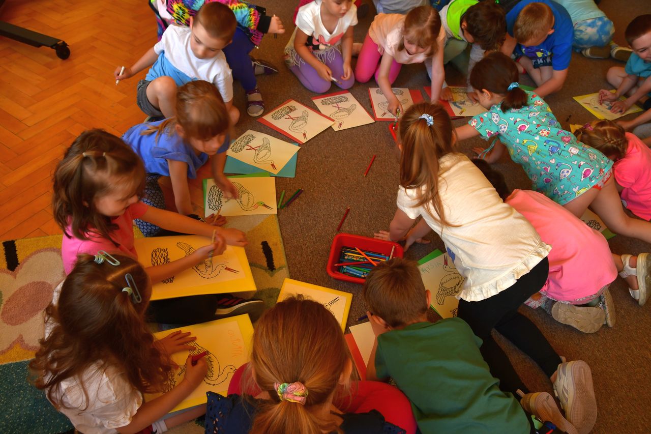 Dodatkowo poznały „Bociana Kleofasa” bohatera książki Doroty Kozioł, który opowiedział o swojej afrykańskiej przygodzie i poszukiwaniu przyjaciół. Punktem obowiązkowym spotkań w bibliotece, na który przedszkolaki czekają z ogromną niecierpliwością, jest wykonanie pracy plastycznej. Tym razem powstały zarówno typowo polskie, bo czarno-biało-czerwone bociany, ale także nietypowe – jak na święto nietypowe przystało – bociany bajkowe, tęczowe i kolorowe. Wykonane kolorowanki z pewnością przykuwać będą uwagę w przedszkolnej galerii.