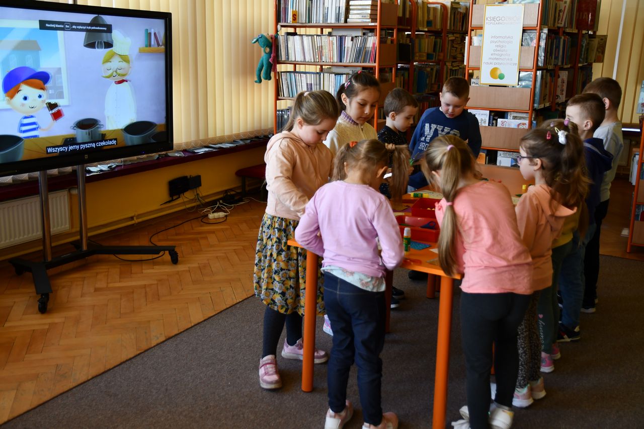 Niedawno, bo 12 kwietnia, obchodzono najsłodszy dzień w roku – Dzień Czekolady. Z tej okazji Oddział dla dzieci i młodzieży odwiedziła grupa 6-latków z Przedszkola „Bajka”. Dzieci dowiedziały się – z prezentacji multimedialnej – gdzie i w jakich warunkach rosną drzewa kakaowca, jak wygląda jego owoc i jak wydobywa się z niego nasiona oraz jaką muszą przejść drogę by stać się czekoladą.