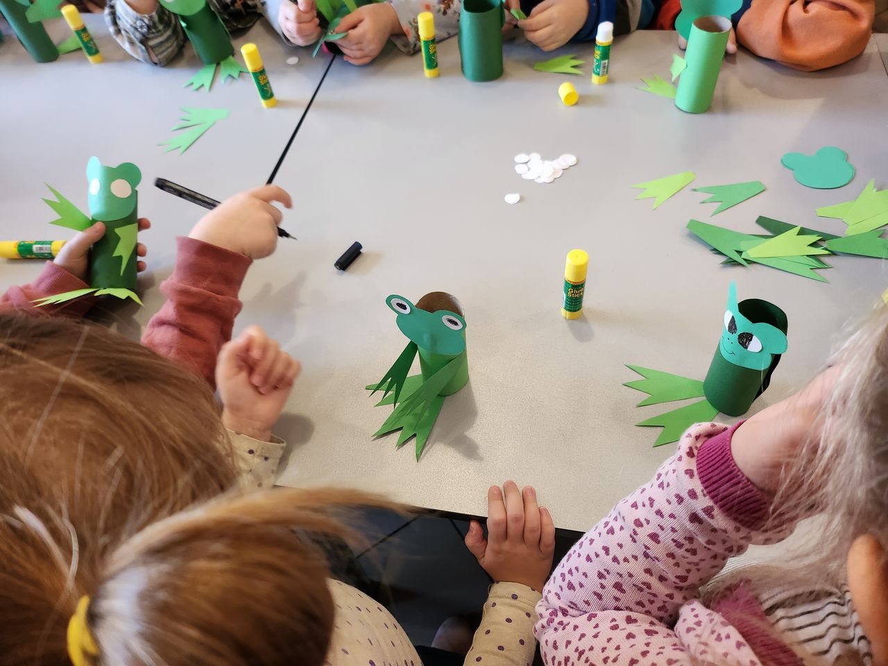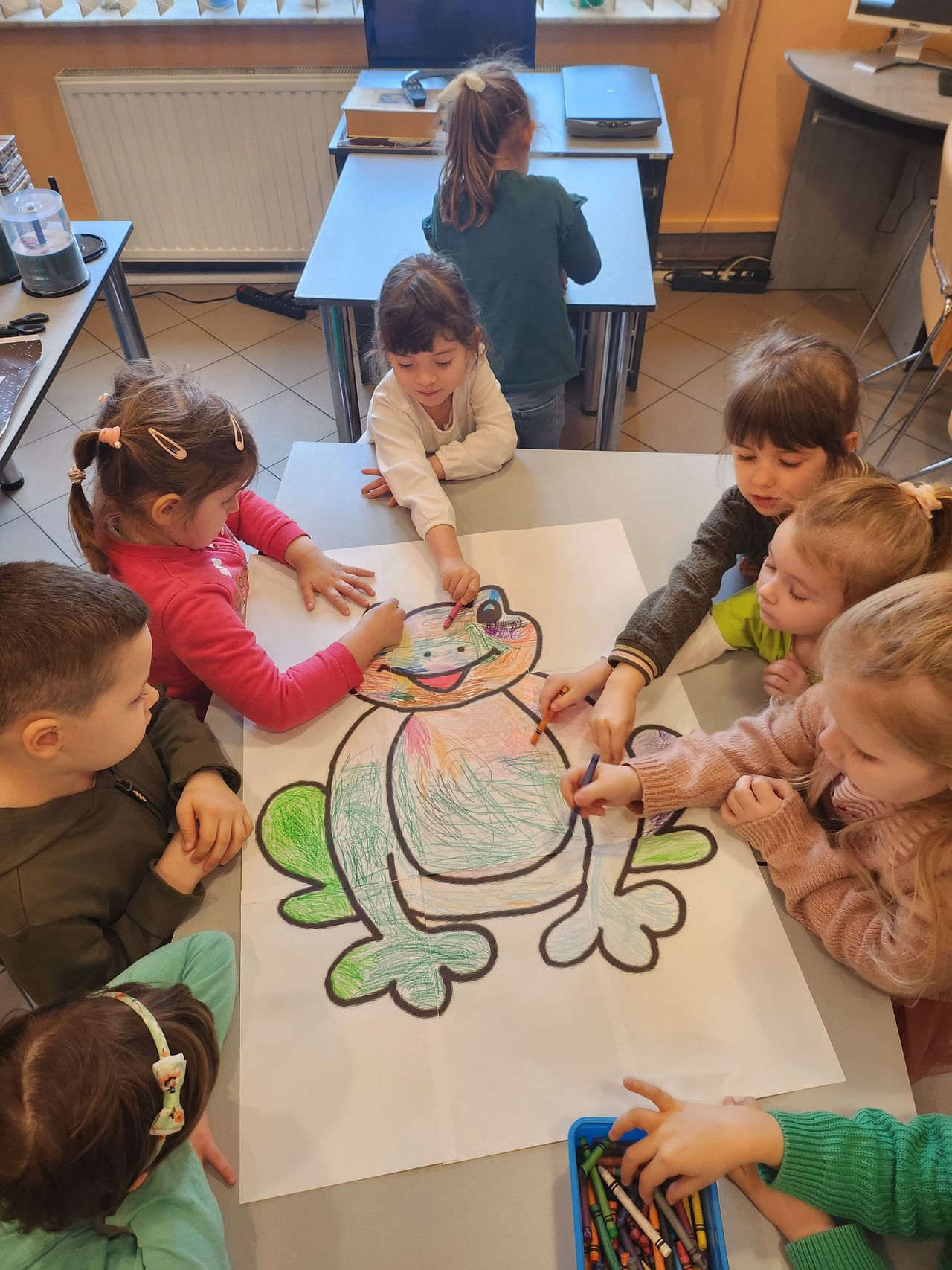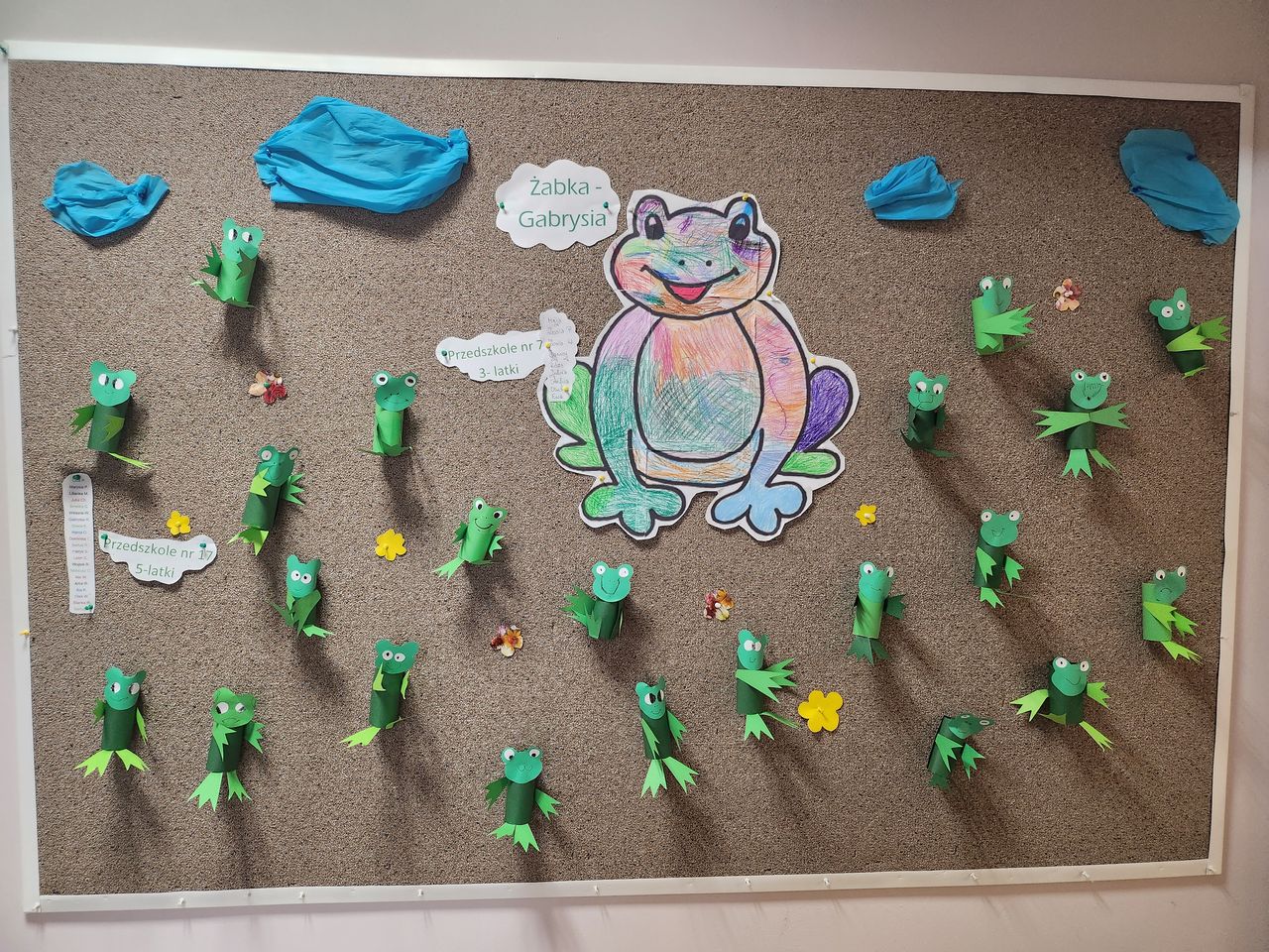 Wysłuchały bajeczki „O żabkach w czerwonych czapkach” H. Bechlerowej i obejrzały film edukacyjny, który przybliżył im ten rodzaj płazów. Dowiedziały się z niego wielu ciekawostek, m.in. że w krajach azjatyckich żaby są symbolem szczęścia i że potrafią skakać nawet do 3 m. Dodatkowo 4-latki z Przedszkola nr 7 pokolorowały dużego formatu żabkę Gabrysię, a 5-latki z Przedszkola nr 7 wykonały techniką 3D stado żabek, które zdobią Galerię Jedynki.