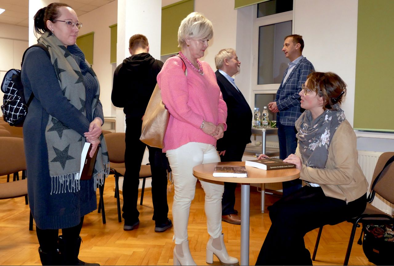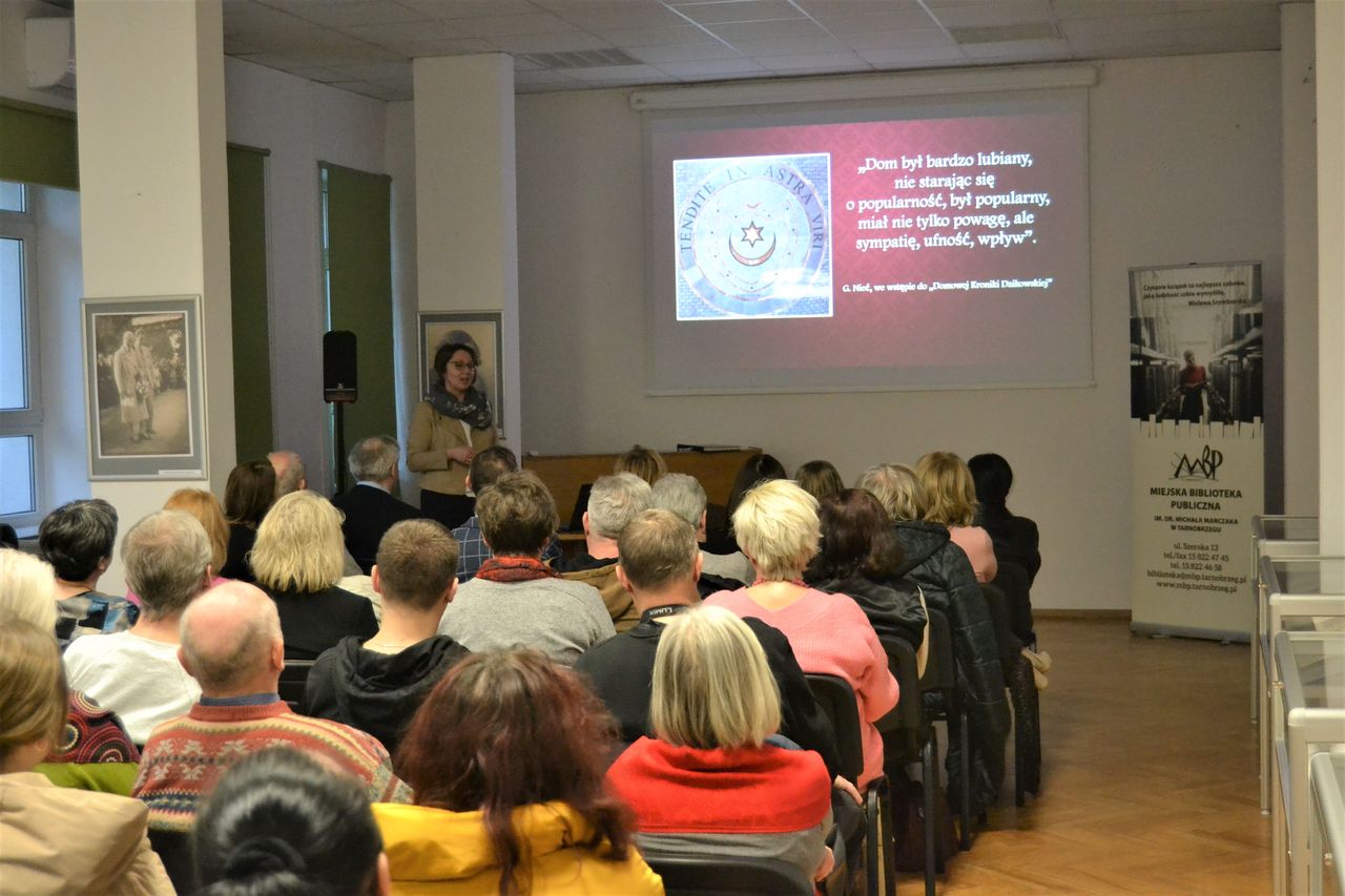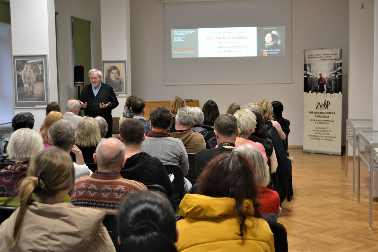 Licznie zebranym na spotkaniu uczestnikom Autorka przypomniała niezwykłą historię Dzikowa i nakreśliła wyjątkowe osobowości Pań Tarnowskich, wywodzących się ze znakomitych polskich rodów, między innymi Rozalii z Czackich, Gabrieli z Małachowskich, Zofii i Róży z Zamojskich. W oparciu o świetnie przygotowaną prezentację multimedialną Pani Monika przybliżyła rodzinne koligacje omawianych postaci. Szczególną uwagę zwróciły przedstawione unikatowe zdjęcia, które ukazały burzliwy bieg historii Dzikowa.