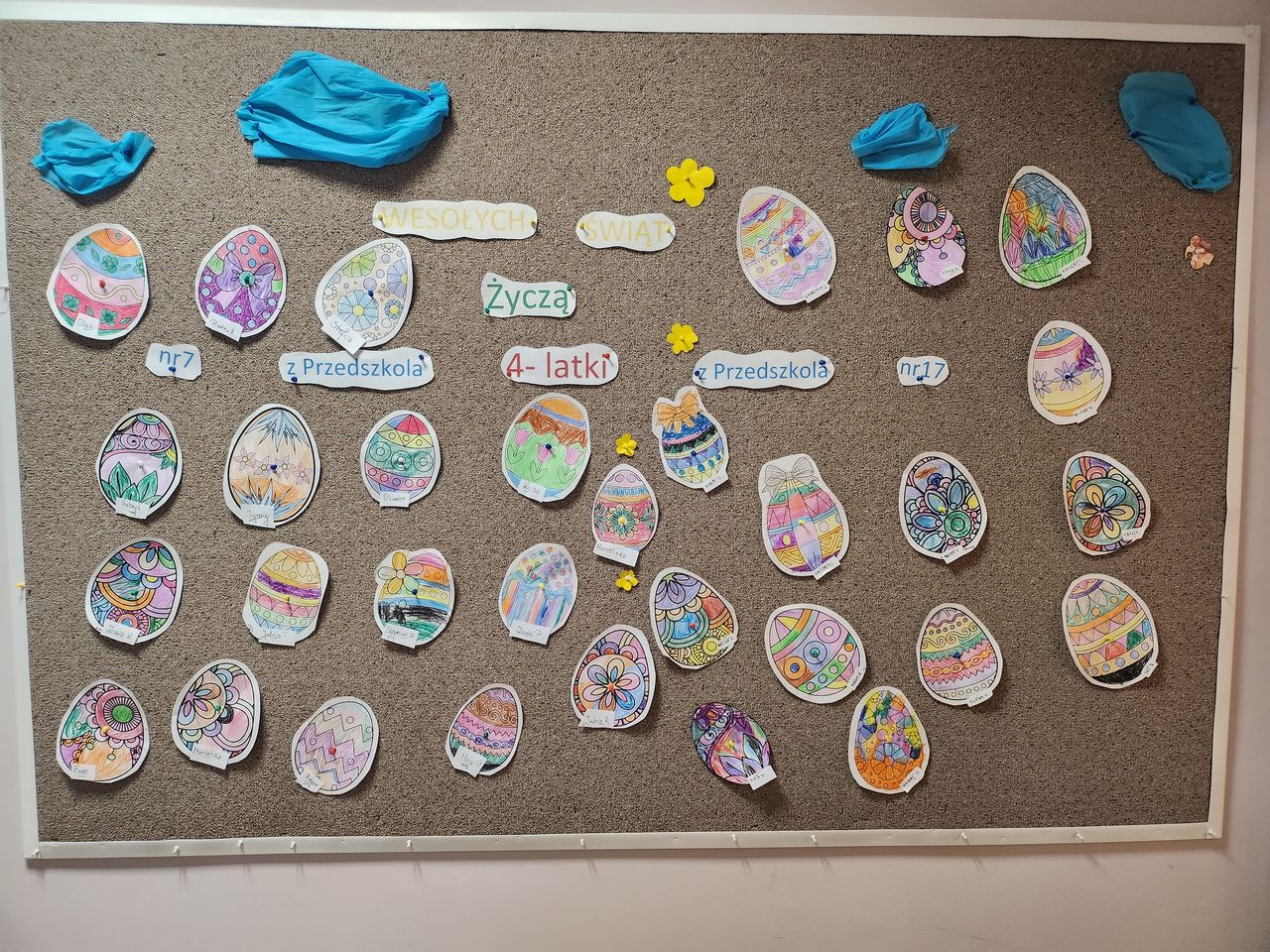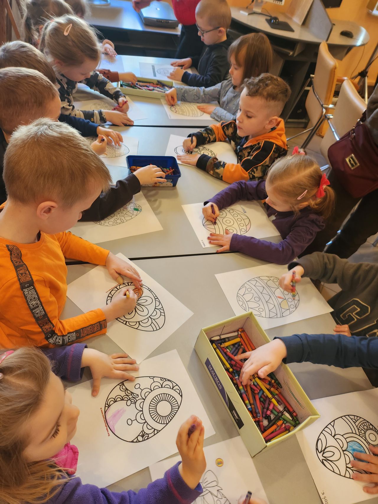 Przedszkolaki z zaciekawieniem wysłuchały opowiadań o świątecznej tematyce, m.in. „Wielkanocnej opowieści” E. Stadmüller, „Witaj, zajączku!” A. Baruzzi oraz „Wielkanocy” M. Strzałkowskiej. W ramach zabawy dzieci wykonały piękne prace plastyczne – kolorowe pisanki, które – tradycyjnie już – ozdobiły Galerię Jedynki.