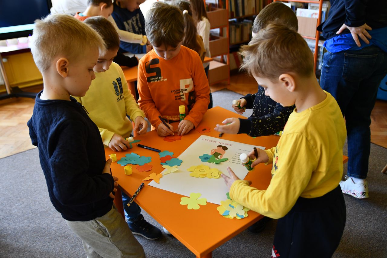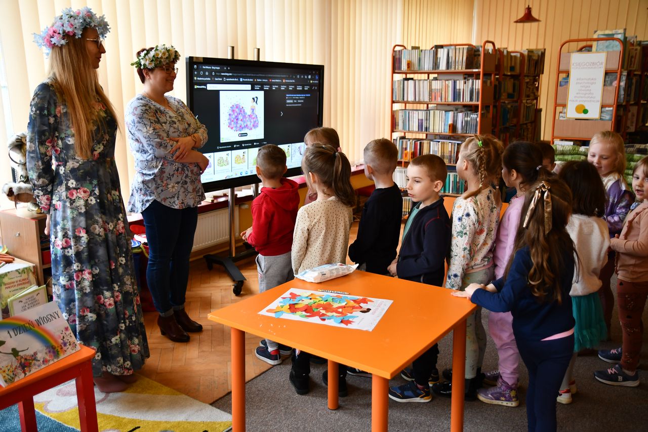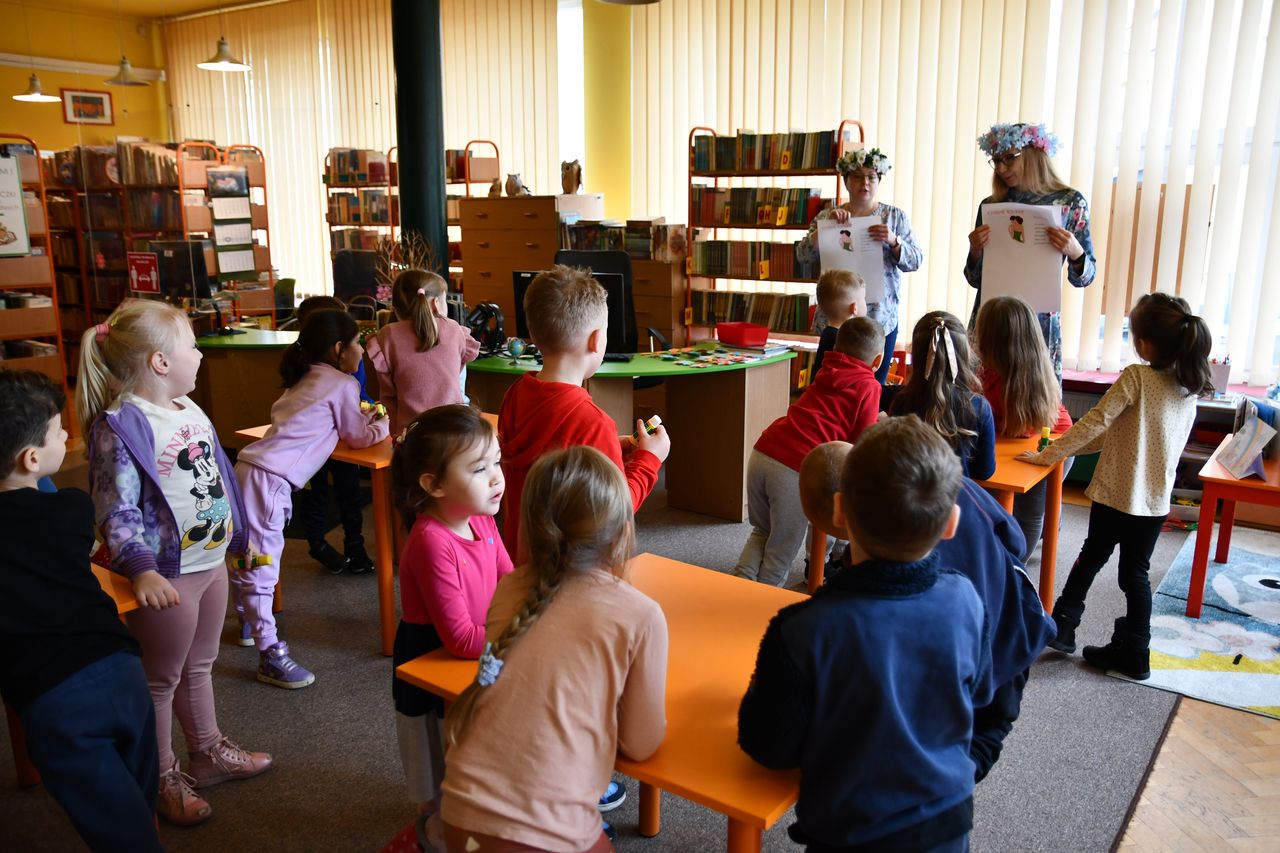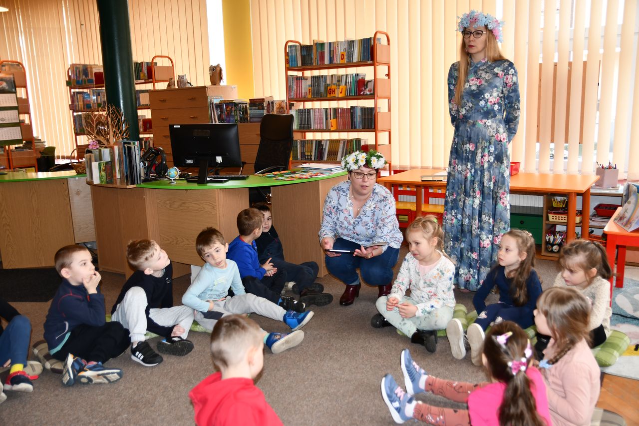 Wraz z pierwszym dniem Wiosny w Oddziale dla dzieci i młodzieży zrobiło się kolorowo i bajkowo. Przez cały tydzień do Biblioteki przychodziły przedszkolaki z Przedszkola „Bajka” by spotkać się z Panią Wiosną. Zarówno 4-latki, 5-latki, jak i 6-latki szukały symptomów wiosny na łące. Świetnie radziły sobie z rozszyfrowaniem nazw wiosennych kwiatów i zwierząt budzących się do życia właśnie wiosną.