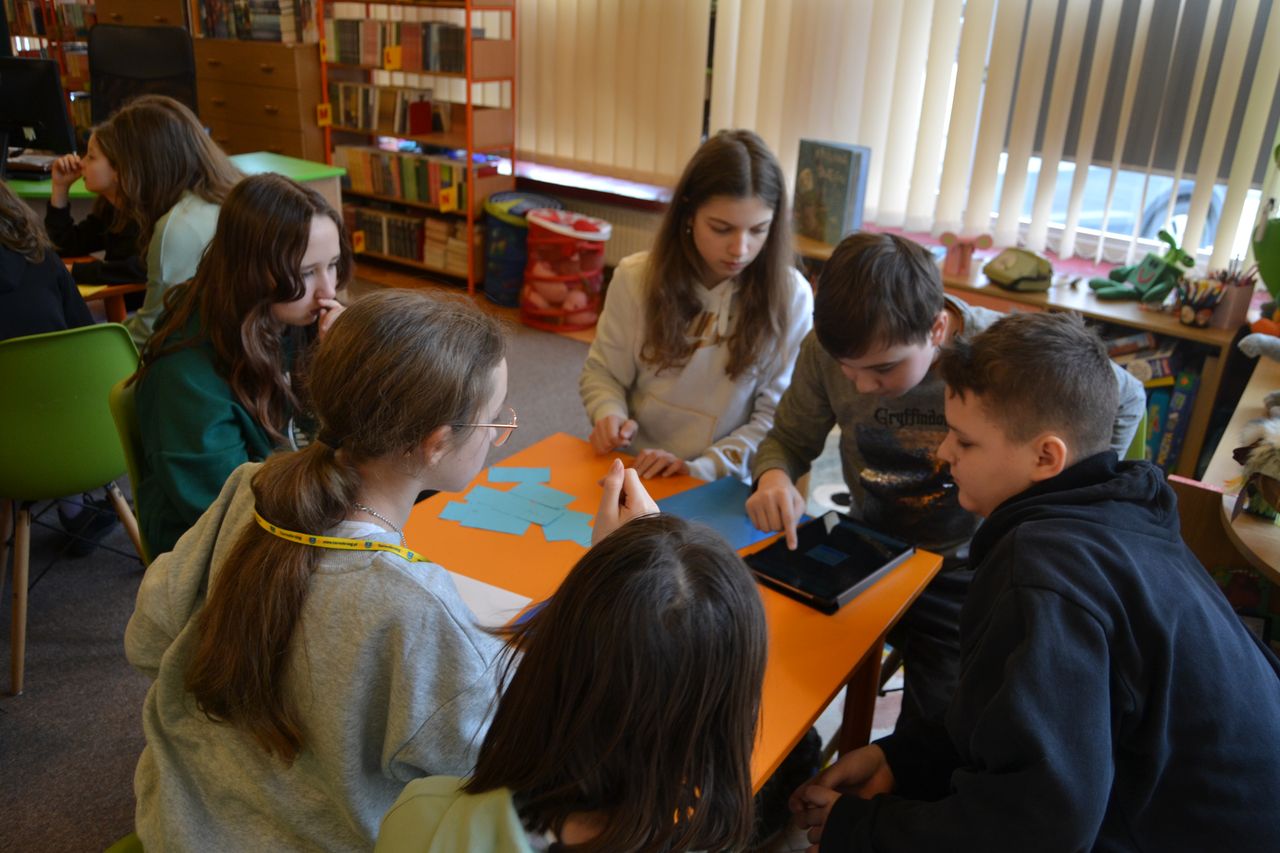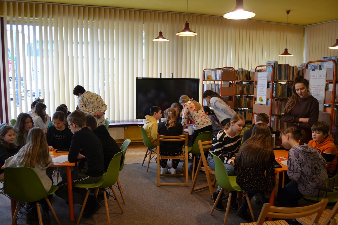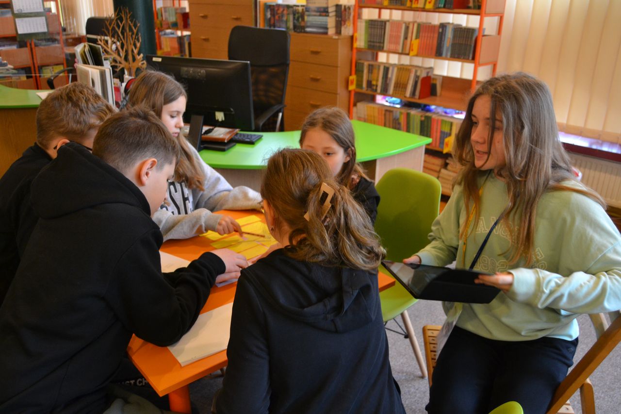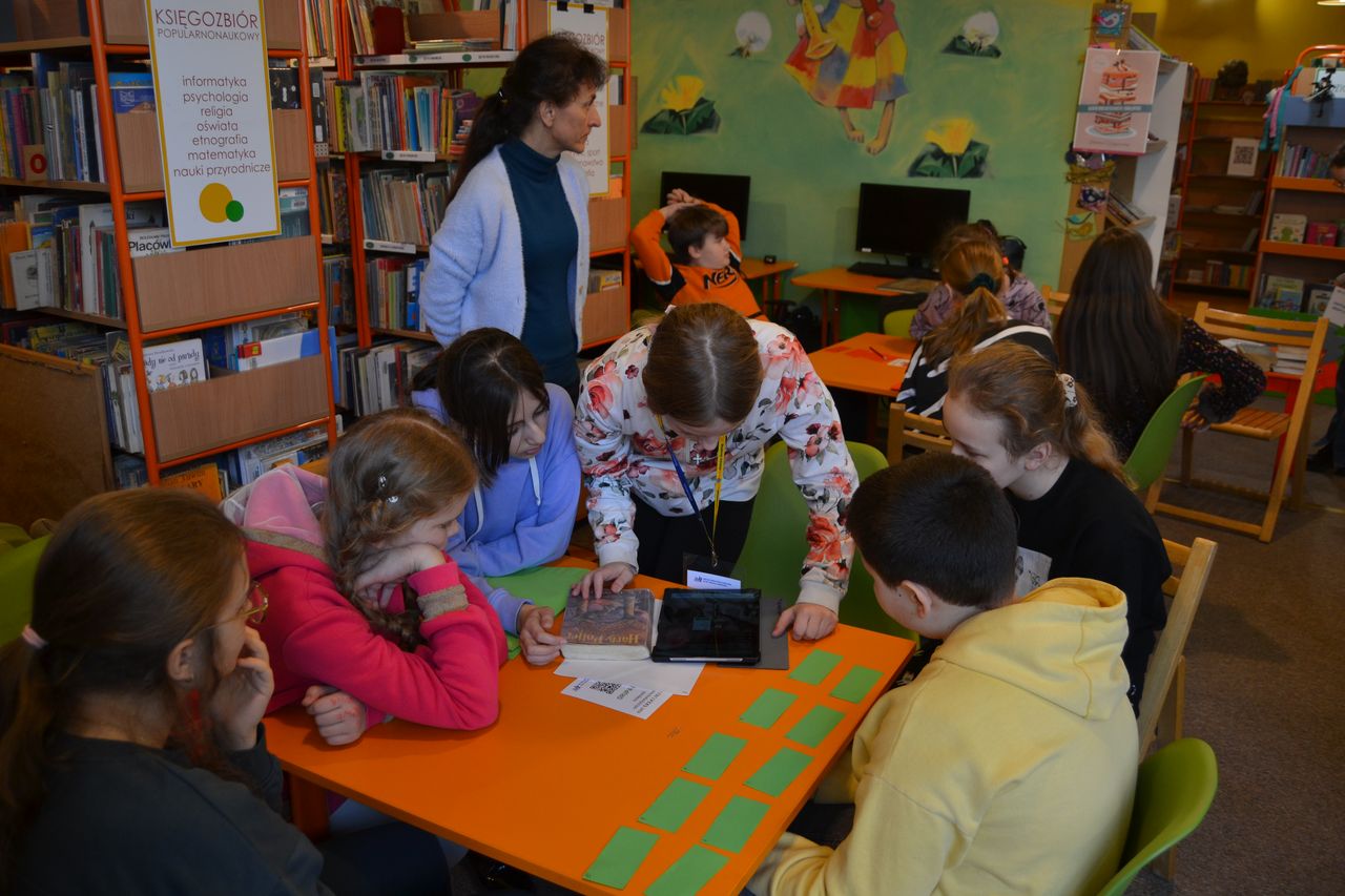 „Czytanie na ekranie” to tytuł lekcji edukacyjnej, przeprowadzonej 27 lutego, w której uczestniczyli uczniowie klasy V ze Szkoły Podstawowej nr 4. Porozkładane między regałami Oddziału dla dzieci i młodzieży QR kody – które młodzież skanowała tabletami – prowadziły przez kolejne zadania, dzięki którym należało odkryć i ułożyć końcowe hasło.