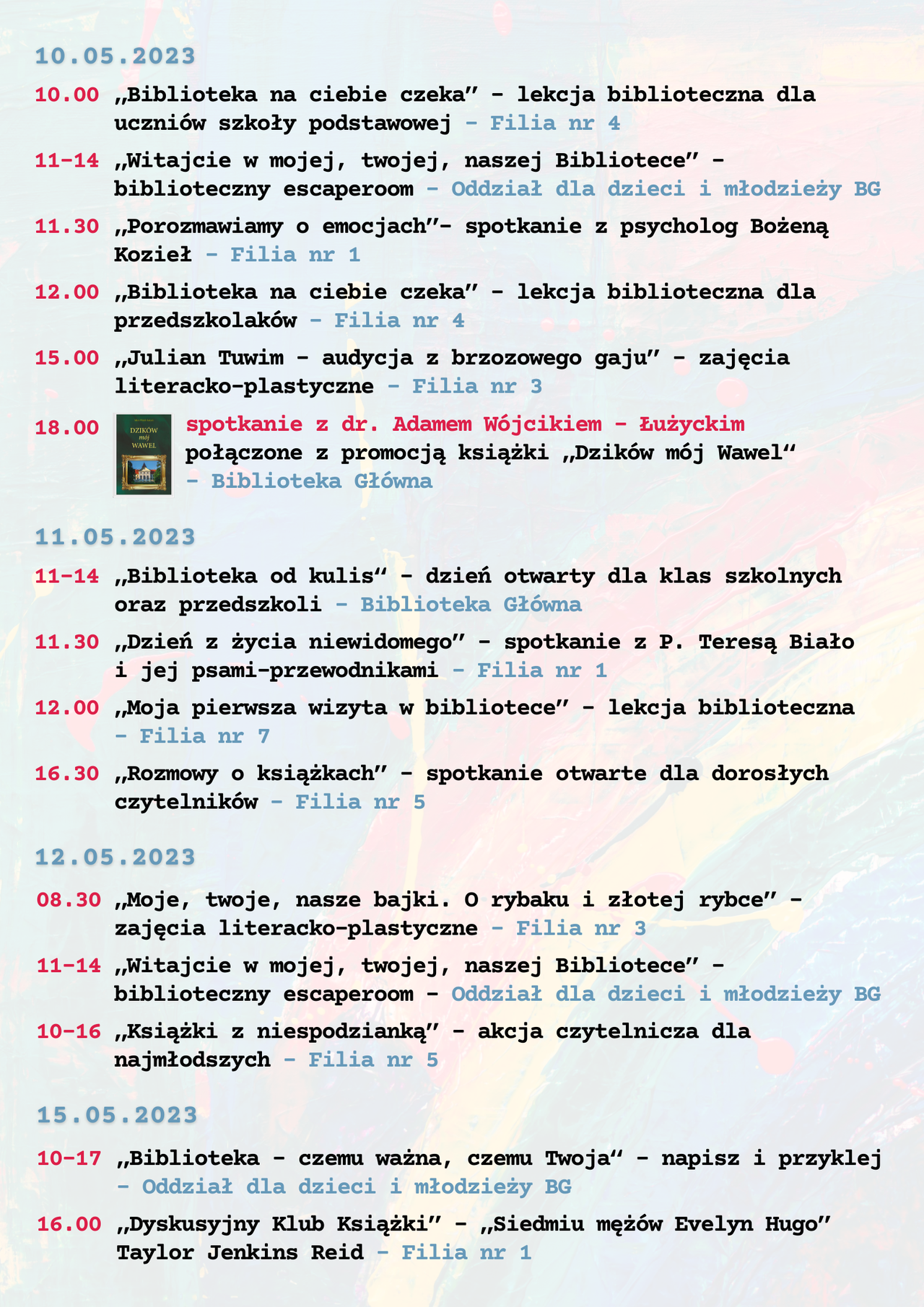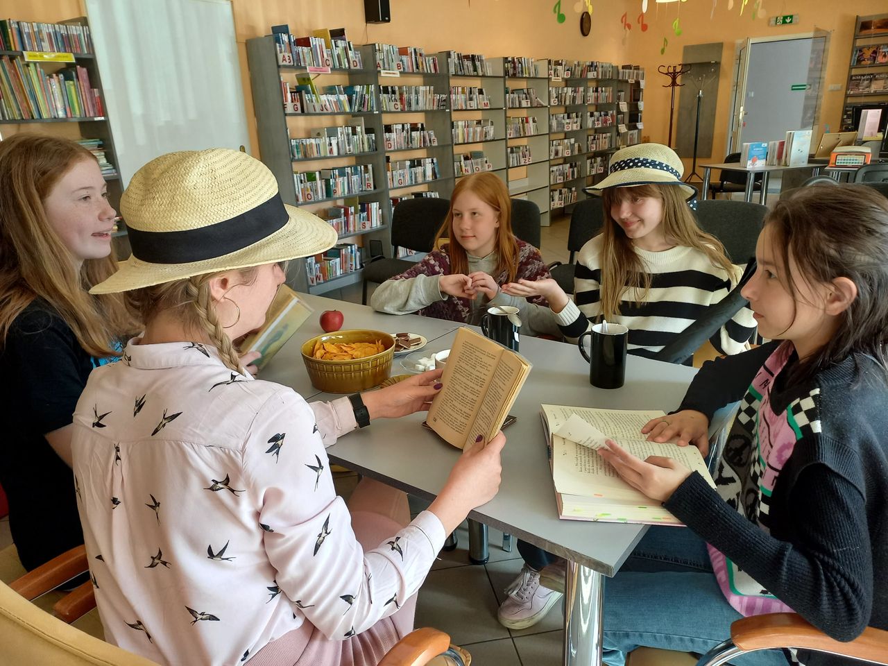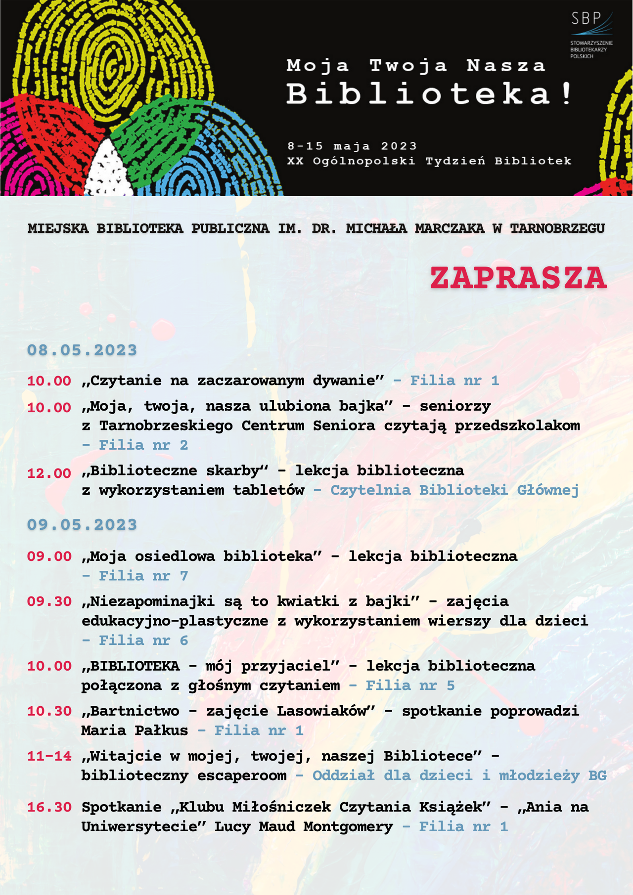 Wyjątkową ofertą były escaperoomy, skierowane do uczniów szkół podstawowych i średnich, które umożliwiły uczestnikom „przejście” przez wszystkie działy Biblioteki i poznanie pracowników, którzy zazwyczaj bywają mniej widoczni dla Użytkowników, wszak biblioteka to nie tylko agendy udostepniające księgozbiór, ale także wiele działów, które czuwają nad prawidłowym jej funkcjonowaniem. Z kolei młodsze grupy, miały niecodzienną okazję by zwiedzić całą bibliotekę i zajrzeć w miejsca, gdzie wstęp mają jedynie pracownicy. Aby przybliżyć zasady funkcjonowania biblioteki i zapoznać dzieci z jej księgozbiorem zorganizowano szereg lekcji bibliotecznych, podczas których uczestnicy dowiedzieli się, co zrobić by zostać Użytkownikiem biblioteki i jak z niej korzystać. Część księgozbioru udało się poznać dzięki spotkaniom z książką, w ramach których odbywały się nie tylko głośne czytania, zajęcia literacko-plastyczne, literacko-edukacyjne, ale również spotkanie Miłośniczek Czytania Książek, na którym omawiano „Anię na Uniwersytecie” L.M. Montgomery, spotkanie Dyskusyjnego Klubu Książkowego, którego tematem przewodnim była książka pt. „Siedmiu mężów Evelyn Hugo” T. J. Reid oraz „Rozmowy o książkach”, gdzie rozmawiano o „Moim skradzionym życiu” R. Villancher.