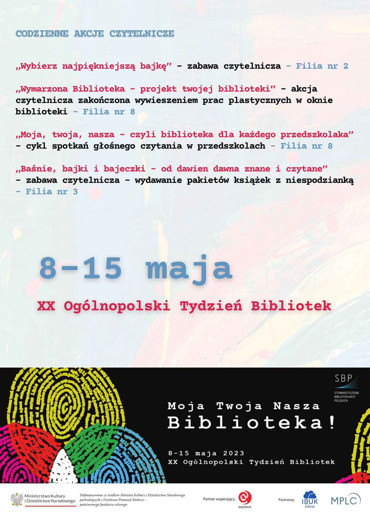 Hasło tegorocznej, XX już edycji, Ogólnopolskiego Tygodnia Bibliotek „Moja, Twoja, Nasza – Biblioteka” miało na celu podkreślenie społecznego charakteru instytucji, otwartej na potrzeby społeczności zarówno jako grupy, jak i każdej indywidualnej osoby. Dlatego też, zróżnicowane formy przygotowane w tym roku skupiły się na pokazaniu biblioteki z nieco innej, niewidocznej na co dzień strony, ale także na zaprezentowaniu jej jako miejsca, które jest wspólnym „dobrem” przynależącym do wszystkich.