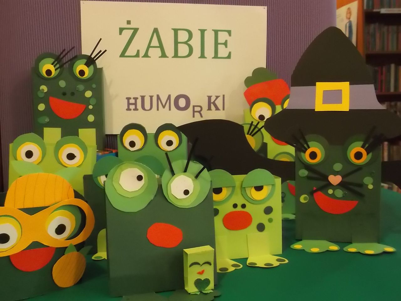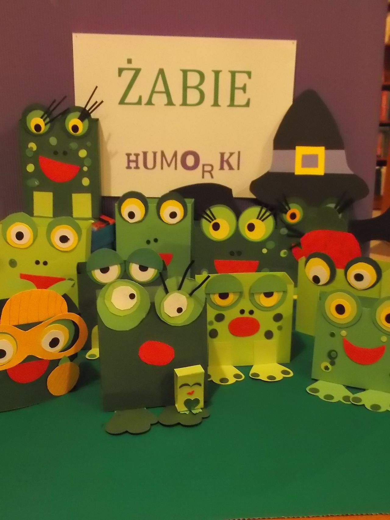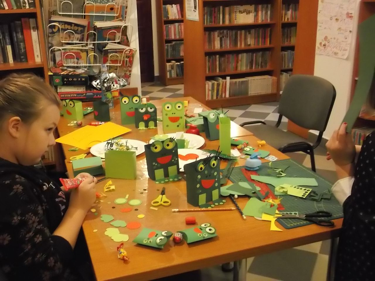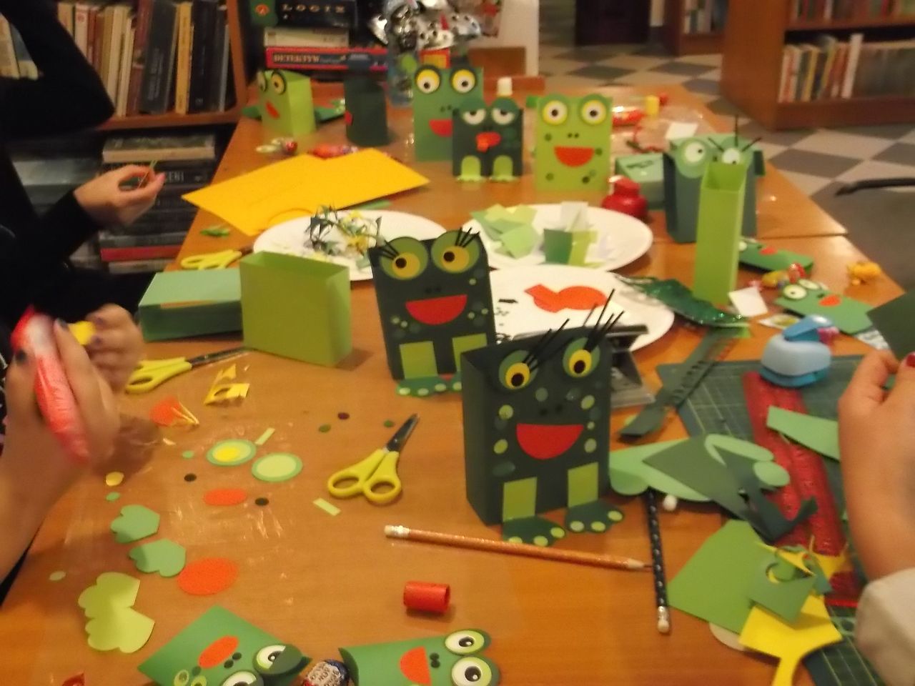 Podczas spotkania wszystkim dopisywały dobre humorki, dlatego też powstały wyłącznie zadowolone i uśmiechnięte żabki, które przycupnęły na bibliotecznej wystawce i przez kolejne dni poprawiały również nastrój czytelnikom wypożyczającym książki.