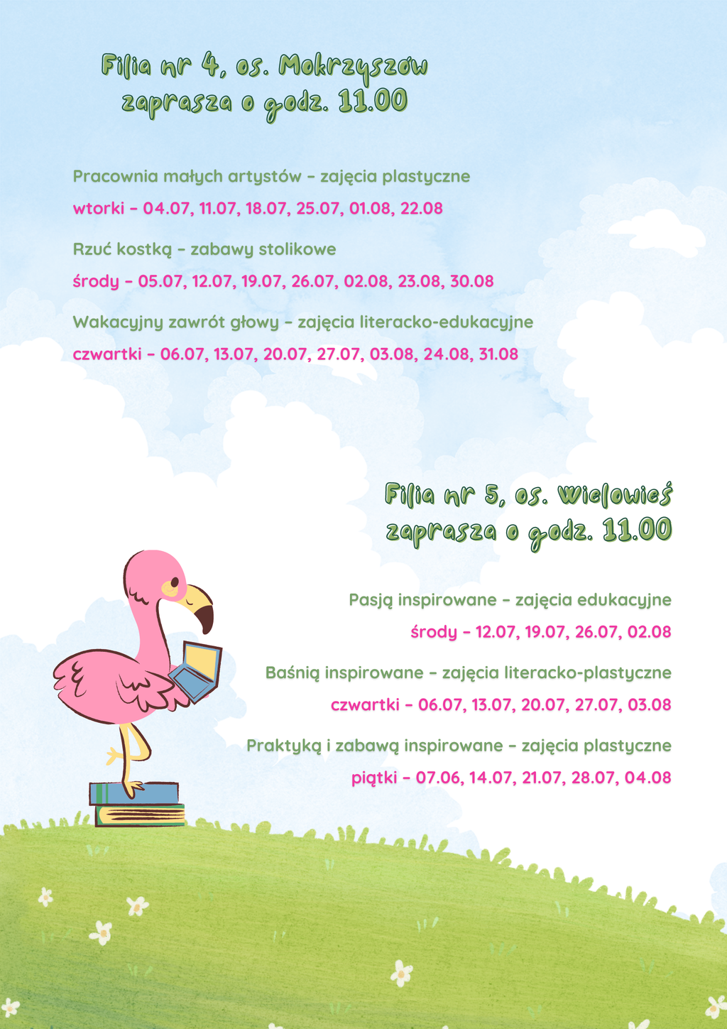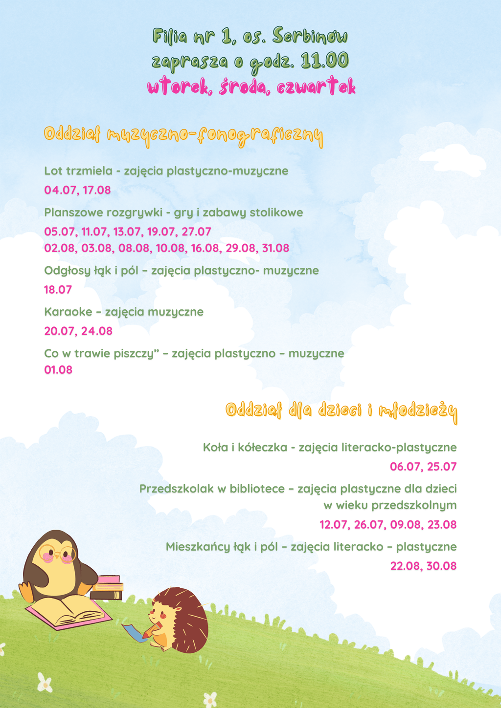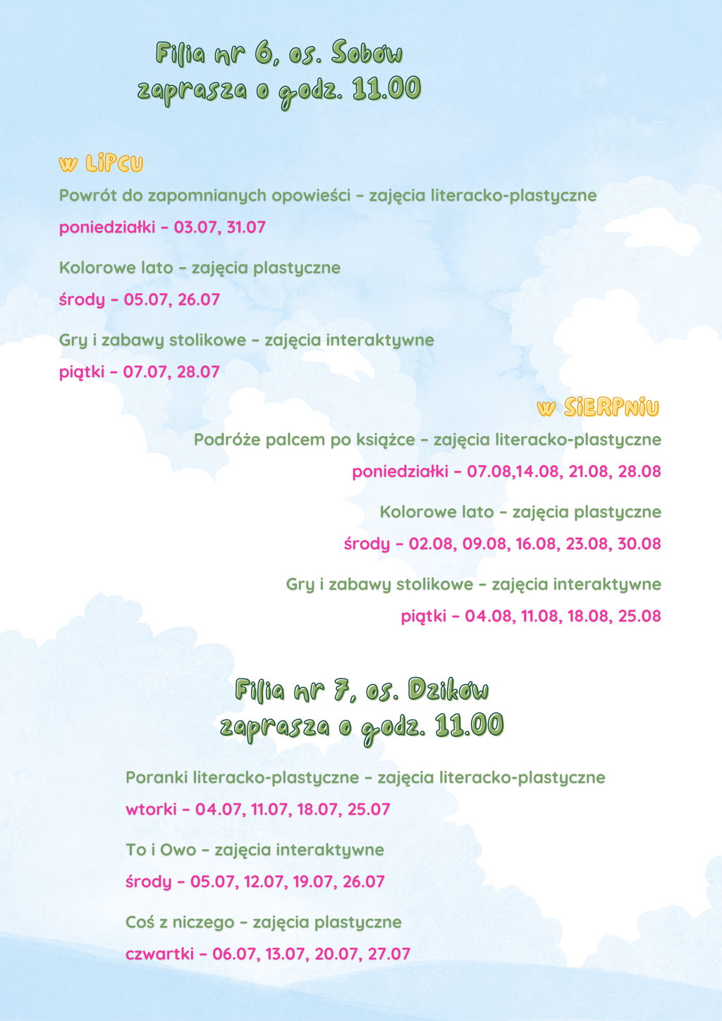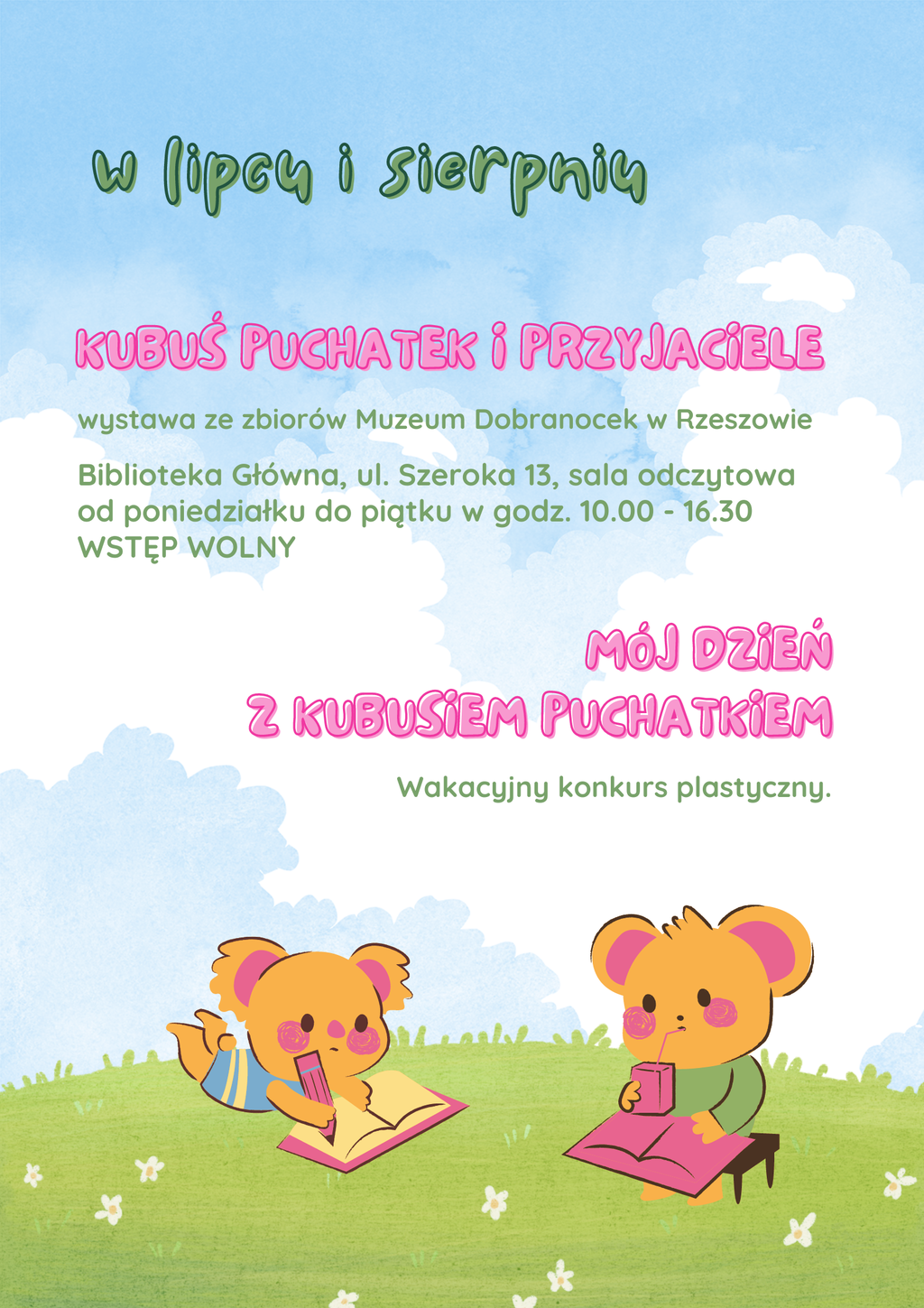 Letnie formy urozmaici, czynna przez całe wakacje, wystawa pt. Kubuś Puchatek i przyjaciele” a także trwający od lipca do 15go sierpnia konkurs plastyczny „Mój dzień z Kubusiem Puchatkiem”. Konkurs adresowany jest do dzieci w wieku 6 - 9 lat. Prace można składać w Bibliotece Głównej oraz każdej filii bibliotecznej. Regulamin oraz karta zgłoszenia dostępna będzie już wkrótce na stronie Biblioteki: www.mbp.tarnobrzeg.pl w zakładce Konkursy.