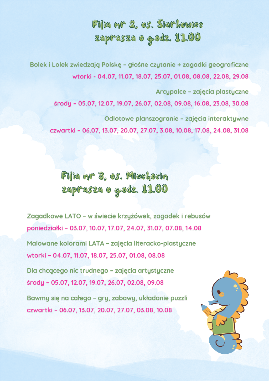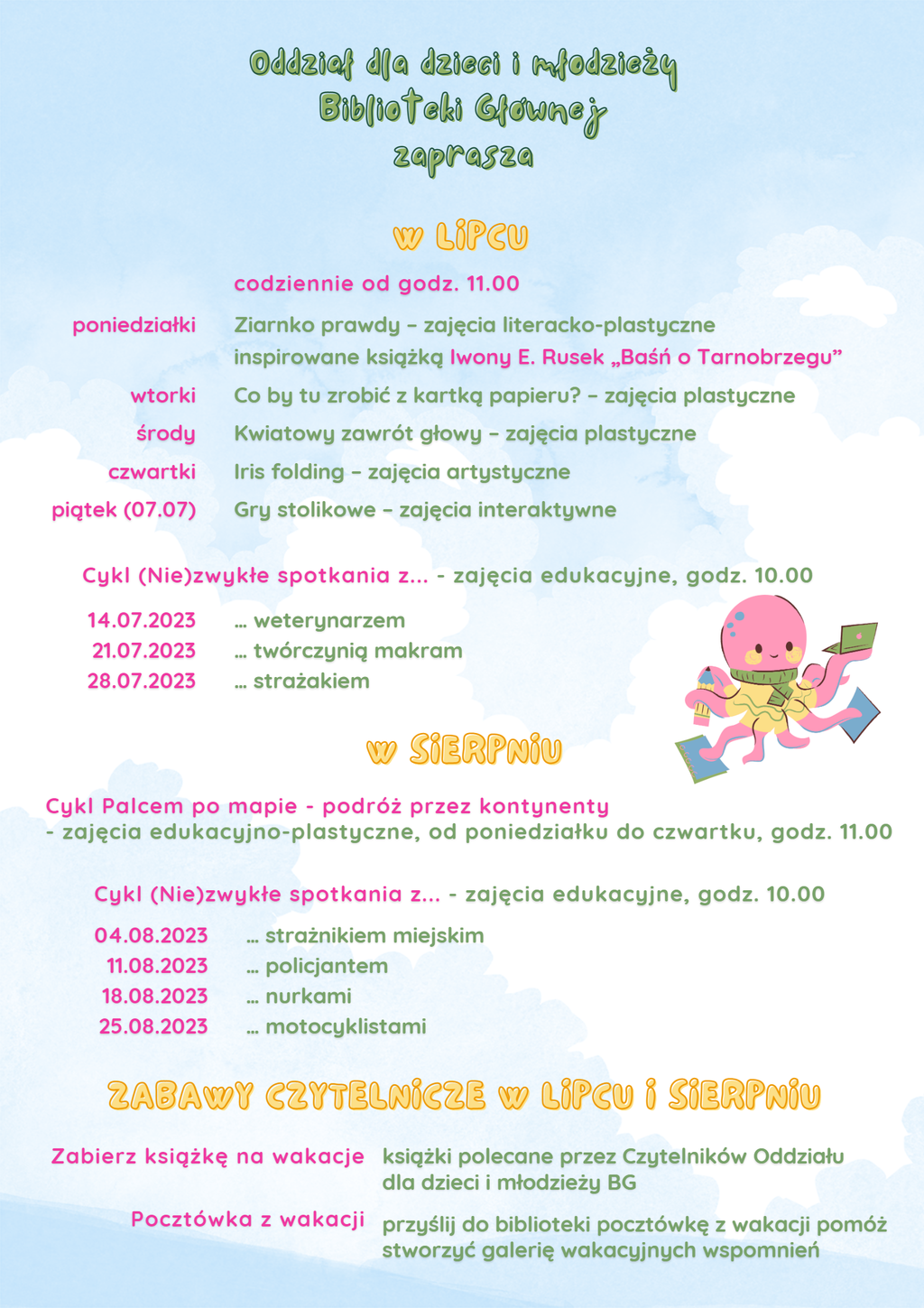Podczas spotkań głośnego czytania, zajęć literacko-plastycznych, literacko-edukacyjnych uczestnicy poznają bohaterów „Baśni o Tarnobrzegu” Iwony Rusek i wspólnie stworzą makietę Puszczy Sandomierskiej. Dowiedzą się jacy są „Mieszkańcy łąk i pól” i co zrobić z „Koła i kółeczka”. Razem z Bolkiem i Lolkiem będą zwiedzać Polskę oraz tworzyć opowieści „Malowane kolorami Lata”. Powstaną prace „Baśnią inspirowane” oraz przyprawiające o „Wakacyjny zawrót głowy”. Uda się także cofnąć w czasie dzięki „Powrotom do zapomnianych opowieści” oraz „Podróżom palcem po książce”. Na tych, którzy lubią rozpocząć dzień z książką czekają „Poranki literacko-plastyczne”, jak również „Lipcowe czytanki” i „Sierpniowe czytanki”. Zajęcia plastyczne i artystyczne – oprócz tego, że pobudzają wyobraźnię i kreatywność, uruchamiają także palce i ręce. Uczestnicy będą się zastanawiać „Co by tu zrobić z kartką papieru?”, co stworzyć w „Pracowni małych artystów”, jak zrobić „Coś z niczego”, co się kryje pod nazwą „Arcypalce” i „Iris folding”. Przekonają się także, że „Dla chcącego nic trudnego”, jak wygląda „Kwiatowy zawrót głowy” oraz, co powstanie, gdy jest „Praktyką i zabawą inspirowane”. Zajęcia zabiorą także w podróż przez kontynenty. Mali artyści i poszukiwacze przygód „zwiedzą” Europę, Amerykę Północną i Południową, Azję i Afrykę. Miłośnicy muzyki, w trakcie zajęć plastyczno-muzycznych, poznają „Odgłosy łąk i pól” i dźwięki „Lotu trzmiela”. Dodatkowo, karaoke pozwoli wejść do zaczarowanego świata muzyki popularnej i rozrywkowej. Szereg zajęć edukacyjnych i interaktywnych połączy przyjemne z pożytecznym czyli – zdobywanie wiedzy, przyjemne spędzanie czasu oraz gimnastykę umysłu. Będzie „Odlotowe planszogranie”, „Zagadkowe lato” i „Kolorowe lato”. Będzie „To i Owo” i „Gry stolikowe”. Będzie można „Bawić się na całego”, „Rzucać kostką” czy „Zainspirować się pasją”. Jednym słowem spędzić aktywnie dzień z grami planszowymi, krzyżówkami, sudoku, rebusami, quizami, zagadkami, puzzlami. Ponadto, mali podróżnicy będą mogli przysyłać do Biblioteki pocztówki z wakacyjnych wojaży i przyczynić się w ten sposób do stworzenia galerii wakacyjnych wspomnień. Z kolei każdy, kto przeczyta ciekawą książkę będzie mógł napisać jej recenzję by pomóc innym w wyborze „Jaką lekturę zabrać na wakacje?”.